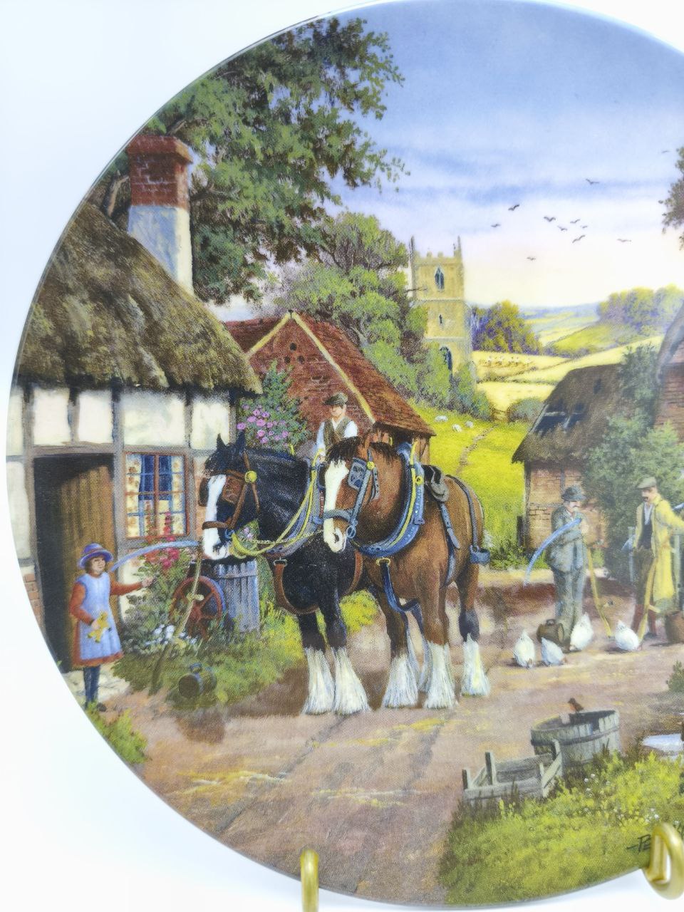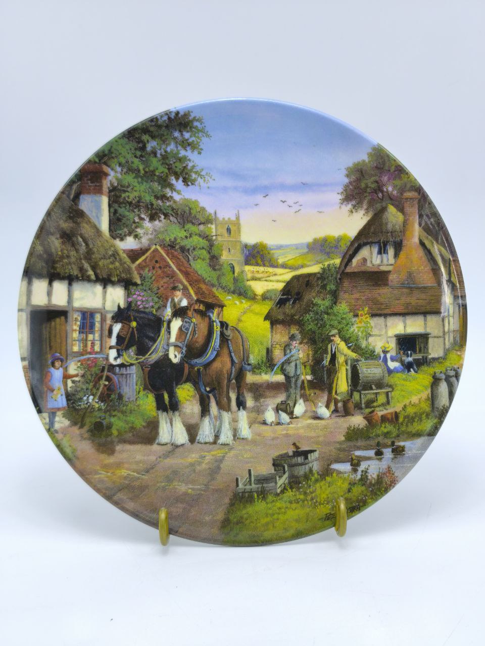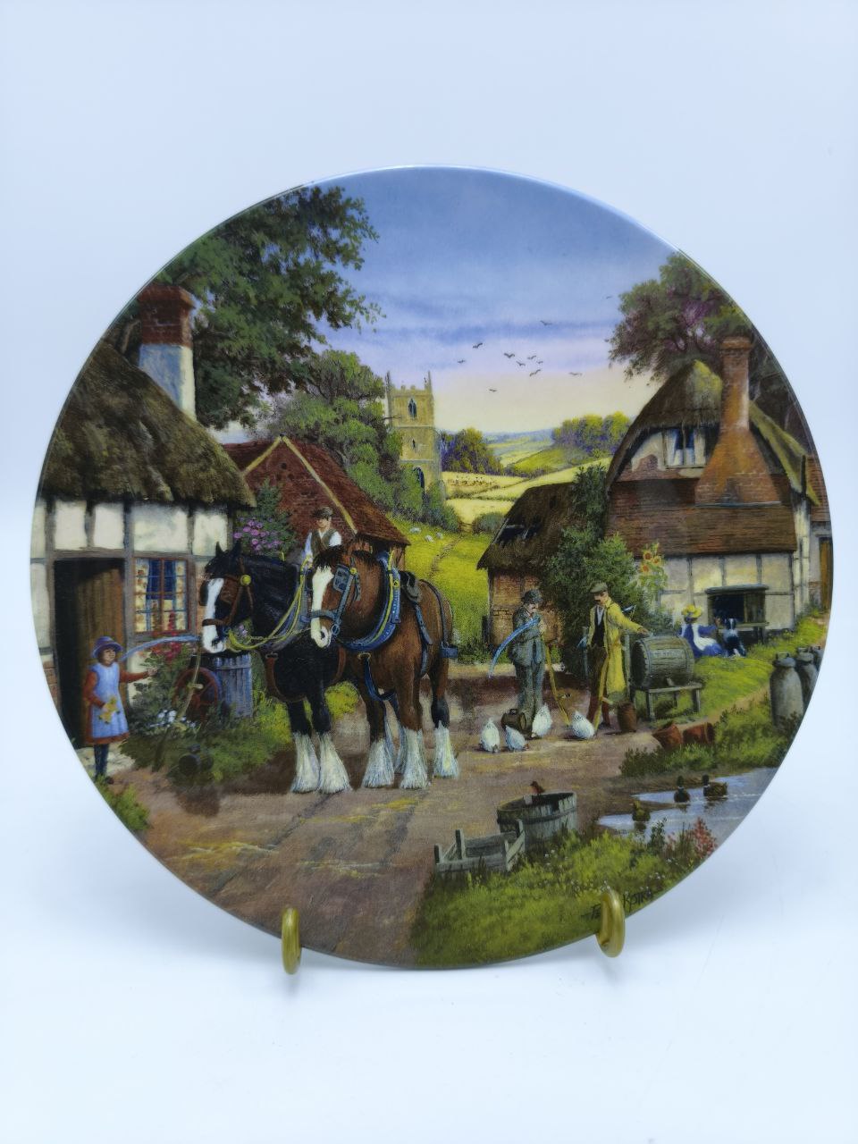 Декоративная фарфоровая тарелка «Сельский пейзаж у пруда». Эта изысканная фарфоровая тарелка — воплощение утонченной красоты и неподдельной деревенской идиллии. Она изображает уютный уголок старинной английской деревни, который буквально оживает перед вами благодаря тонкости работы художника. Сцена дополняется яркими деталями: крытые соломой дома, ухоженный сад, неспешно шагающие тяжелые лошади, пастушок со стадом и тихий пруд — все это создаёт атмосферу тепла и спокойствия. Тарелка выполнена из высокого фарфора, который отличается совершенством качества и долговечностью. Изделие с аккуратной глянцевой поверхностью прекрасно сохраняет нанесенные на него краски, делая их устойчивыми к потускнению. Фарфор сохраняет цветовую глубину и яркость рисунка, что делает тарелку настоящим предметом коллекционного искусства.Элегантное украшение интерьера. Фарфоровая тарелка «Сельский пейзаж у пруда» станет великолепным дополнением для вашего интерьера. Она идеально подойдет для украшения кухни, гостиной или столовой. Может быть размещена на стене или на декоративной подставке — в любом случае она привлечет внимание и станет ярким акцентом пространства. Тарелка наполнена атмосферой размеренной жизни простого деревенского быта. Крытые соломой дома, заботливо обустроенный дворик с тропинками, спокойный пруд с плавающими утками и величественная церковь на фоне слегка холмистого ландшафта — каждая деталь изображена с трогательной любовью к сельской природе. Это не просто предмет декора — это история, наполненная умиротворением и теплотой. Тарелка станет замечательным подарком для коллекционеров декоративного фарфора или любителей сельских мотивов. Она передает идеальный баланс между художественным мастерством и функциональной ценностью. Благодаря качественному исполнению и универсальности сюжета, эта тарелка будет высоко оценена даже самыми требовательными получателями. Несите в дом тепло и гармонию деревенского быта с этой великолепной фарфоровой тарелкой «Сельский пейзаж у пруда». Она станет источником вдохновения, спокойствия и эстетического наслаждения на долгие годы!