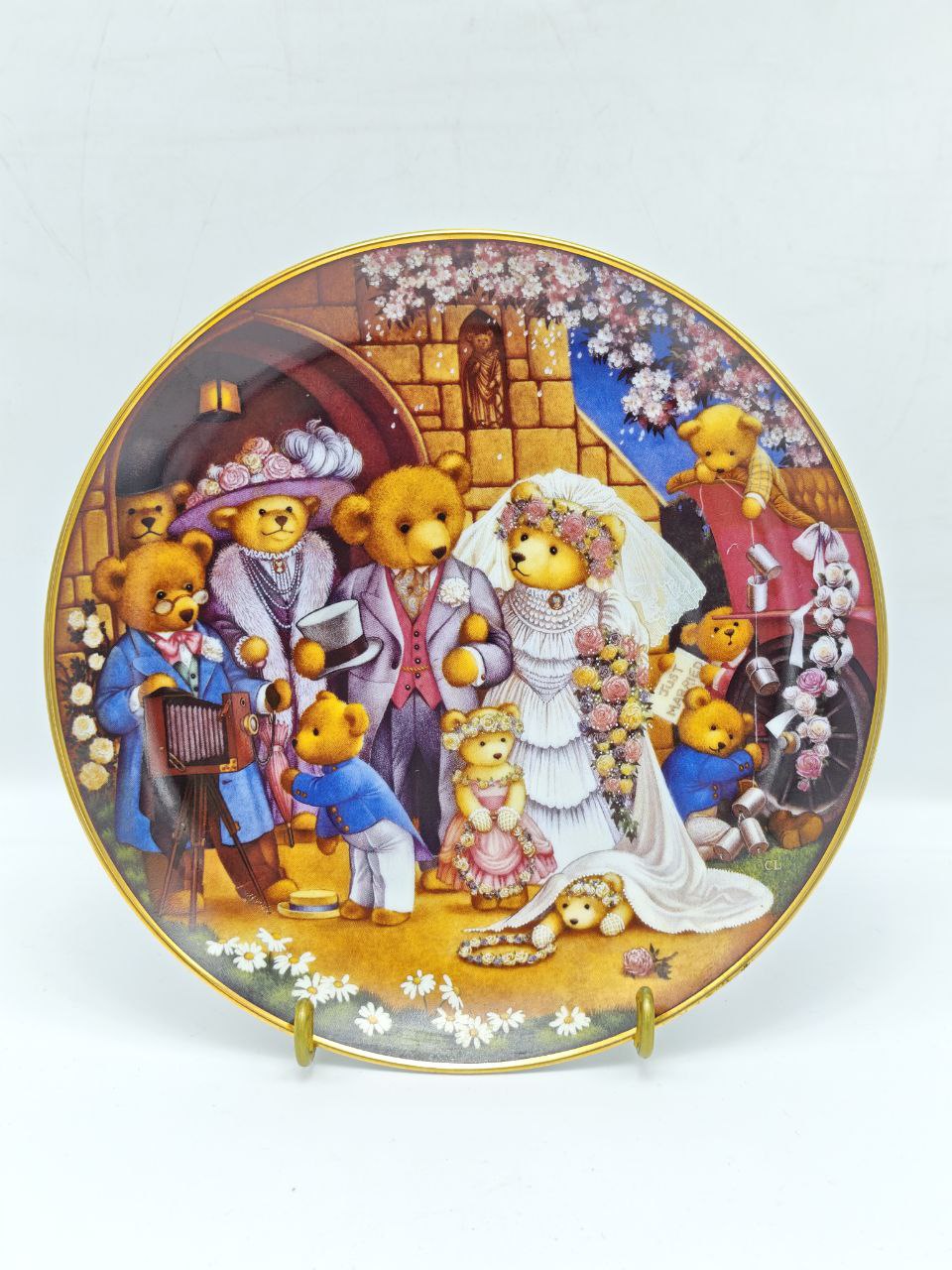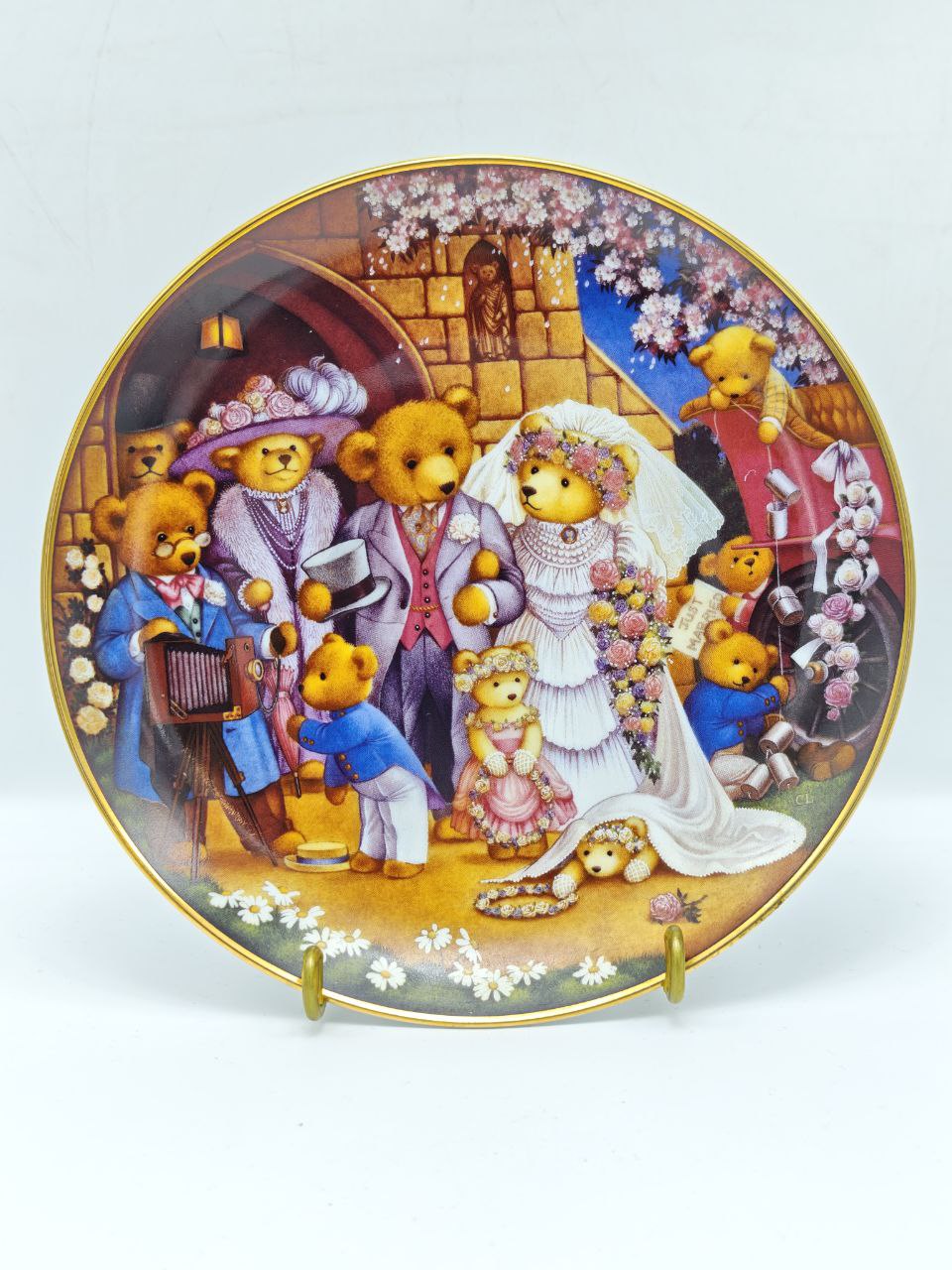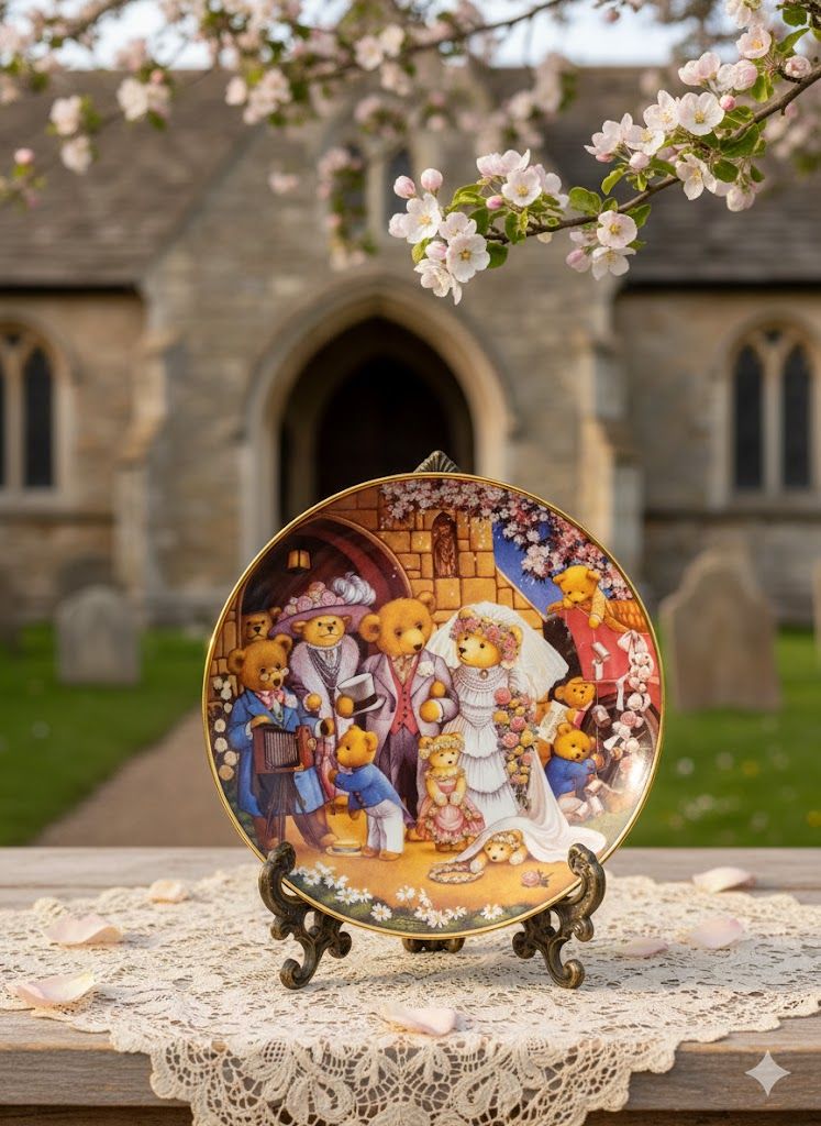 Редкая коллекционная фарфоровая тарелка из лимитированной серии Teddy Bear Wedding, созданная художницей Carol Lawson специально для Franklin Mint. Нежная свадебная сценка с медвежьей семьёй выполнена в фирменной технике деколи с тонкой ручной проработкой деталей. Позолоченный кант подчеркивает статус и коллекционную ценность изделия. Такая тарелка станет ярким акцентом в интерьере, а также прекрасным подарком коллекционеру декоративного фарфора.