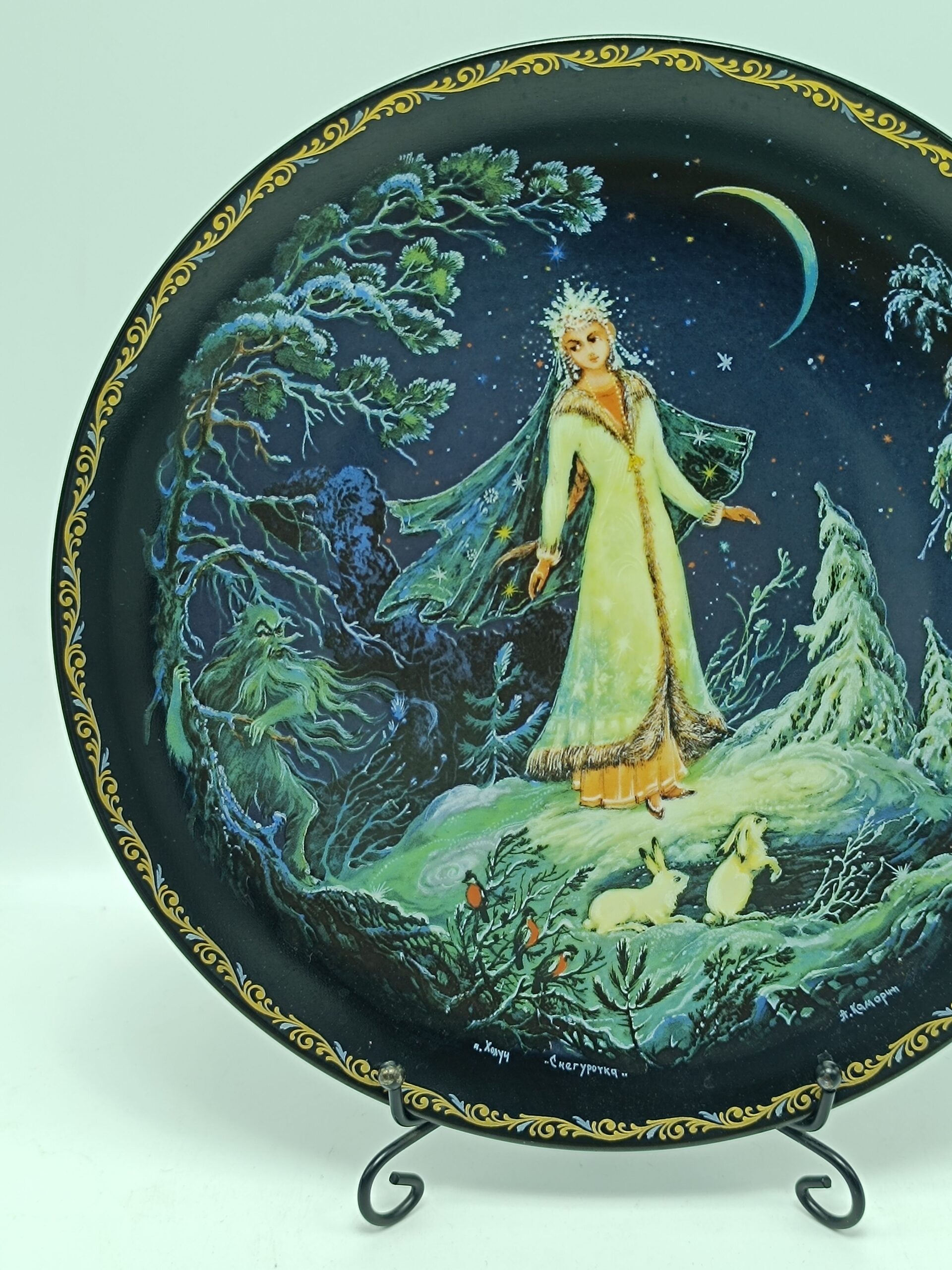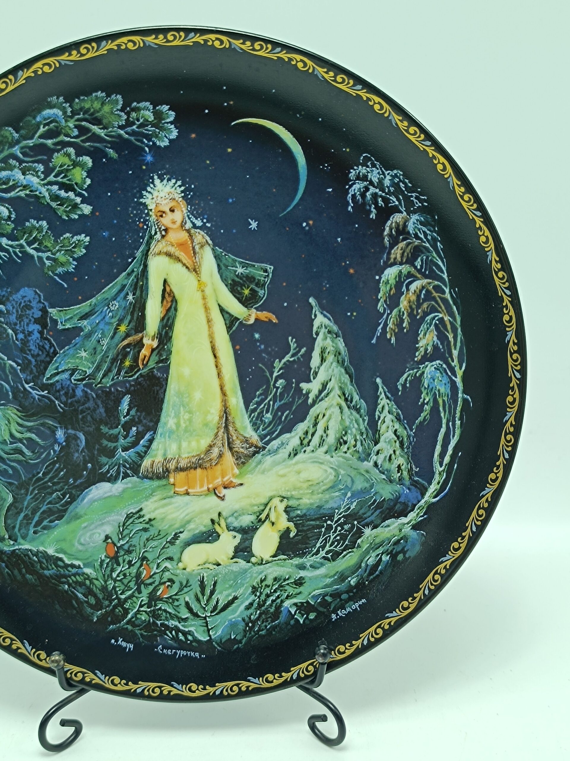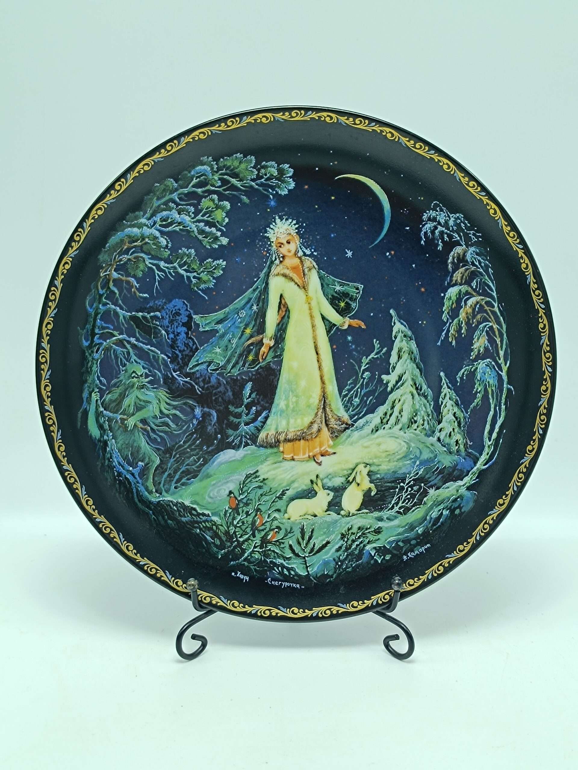 Декоративная коллекционная фарфоровая тарелка «Снегурочка» из серии «Сказка О Снегурочке». выполнена художником Анатолием Камориным по мотивам русской детской сказки в традициях Холуйской Миниатюры. СССР 1989 год.