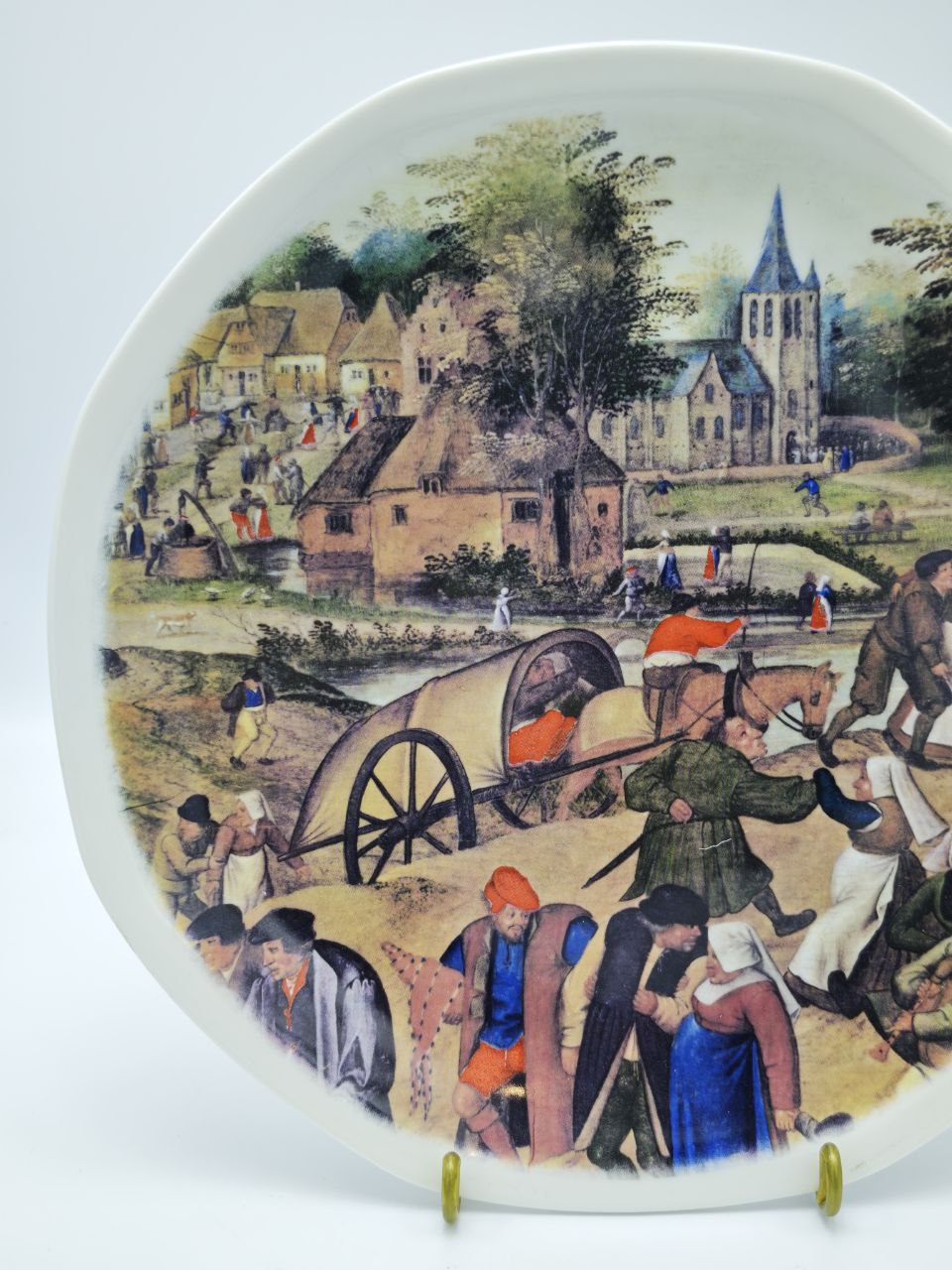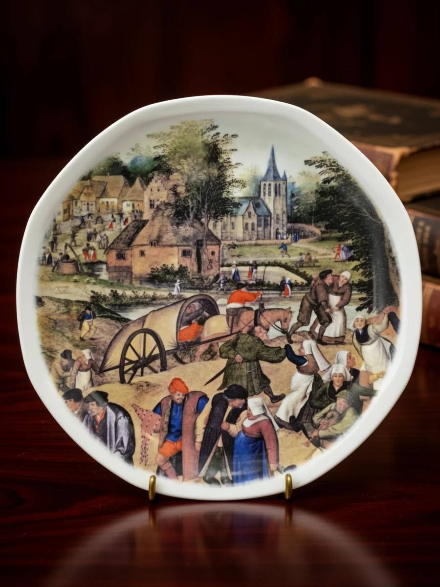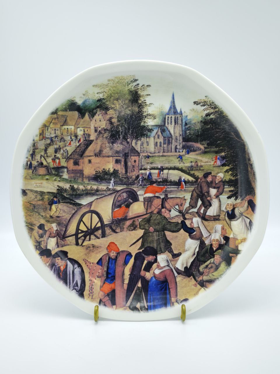 На тарелке изображена оживлённая сцена из средневековой деревенской жизни: крестьяне в традиционных костюмах, запряжённая лошадьми повозка, старинные дома и церковь на заднем плане. Многофигурная композиция передаёт дух эпохи и мастерство Брейгеля в изображении повседневной жизни.