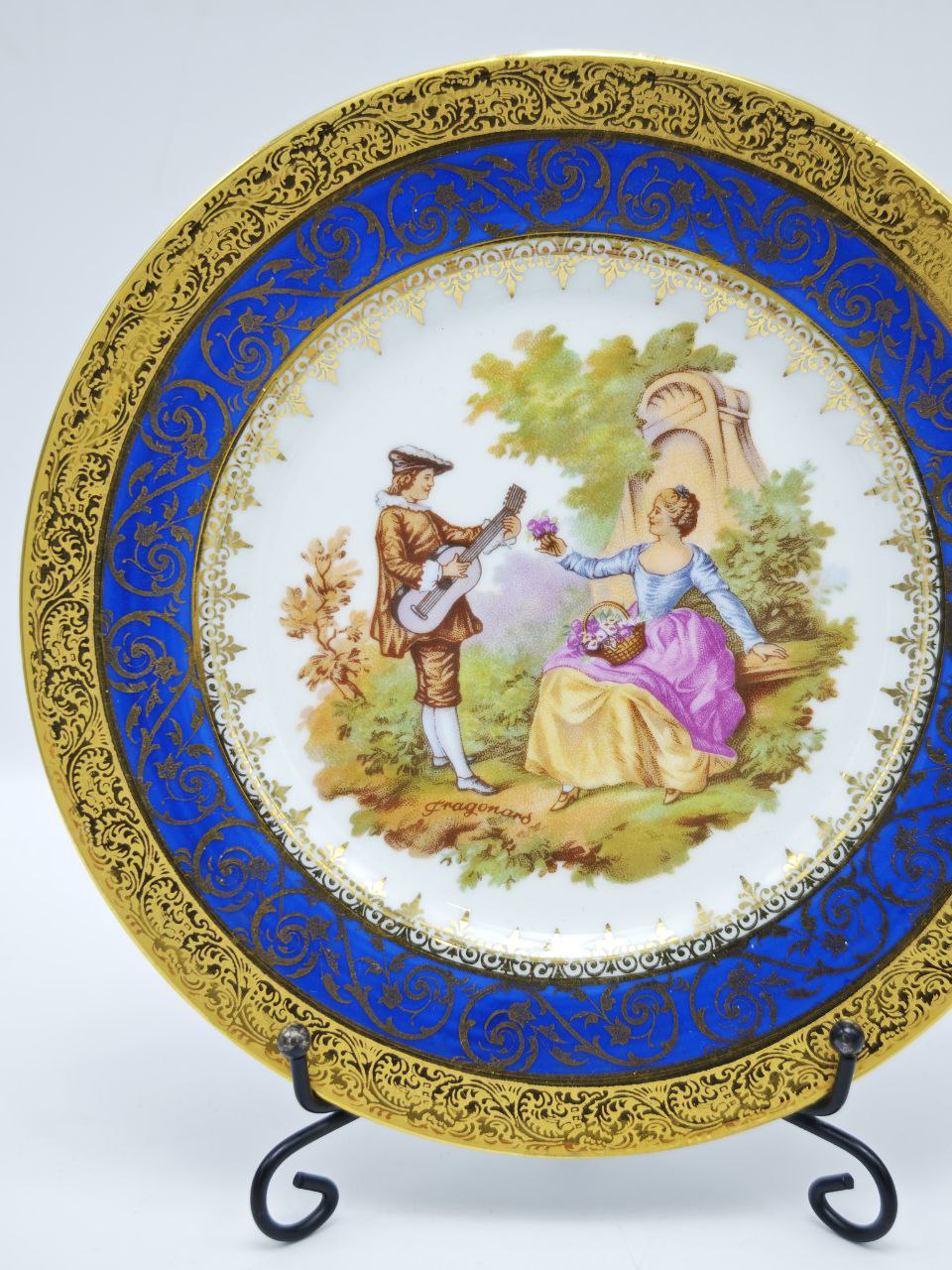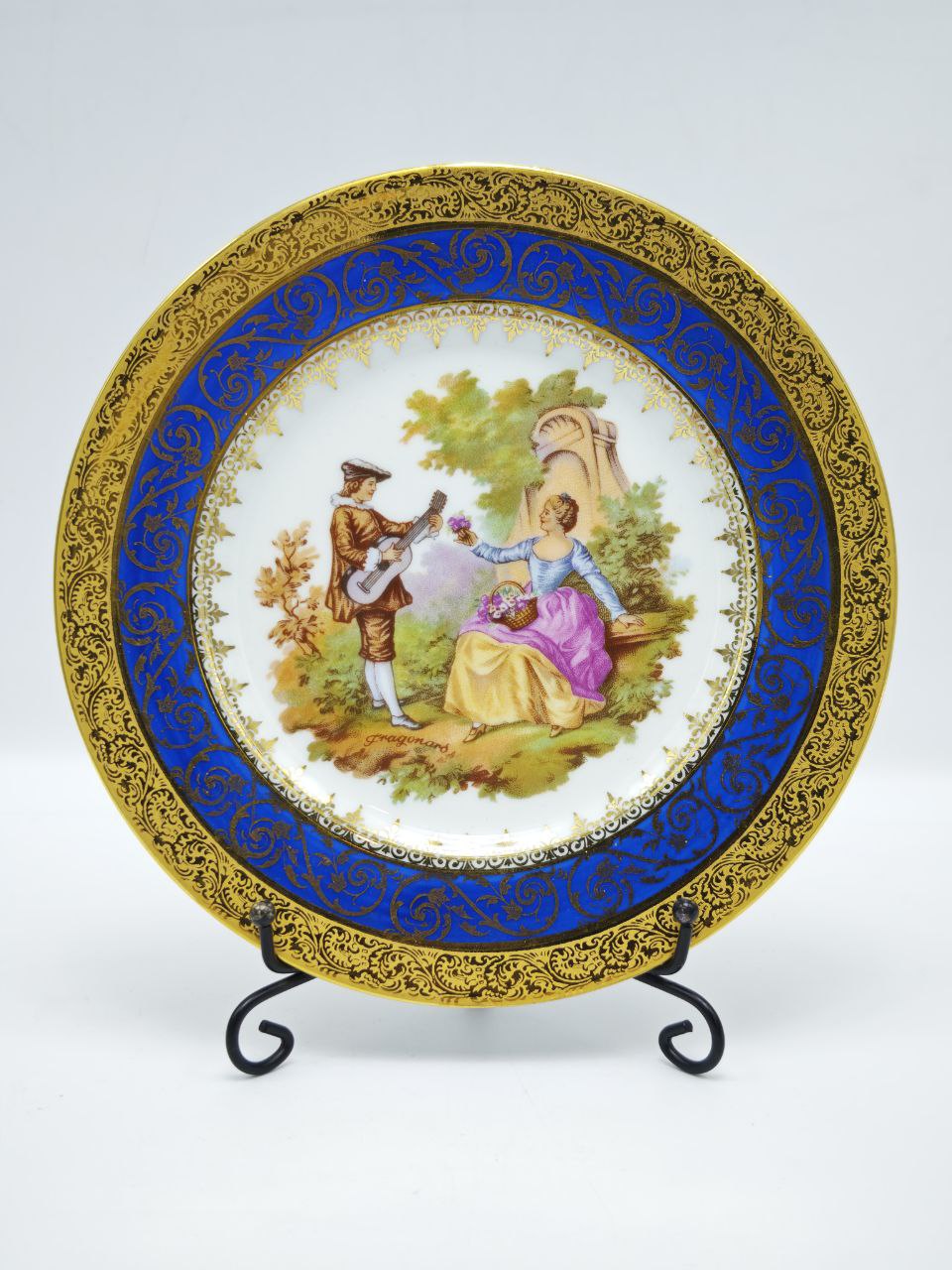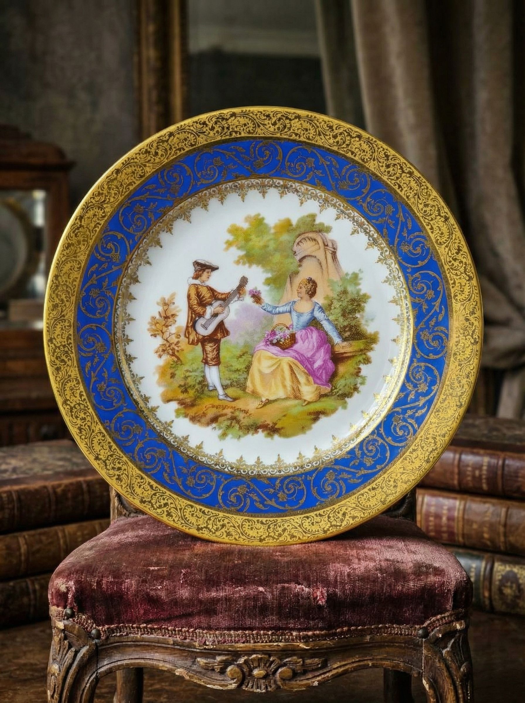 Изящная фарфоровая тарелка из Лиможа с кобальтовым орнаментом и вручную нанесённой позолотой передаёт атмосферу французской галантной эпохи. Центральная сцена в стиле Фрагонара выполнена в мягкой живописной манере и подчёркивает художественную ценность предмета. Такая тарелка станет выразительным акцентом в интерьере, дополнит коллекцию или станет элегантным подарком.