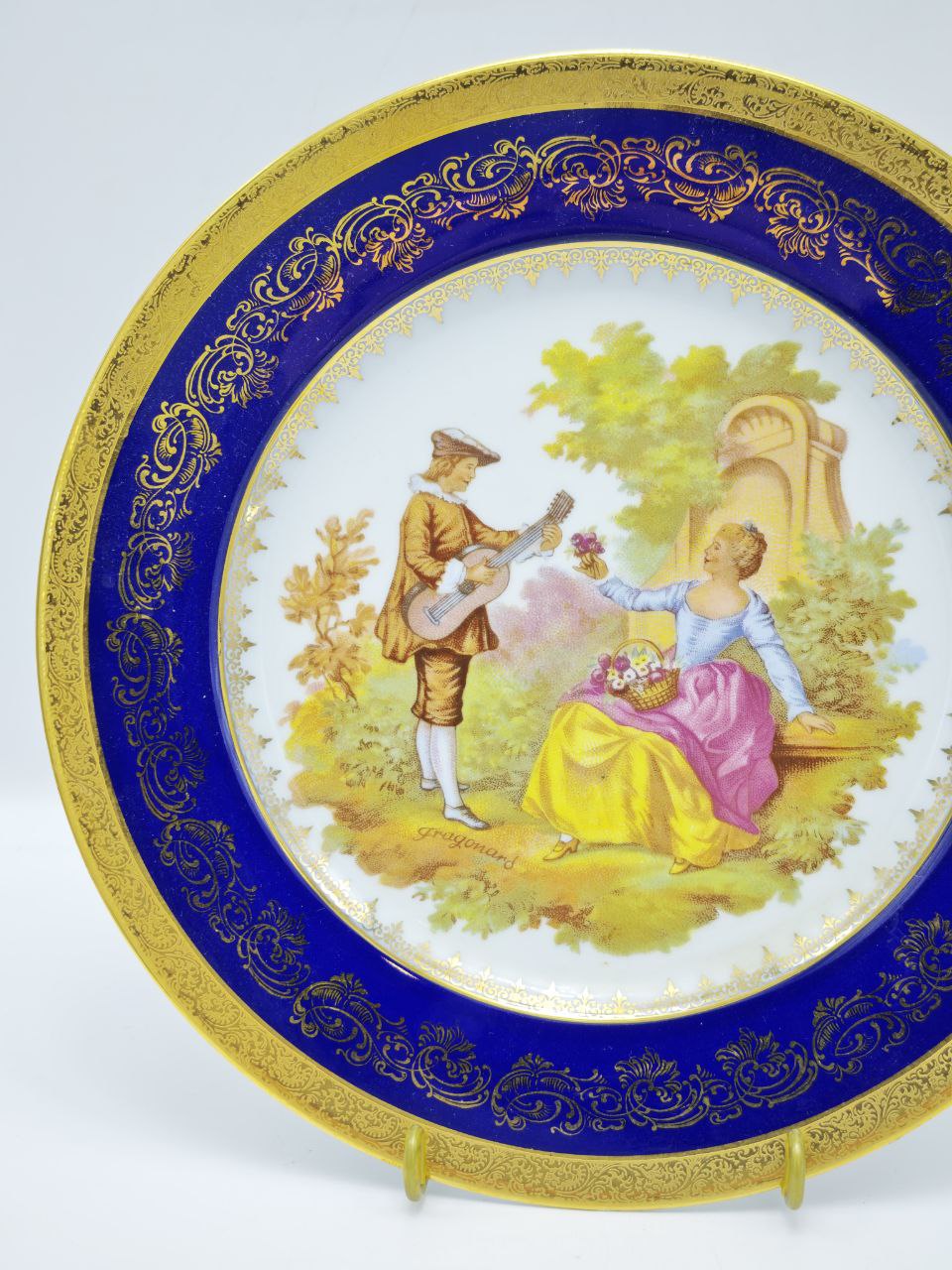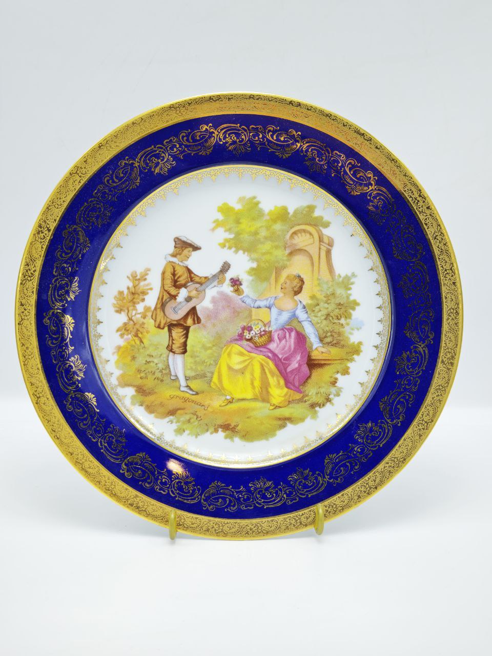 Эффектная декоративная тарелка Limoges с насыщенным сапфирово-синим орнаментом и щедрой ручной позолотой — пример классического французского фарфора середины XX века. Центральная галантная сцена в стиле Фрагонара создана с высокой детализацией и передаёт изысканность эпохи рококо. Большой диаметр и богатая палитра делают тарелку ярким элементом декора и ценным коллекционным экземпляром.