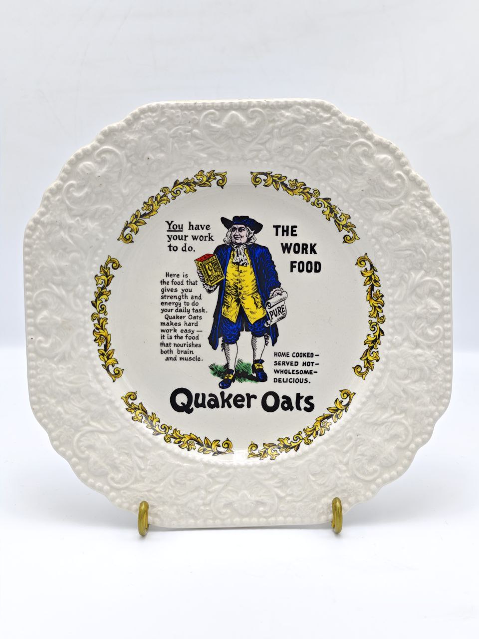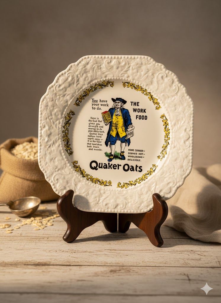 Редкая коллекционная тарелка от Lord Nelson Pottery, выполненная вручную в Англии — украшена яркой винтажной рекламной графикой Quaker Oats. Объёмный растительный рельеф по краю и сочные краски центральной сцены делают предмет выразительным акцентом в интерьере. Такой экземпляр ценится коллекционерами благодаря лимитированным сериям середины XX века и характерному английскому стилю. Прекрасно подходит для интерьерных композиций, коллекций рекламы и декоративной сервировки.