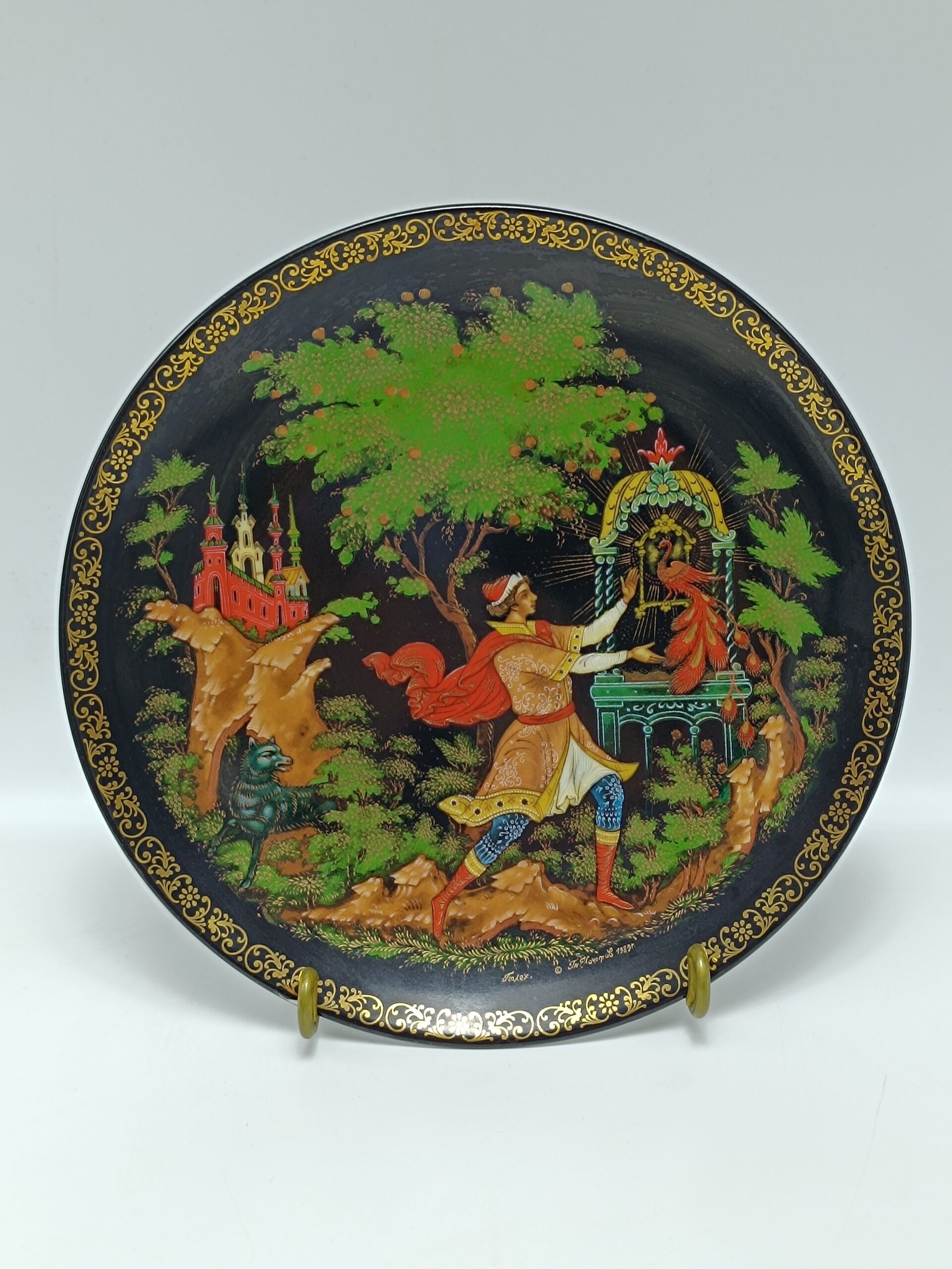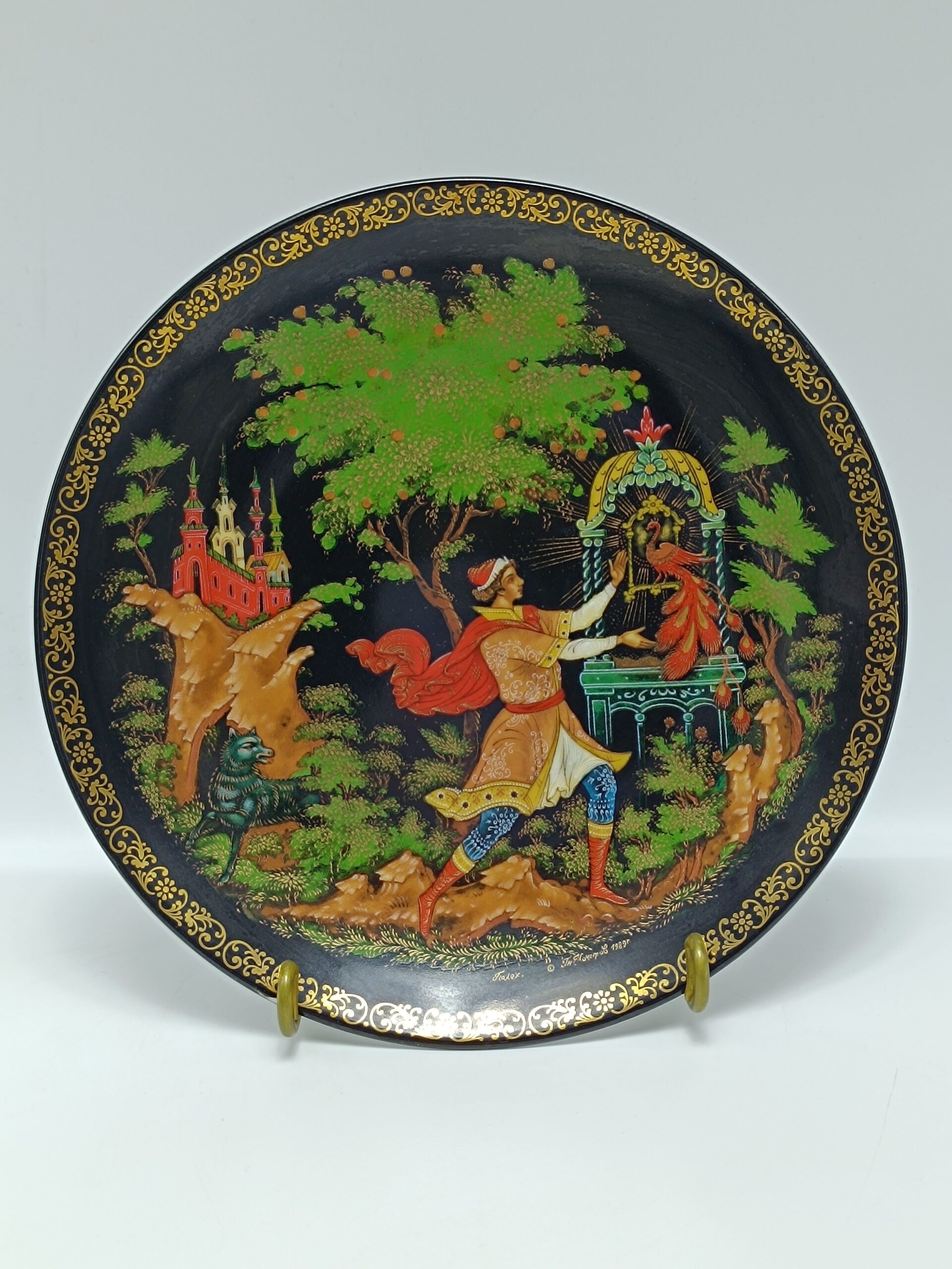 Декоративная тарелка «Жар-Птица. Золотая Клетка». Фарфор, деколь, золочение. СССР, Палехская Миниатюра, ЛФЗ, 1990