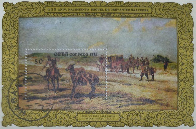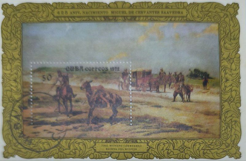 Погрузитесь в историю и искусство вместе с этой уникальной маркой из Кубы, выпущенной в 1972 году, в честь 425-го юбилея со дня рождения великого испанского писателя Мигеля де Сервантеса Сааведра. Эта редкая марка представляет собой не только филателистическую ценность, но и настоящий художественный шедевр, запечатленный на высококачественной бумаге и оформленный в элегантной рамке с золотым орнаментом, подчеркивающим величие сцены.Марка предлагает вам насладиться живописью выдающегося испанского художника Хосе Морено Карбонеро. На ней изображена сцена из знаменитого произведения «Дон Кихот», символизирующая борьбу героя с ветряными мельницами и его тягу к приключениям. Детальное исполнение и художественное мастерство Карбонеро позволяют передать динамику момента и глубину персонажей, оживляя сказочную атмосферу легендарного романа.портрет Дон Кихота на коне, когда он готовится вступить в стычку, оставляет неизгладимое впечатление. Обрамленный в золотистую рамку с богатой фрезеровкой, этот шедевр искусства станет центром внимания в коллекции любого истинного ценителя филателии или поклонника испанской литературы.Издание марки 1972 года приурочено к юбилею Сервантеса и является редким экземпляром, приобретение которого станет не только ценным пополнением вашей коллекции, но и инвестицией, которая будет расти в цене с годами. Эта марка также прекрасно подходит для подарка ценителям искусств и истории.Позвольте себе прикоснуться к культурному наследию через эту изысканную марку, которая объединяет историю, классическую литературу и живопись. Она станет украшением любой коллекции и отличным разговорным объектом, свидетельствующим об искушенности вашего вкуса и познаниях в мире искусства.