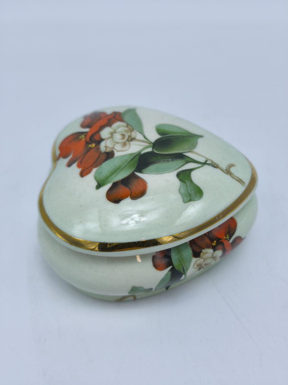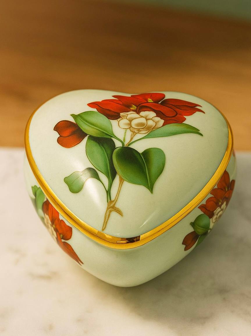 Представляем вашему вниманию очаровательную винтажную фарфоровую шкатулку, выполненную в форме сердца, которая станет утонченным акцентом в вашем доме или великолепным подарком для человека, ценящего стиль, качество и изысканность. Эта шкатулка изготовлена из высококачественного фарфора, известного своей прочностью и непревзойденной красотой. Ее поверхность покрыта изящной росписью, изображающей яркие цветы, которые буквально оживают на фоне, создавая неповторимую атмосферу весны и свежести.Обрамленная золотым ободком, эта шкатулка очаровывает своим великолепием. Золотая отделка добавляет нотку роскоши и элегантности, подчеркивая оригинальность и утонченность изделия. Особенно привлекательной является форма сердца, которая делает шкатулку символом любви и преданности. Она прекрасно подойдет для хранения ваших украшений, милых сердцу записок или других значимых мелочей.Созданная в середине прошлого века, шкатулка несет в себе дух тех времен, когда внимание к деталям и качество исполнения были на высоте. Художественная роспись выполнена вручную, что делает каждую шкатулку уникальной. Искусные мастера, вложившие душу в создание этого произведения, сохраняли традиции и придавали особое значение каждому штриху.Эта шкатулка станет отличным дополнением для любого стиля интерьера — будь то классика, модерн или винтаж. Красочная роспись и блеск золотой отделки смогут украсить ваш туалетный столик, придавая ему особый шарм, или же стать изысканным акцентом на книжной полке или каминной полке. Благодаря своему дизайну, она легко найдет место в любом уголке вашего дома.Особое внимание стоит уделить ее роли как подарка. Если вы ищете что-то особенное на день рождения, юбилей или другое событие, эта шкатулка в форме сердца станет идеальным выбором. Она будет служить трогательным напоминанием о ваших чувствах и благодарности.