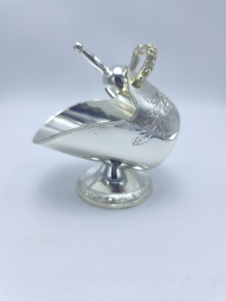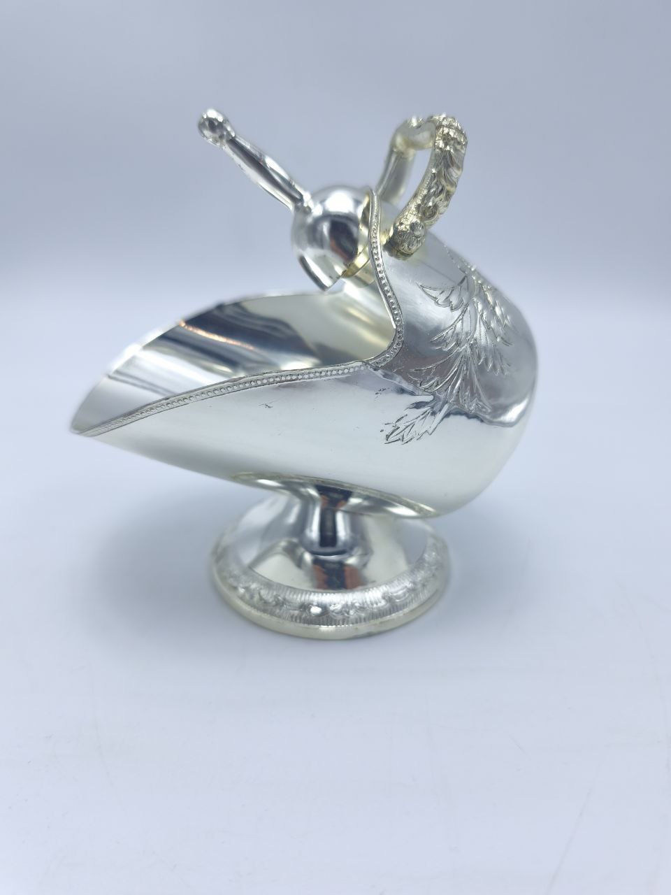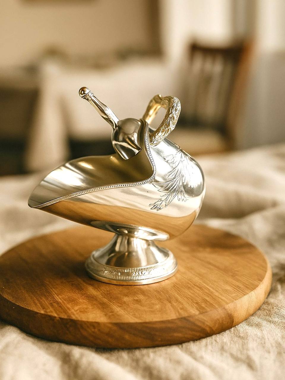 Эта изысканная винтажная сахарница, размером 13х13см, представляет собой воплощение элегантности и утонченности, отражая атмосферу ушедших эпох. Изготовленная по стандартам прошлого века, она выполнена с использованием техники серебрения, придающей изделию благородный, сияющий вид, который сохраняет свою привлекательность на протяжении многих лет.Сахарница имеет классическую форму, отличающуюся изящными линиями и продуманными деталями, которые делают её настоящим произведением искусства. Корпус украшен тонким орнаментом, напоминающим о романтике старинных дворцов и раритетных находках. По бокам можно увидеть элегантные ручки, выполненные в форме стилизованных завитков, которые не только добавляют эстетики, но и обеспечивают удобство в использовании.Крышка сахарницы плотно прилегает к основе, имея легкую сферическую форму и украшенную изысканным букетом рельефных цветочных мотивов. Верхняя часть крышки увенчана небольшой элегантной фигуркой, что придаёт ей дополнительное изящество и уникальность. Вся работа над этой сахарницей выполнена с большим вниманием к деталям, что характерно для лучших образцов декоративного искусства.Благодаря процессу серебрения, сахарница имеет устойчивую к окислению поверхность, которая сохраняет блеск и эстетическую привлекательность на протяжении длительного времени. Этот предмет станет настоящим украшением любого чаепития или кофейного времени, привлекая внимание гостей и разбавляя повседневную обстановку нотками аристократической роскоши.Кроме своего функционального назначения, сахарница может выступать и самостоятельным элементом декора, гармонично дополняя коллекцию винтажных или антикварных предметов в интерьере. Она прекрасно вписывается в любой стиль оформления, будь то классический, эклектичный или современный, добавляя ему особого шарма. Такая сахарница станет идеальным подарком для ценителей истории и искусства, тех, кто любит окружать себя вещами с душой и историей.Внушительных размеров и в то же время уникально легкая, эта сахарница станет центром внимания на вашей обеденной зоне, украшая её богатейшей фактурой и историческим духом. В коллекции или в одиночку — она выглядит выразительно и органично, подчеркивая ваш безупречный вкус и любовь к винтажным вещам.