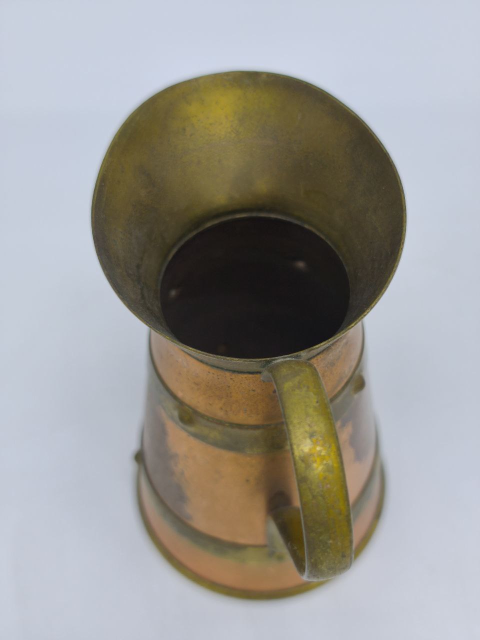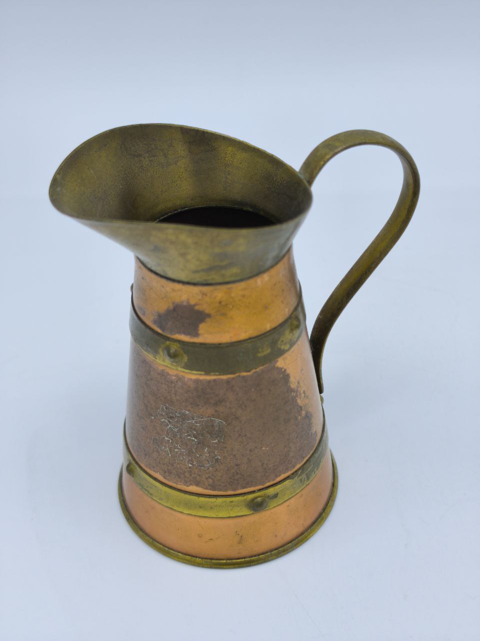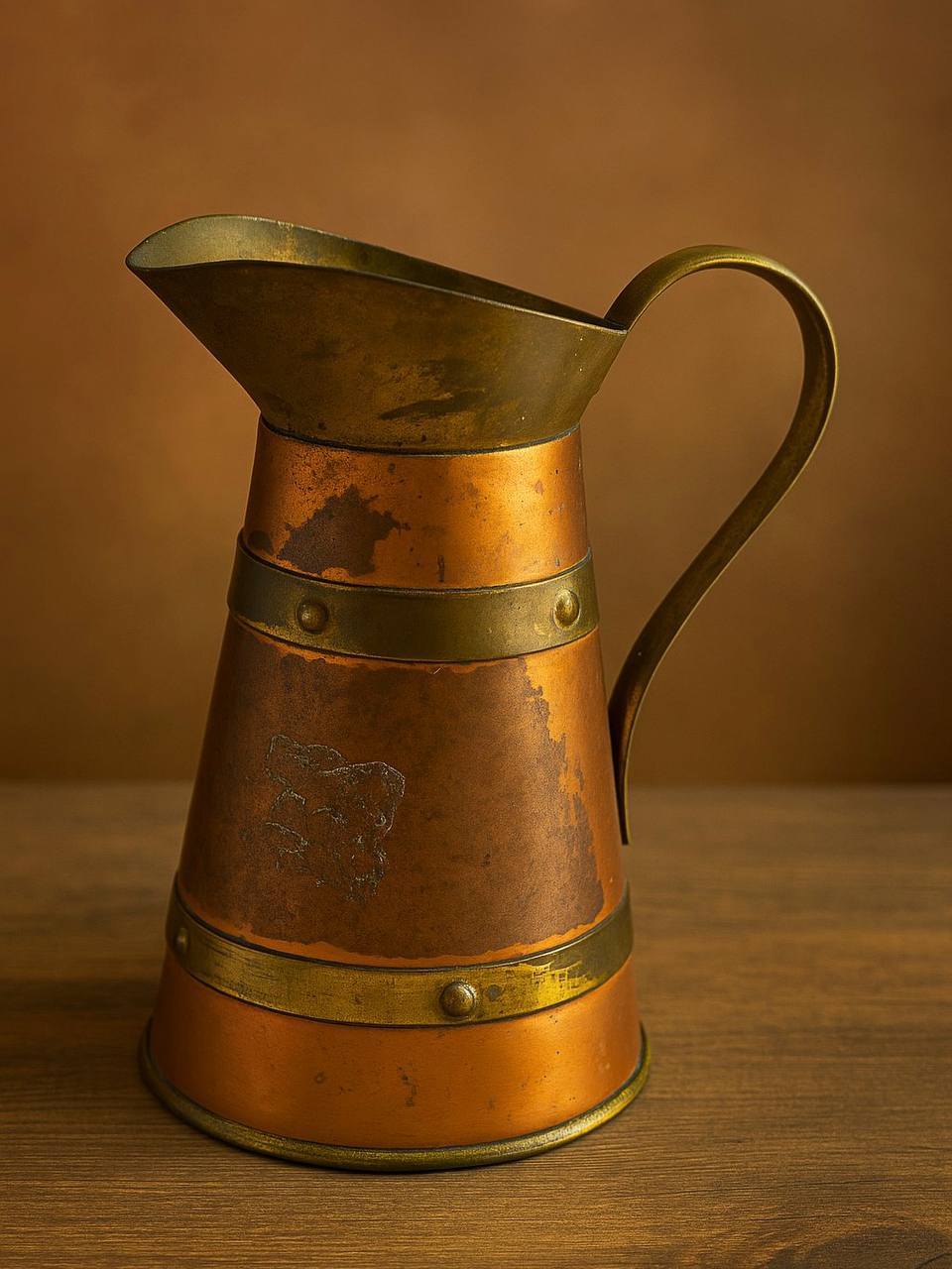 Представляем вашему вниманию изысканный винтажный кувшин, изготовленный из качественной меди с элементами из латуни. Это не просто предмет интерьера, это семейная реликвия, которая будет хранить в себе историю и тепло вашему дому. Его классический дизайн восходит к начали прошлого века, когда красота и практичность стояли на одном уровне.Медная основа кувшина поражает своим насыщенным металлическим блеском, который, благодаря мастерству изготовителя, сохраняется на протяжении долгих лет. Каждая деталь на поверхности свидетельствует о смелом и уверенном мастерстве прошлого. Изящное сплетение меди и латуни не только делает кувшин крепким и надежным, но и добавляет нотку роскоши и статусности. Тщательно выполненные латунные полосы выгодно выделяются на медной поверхности, превращая кувшин в уникальный декоративный элемент, который способен стать центральным акцентом вашего интерьера.Но кувшин не только красив – он также хорошо продуман с функциональной точки зрения. Компактный размер позволяет с легкостью разместить его на любой полке или столе. А удобная ручка обеспечивает легкость использования, будь то сервировка стола для праздника или обычное застолье в кругу семьи. Узкий носик гарантирует, что ни одна капля драгоценной жидкости не будет потрачена зря.Этот винтажный кувшин станет отличным выбором для коллекционеров старинных предметов, а также для тех, кто по-настоящему ценит качество и изысканность. Он может стать идеально подходящим подарком для любителей истории и ценителей классического стиля. В интерьере вашего дома этот кувшин будет не только служить практической цели, но и будет источником вдохновения, ведь каждый раз, глядя на него, вы сможете мысленно перемещаться в эпоху, когда предметы создавались с любовью и заботой о покупателе.Порадуйте себя и своих близких этим замечательным экземпляром, который будет радовать вас долгие годы. Присоединитесь к числу счастливых обладателей уникальных предметов, которые хранят традиции и историю в каждой детали!