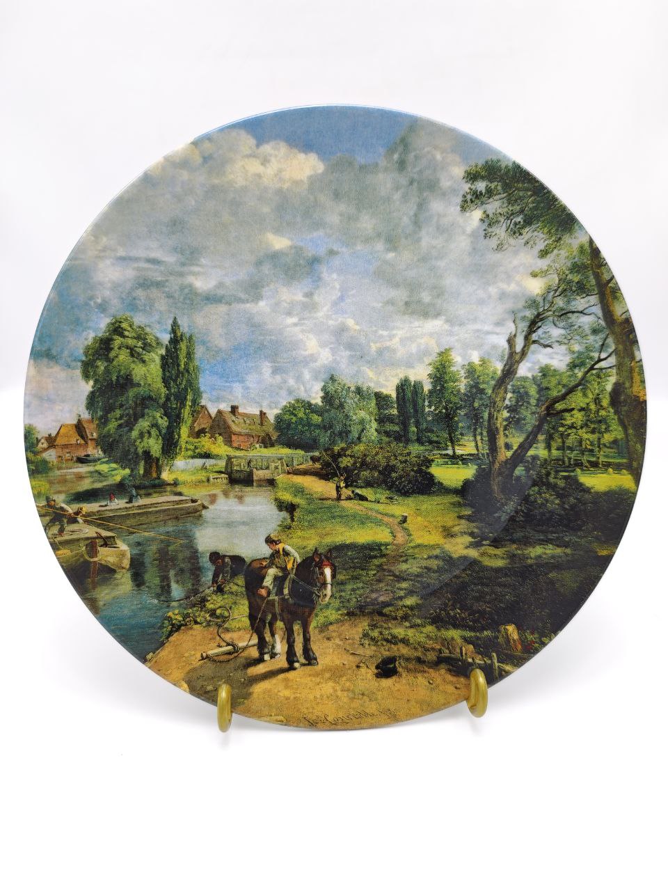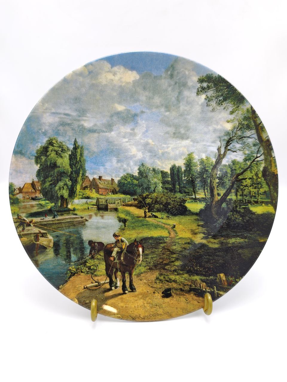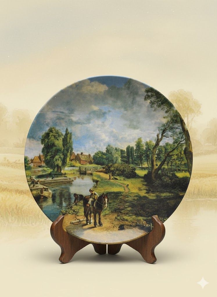 Перед вами не просто декоративная тарелка — это миниатюрное окно в Англию XIX века. Легендарный Royal Doulton воплотил в костяном фарфоре один из самых поэтичных пейзажей Джона Констебла: спокойная река, мерный шаг лошади, мягкий свет над деревней. Лимитированное издание 1992 года, созданное всего за 75 firing days, делает предмет особенно ценным для коллекционеров. Такая тарелка не просто украшает интерьер — она создаёт атмосферу тихого загородного утра, где время течёт медленнее.