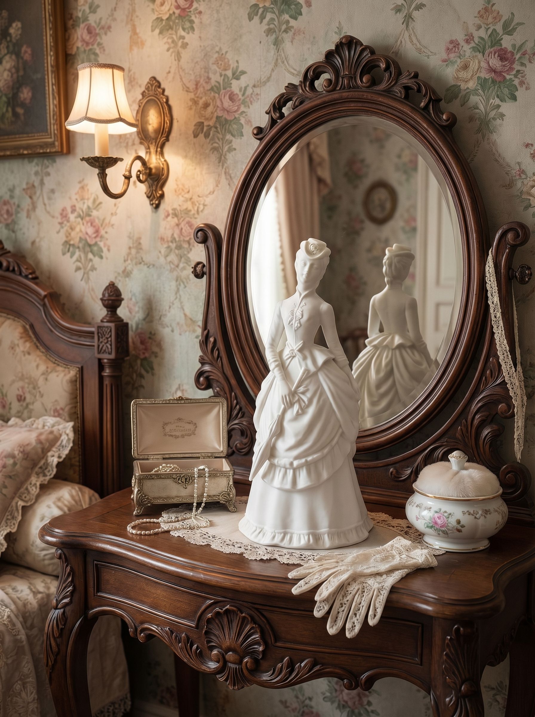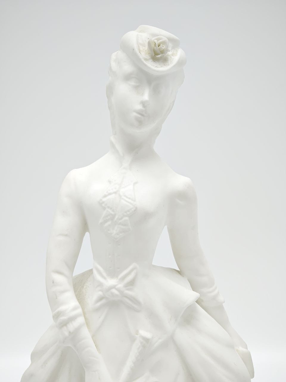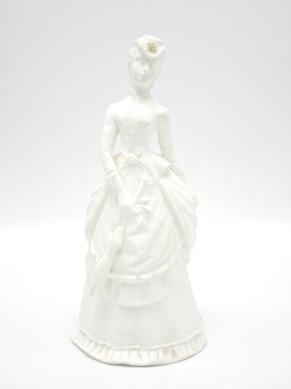 Фарфоровая статуэтка выполнена из бисквитного фарфора и изображает изящную даму с зонтом в стиле викторианской эпохи. Детально проработанное платье с драпировками, банты и аксессуары создают выразительный и гармоничный образ. Высота изделия составляет 20,5 см, благодаря чему статуэтка хорошо смотрится в интерьере и на полке. Матовая поверхность подчёркивает мягкость линий и аккуратность исполнения. Состояние отличное.