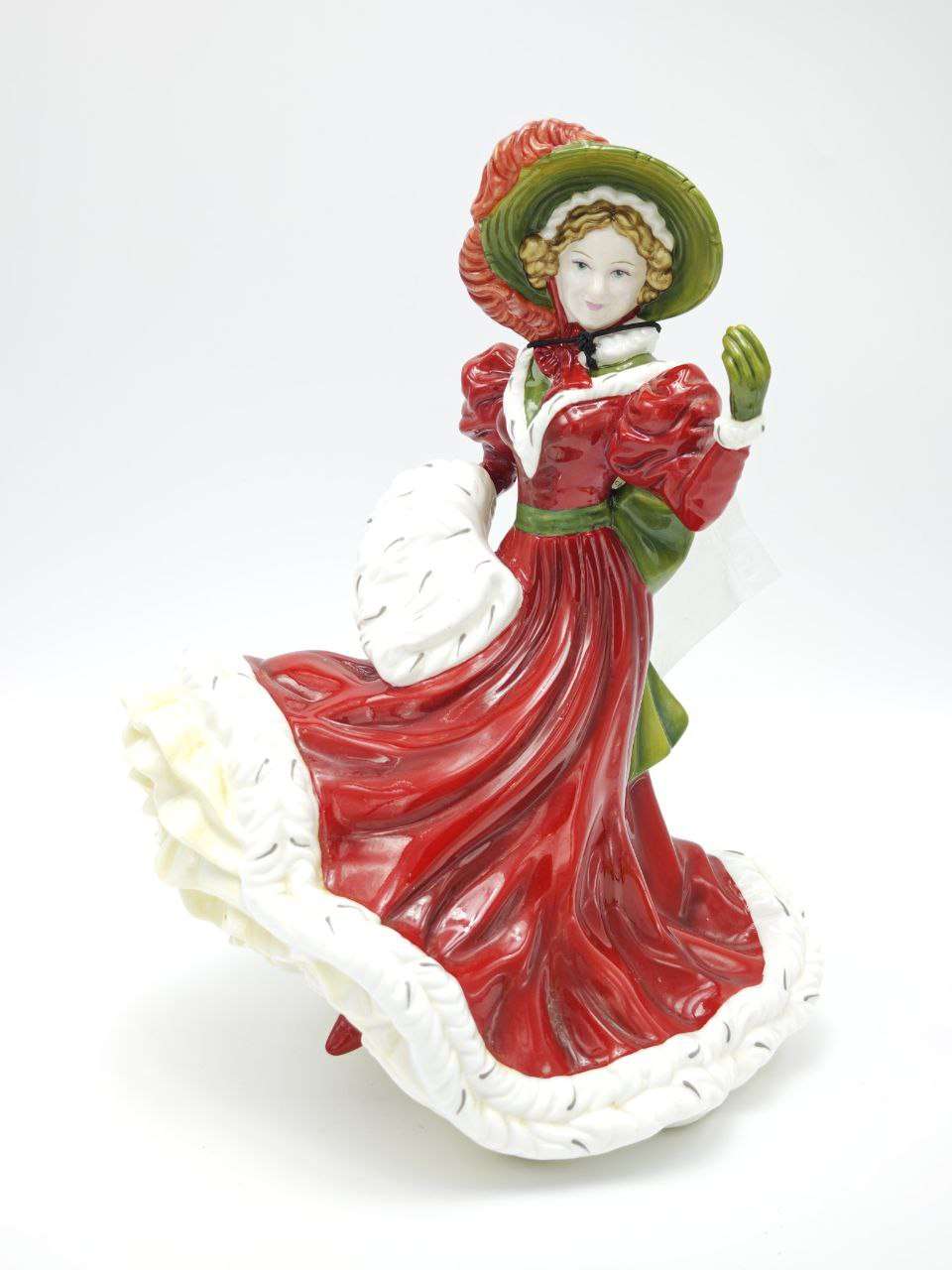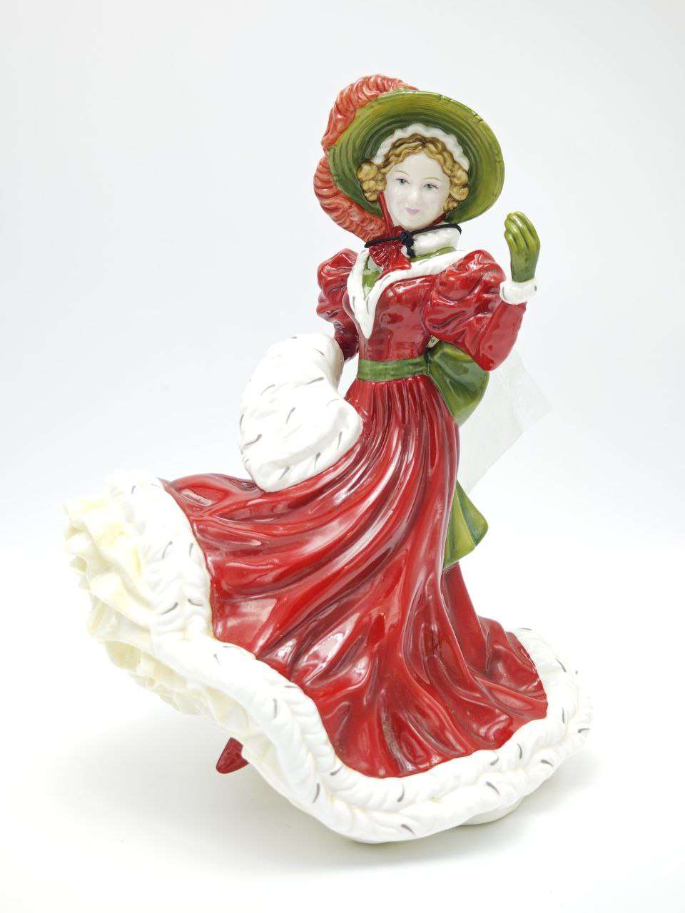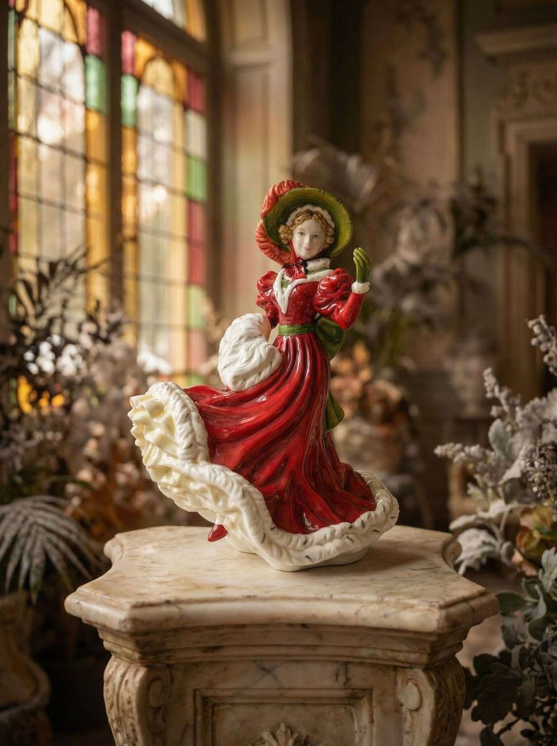 Фарфоровая фигурка передаёт атмосферу зимнего праздника — движение юбки, развевающиеся складки ткани и лёгкий поворот корпуса создают ощущение живой сцены. Образ выполнен в насыщенной красно-зелёной гамме с контрастной белой отделкой, что подчёркивает праздничный характер композиции. Ручная роспись придаёт глубину цвету и подчёркивает детали костюма и лица. Фигурка изготовлена из костяного фарфора и относится к серии Pretty Ladies. Бренд Royal Doulton. Размеры фигурки — 21×16 см, вес фигурки — 700 грамм.