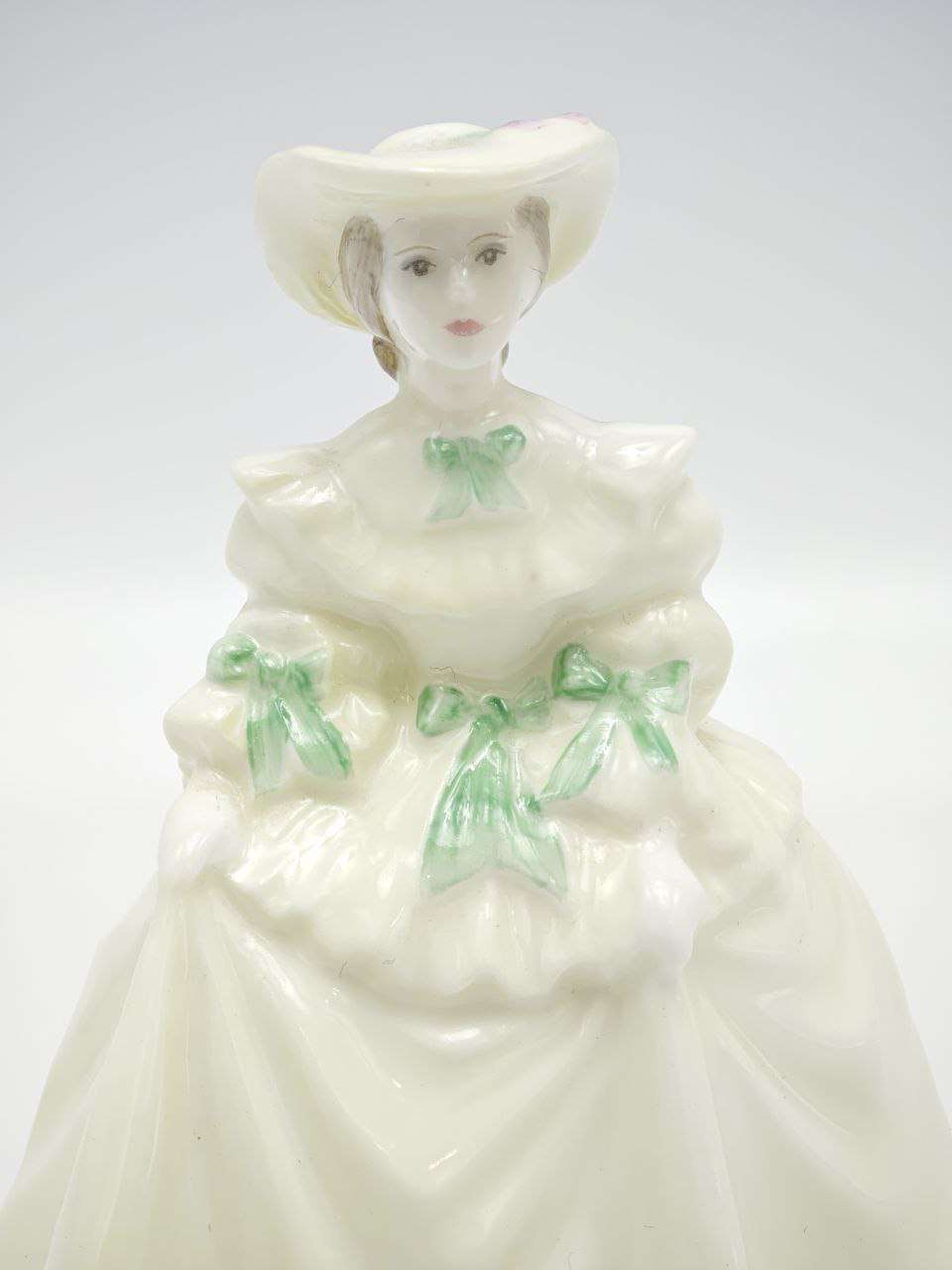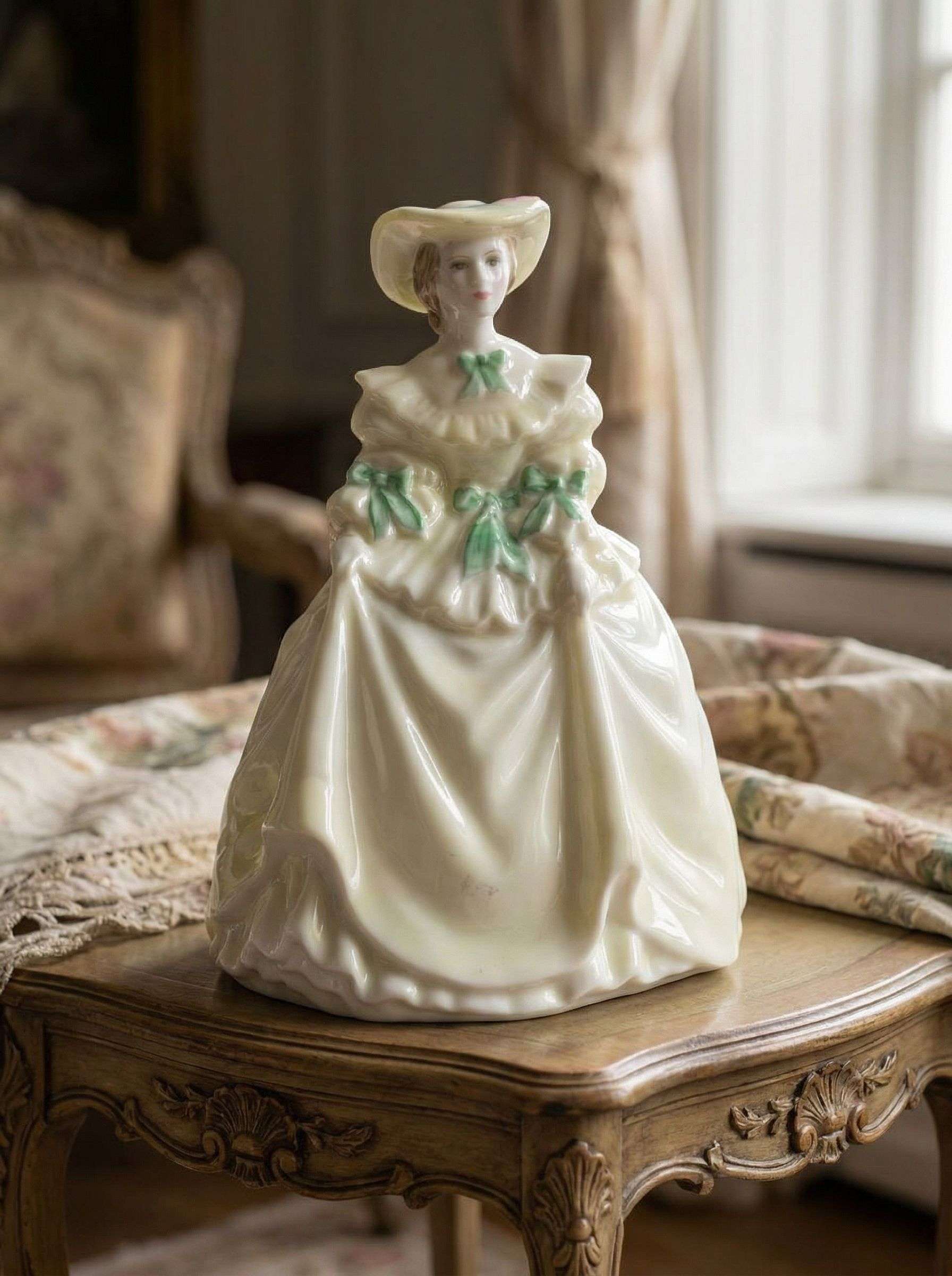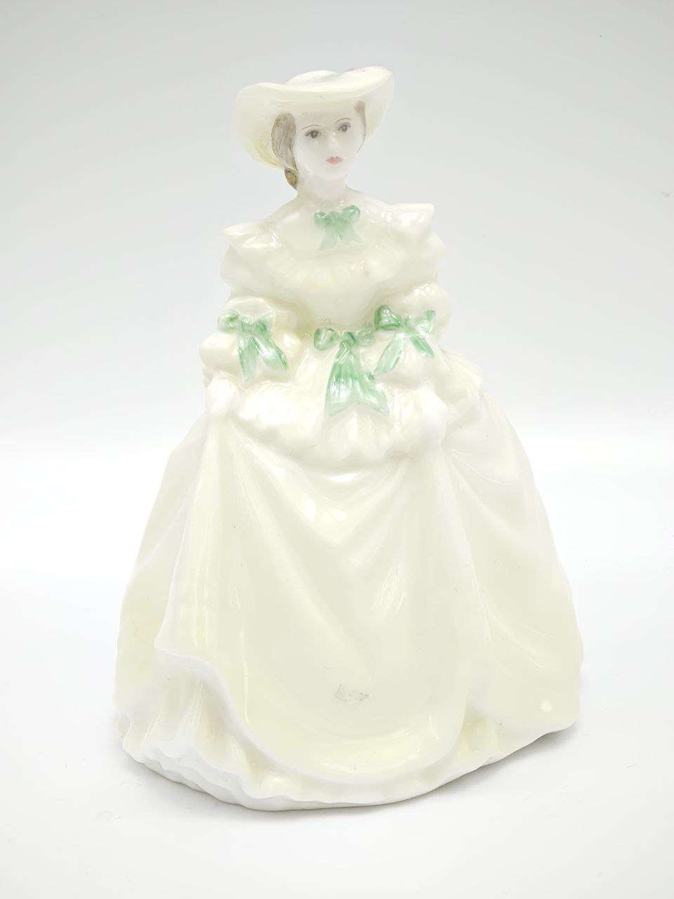 Фарфоровая статуэтка изображает даму в светлом платье с мягкими складками и аккуратными декоративными бантами, создающими ощущение лёгкости и движения. Образ выдержан в спокойной классической манере, с акцентом на силуэт и плавность линий. Нежная цветовая гамма подчёркивает утончённость формы и делает фигурку гармоничным интерьерным акцентом. Статуэтка выполнена из костяного фарфора, бренд Coalport, высота изделия 9,5 см. Подходит для размещения в витрине, на полке или в композиции с другим декоративным фарфором.