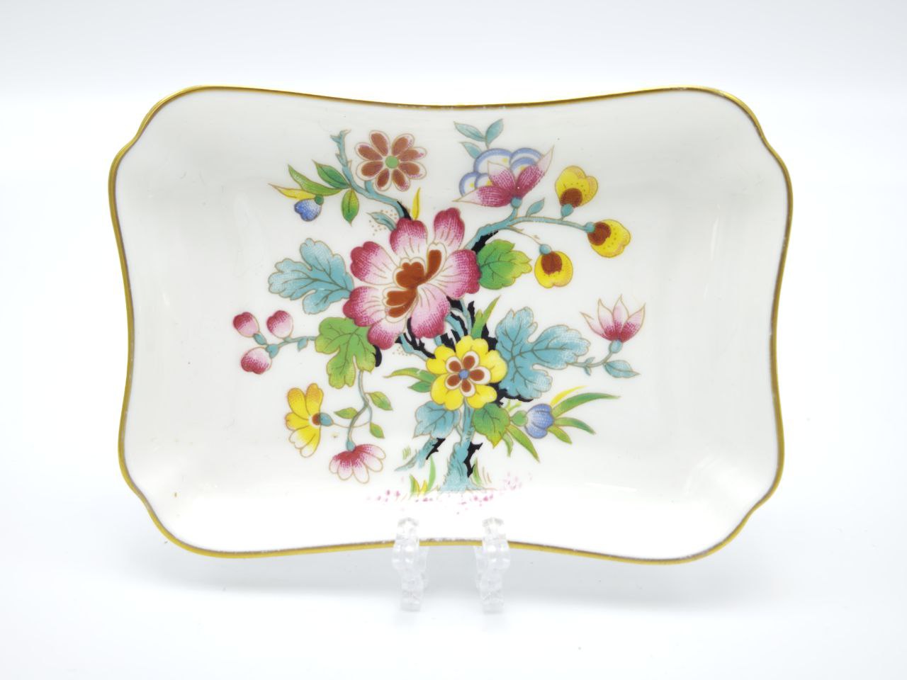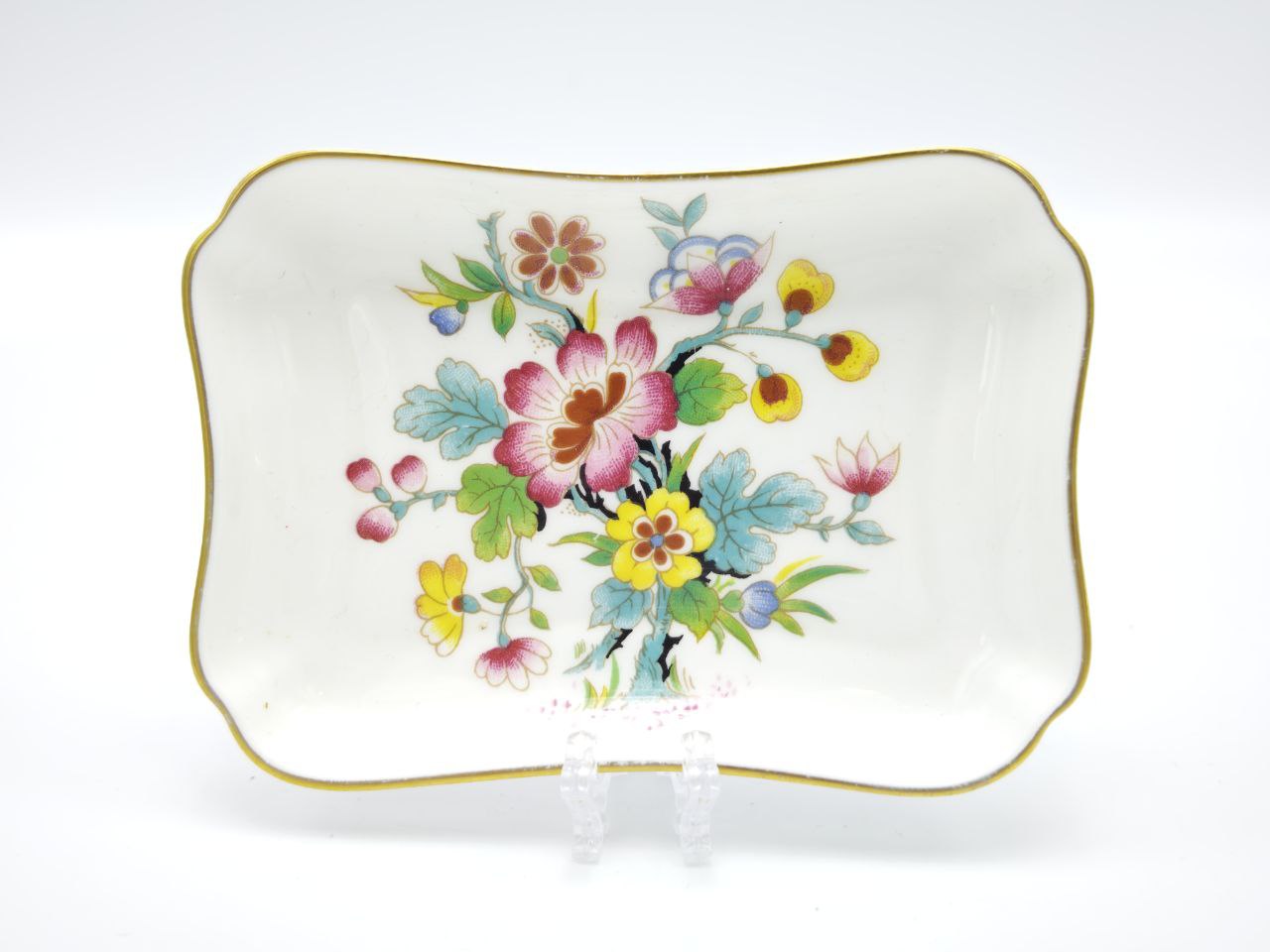 Аутентичный артефакт из коллекции «Ming Rose». Небольшая тарелочка от легендарного бренда Coalport (основан в 1750 году) — шедевр английского фарфора. Изготовлена из **костяного фарфора (подтверждено клеймом *«BONE CHINA»* на дне). Деколь с цветочным узором (розы, жёлтые и синие цветы) дополнен изящной позолотой по контуру и краю. Тарелочка не предназначена для пищевого использования — это чисто декоративный предмет, который украсит стену, полку или витрину в стилях винтаж, прованс или классика.