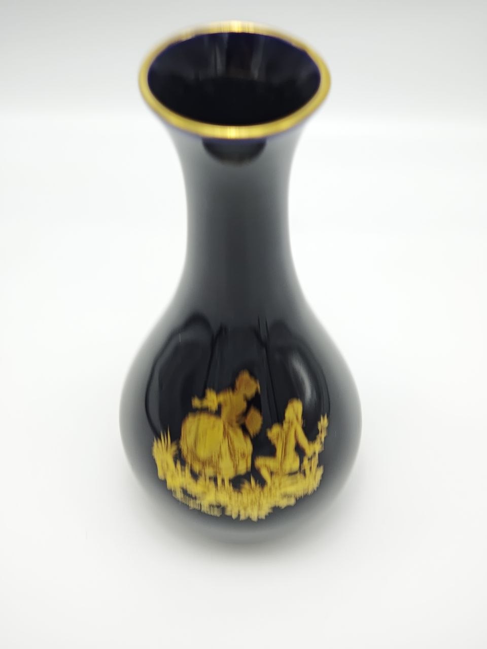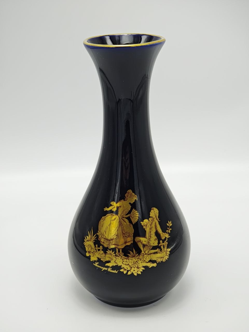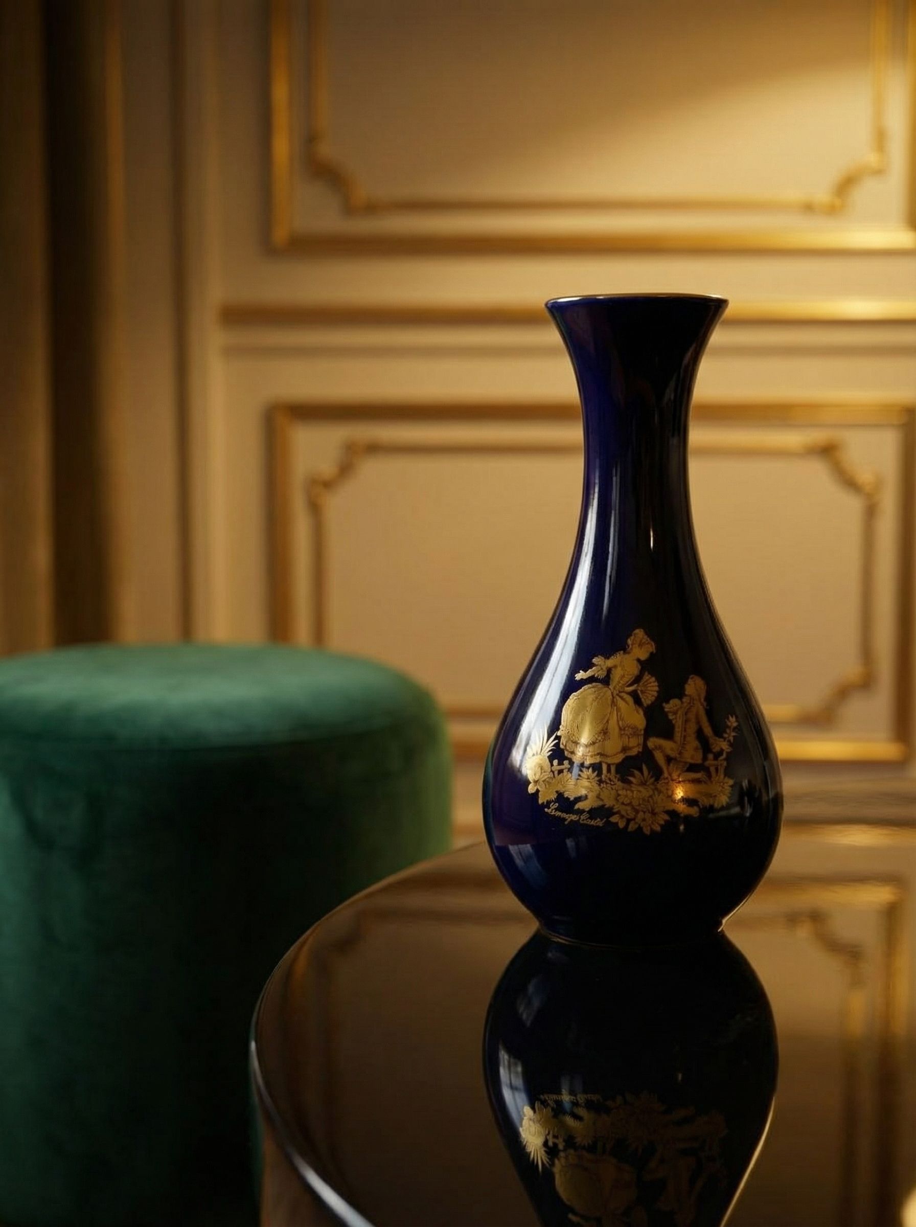 Изящная фарфоровая ваза глубокого кобальтового цвета с тонкой позолотой и романтической сценой в стиле французских галантных сюжетов. Изделие выполнено мануфактурой Limoges Castel, известной своим качественным фарфором и декоративной проработкой. Высота вазы 17,5 см, диаметр 8 см, вес 310 г — оптимальный формат для живых цветов или декоративного оформления пространства. Благородный блеск глазури и золотой рисунок создают выразительный акцент в интерьере.