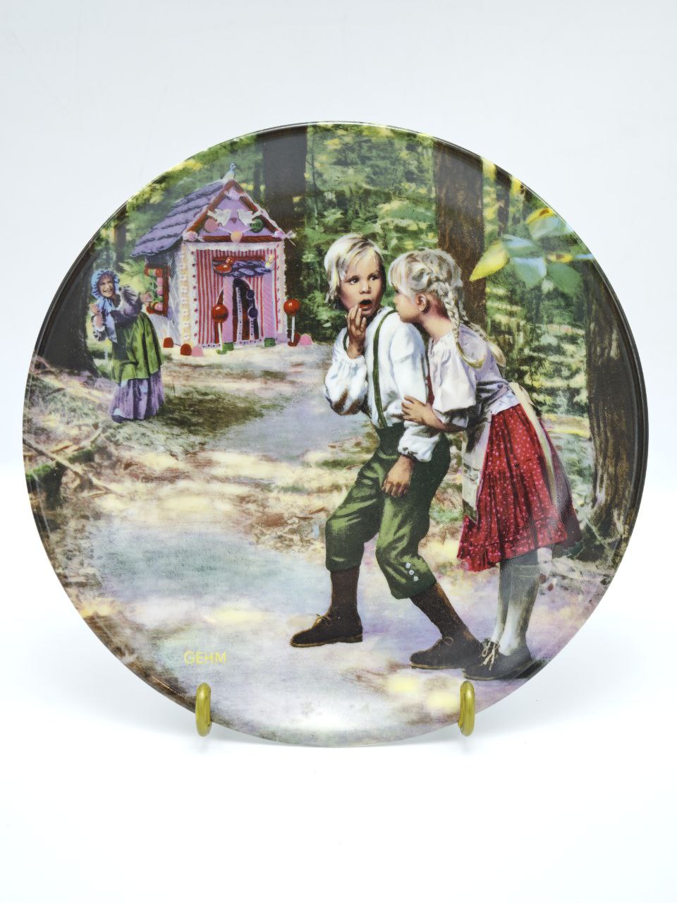 Перед вами не просто фарфоровая тарелка — это маленький театр сказки, созданный в Германии в 1981 году. Художник Charles Gehm передал момент, когда дети впервые видят пряничный домик — испуг, удивление, шёпот… Сюжет оживает благодаря глубокой, многослойной деколи, где каждая деталь прописана как кадр из старой иллюстрации.Тарелка выпущена небольшой серией и сохранилась в великолепном состоянии — с родной коробкой и подлинным сертификатом. Такой предмет не просто украшает интерьер, а создаёт настроение дома — тёплое, уютное, сказочное.