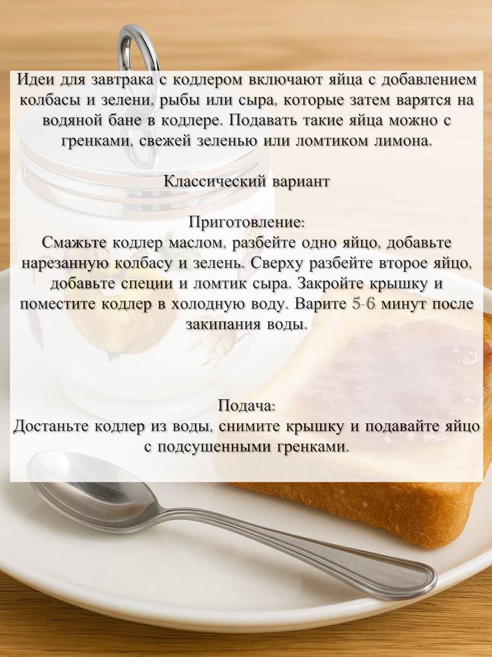 Утончённость в мелочахФарфоровый кодлер в винтажном стиле — это аксессуар для тех, кто ценит удовольствие от простых вещей. Изготовленный из плотного фарфора с гладкой глазурью, он выдерживает повседневное использование и придаёт процессу приготовления яйца эстетический смысл. Размер рассчитан на одно яйцо — оптимален для завтрака в одиночку, романтического бранча или изысканной подачи на приёме. Толщина стенок обеспечивает равномерный прогрев содержимого, а крышка помогает сохранить аромат и консистенцию. Кодлер легко помещается в стандартную кастрюлю, имеет удобную крышку с маленькой ручкой для безопасного извлечения. Фарфор термостойок, но всё же рекомендуется бережное обращение: резкие перепады температуры могут привести к трещинам, поэтому не вынимайте кодлер сразу из кипятка и не ставьте на холодные поверхности. Для смягчения вкуса можно добавить небольшой кусочек масла, сыр или зелень прямо в ёмкость перед варкой. После использования кодлер моется тёплой водой с мягким средством; для удаления стойких пятен используйте мягкую губку и пищевую соду.Культурное и эмоциональное значениеВинтажный кодлер — это не просто кухонный предмет, это напоминание о неспешных утра и вневременном шарме классической посуды. Он подходит для подарка ценителям ретро, новосёлам или тем, кто начинает собирать свою коллекцию фарфора. Такой кодлер добавит тонкий, изысканный акцент в любую кухню, от минималистичной до кантри‑стиля, и превратит каждое приготовление яйца в маленький ритуал заботы о себе.