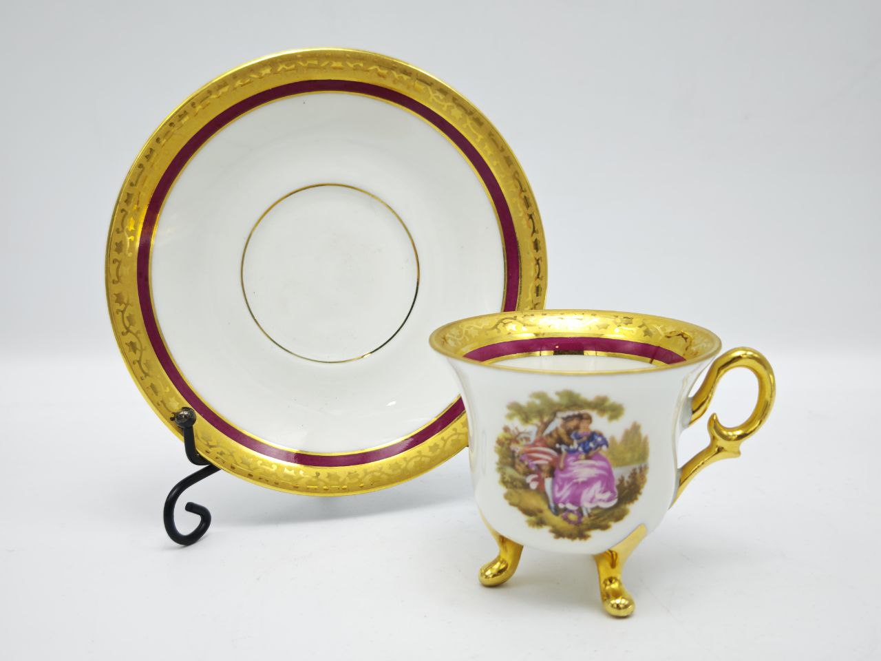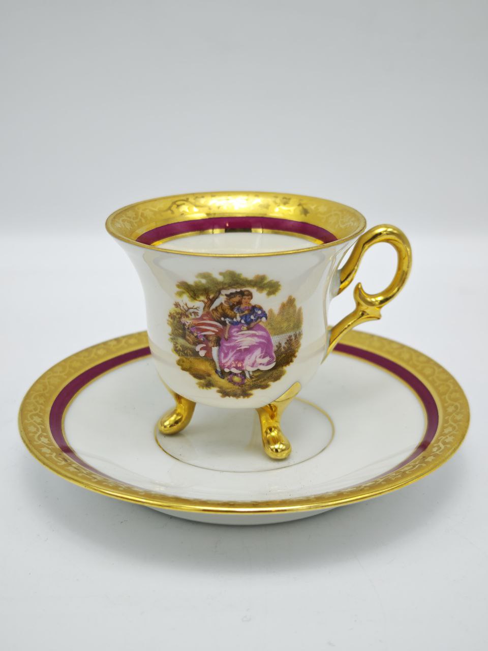 Изящная кофейная пара Meissner Limoges — пример французского фарфора середины XX века. Чашка на трёх позолоченных ножках высотой около 6 см и диаметром 6 см выполнена с необыкновенной лёгкостью: глубокий бордовый фон, золотая кромка и миниатюрная романтическая сцена в стиле классического Лиможа. Блюдце диаметром 11 см гармонично дополняет композицию, создавая ощущение завершённости и камерной элегантности.Пара смотрится цельно и благородно, идеально подходит для коллекции или в качестве изысканного декоративного акцента.
