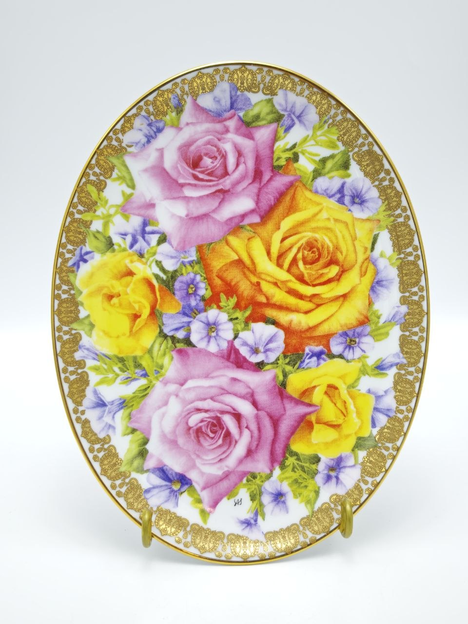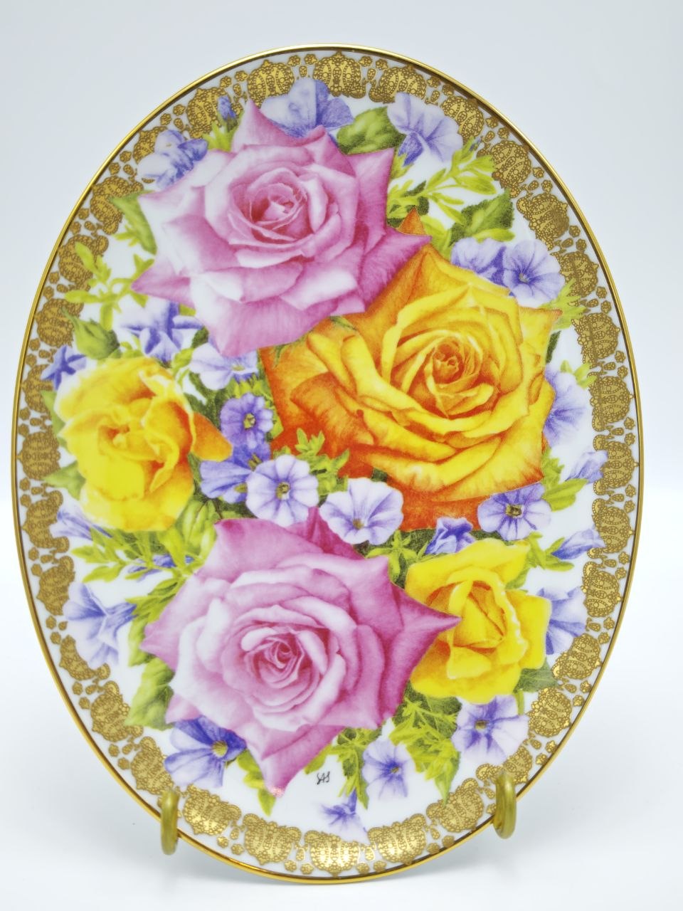 Декоративная настенная тарелка из фарфора с выразительной композицией из роз в насыщенных розовых и золотистых оттенках, дополненная изящным позолоченным орнаментом по краю. Изделие выпущено брендом Davenport в лимитированной серии Congratulations, посвящённой Золотому юбилею королевы. Размер тарелки 22×17 см, гармонично впишется в классический интерьер и станет ярким декоративным акцентом. Подходит для настенного размещения и коллекционирования английского фарфора.