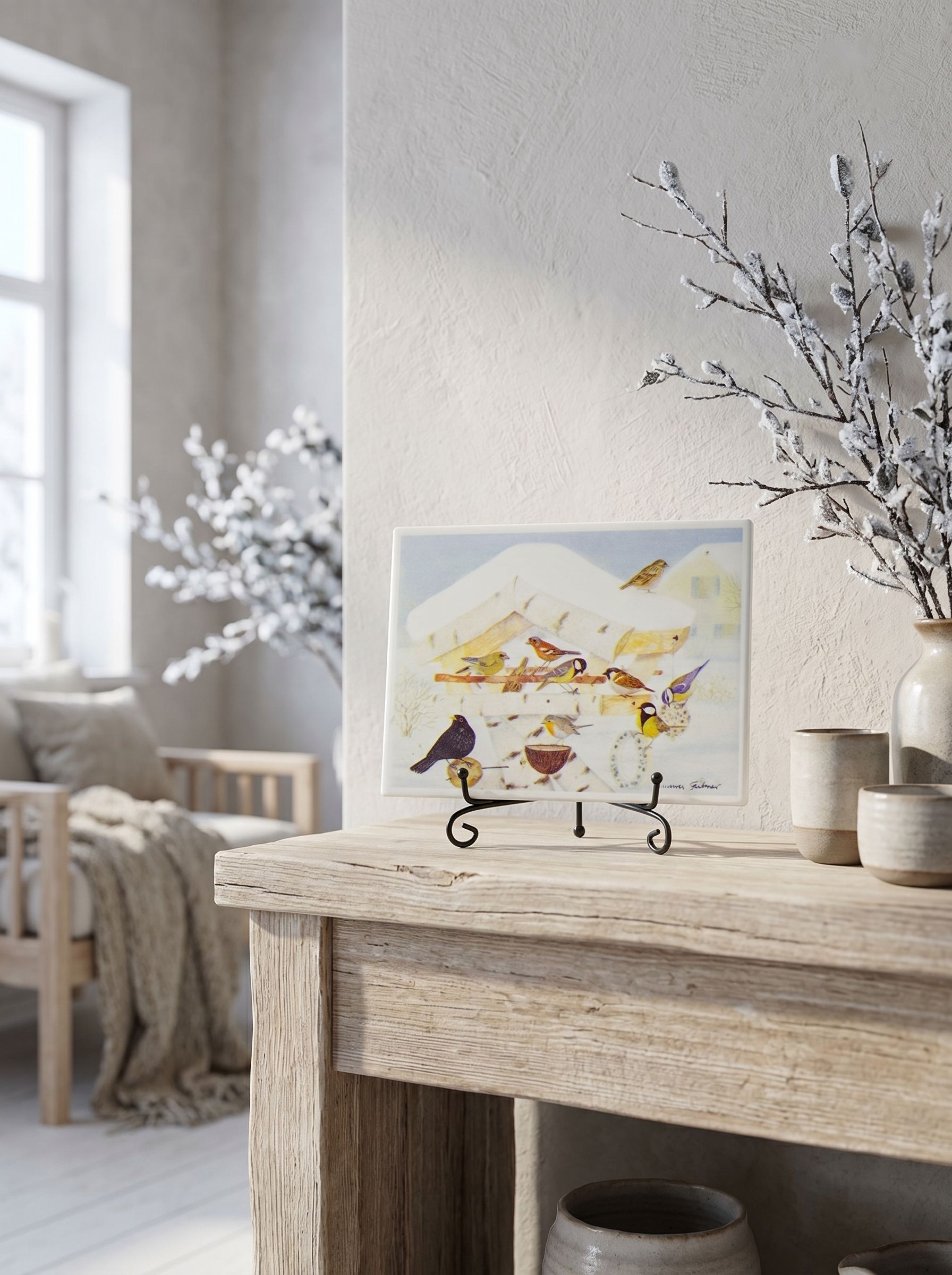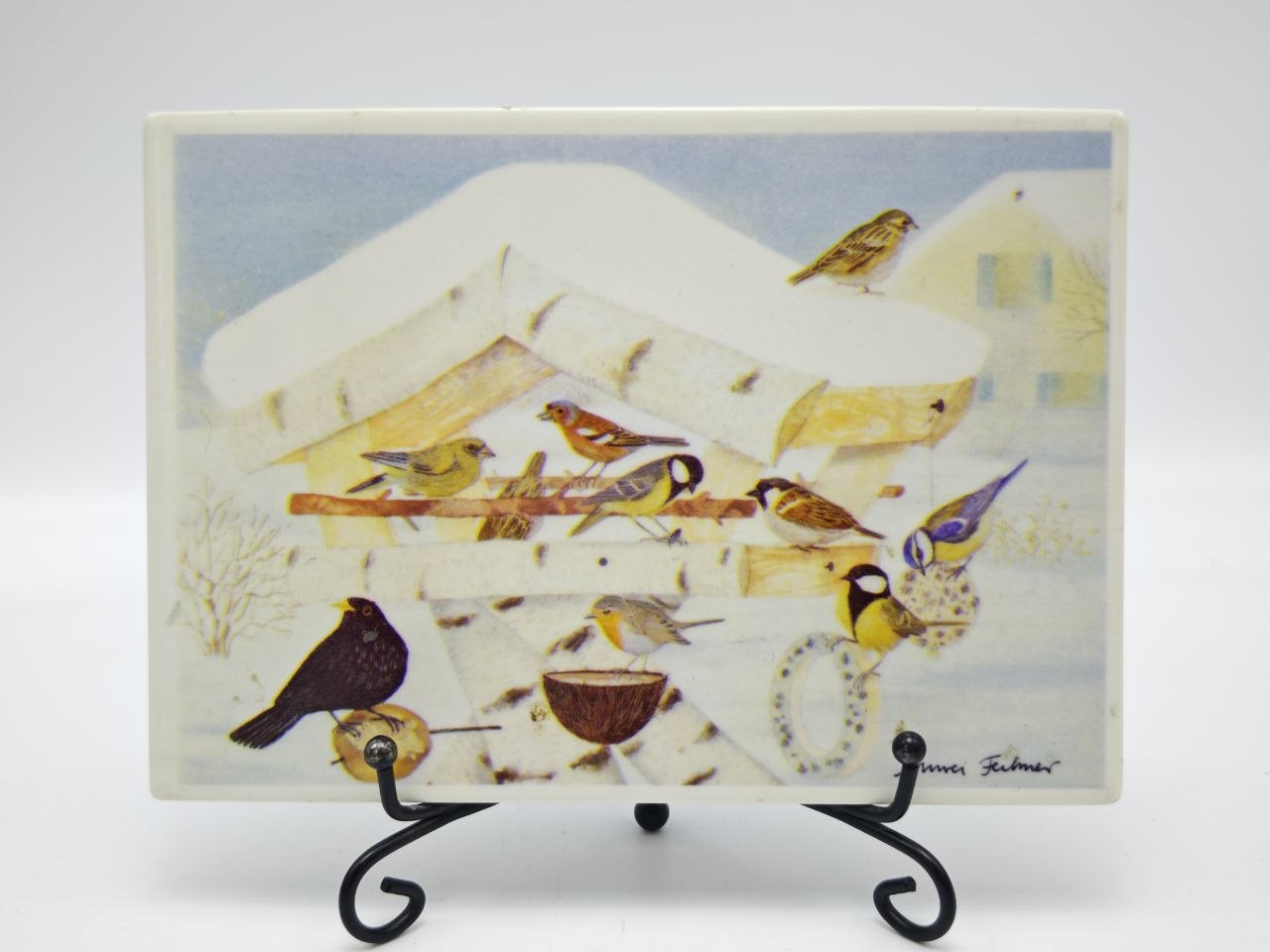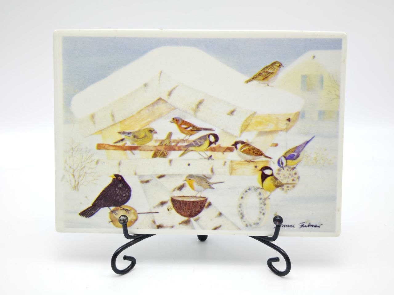 Фарфоровая плакетка Villeroy&Boch выполнена в формате открытки с трогательной зимней сценой кормления птиц у домика. Нежная цветовая палитра и детализированное изображение создают атмосферу уюта и спокойствия. Компактный размер 15×10.5 см и вес 110 г позволяют легко разместить изделие в интерьере или дополнить коллекцию декоративного фарфора. На обороте присутствует маркировка VilboCard, подтверждающая выпуск в Германии.