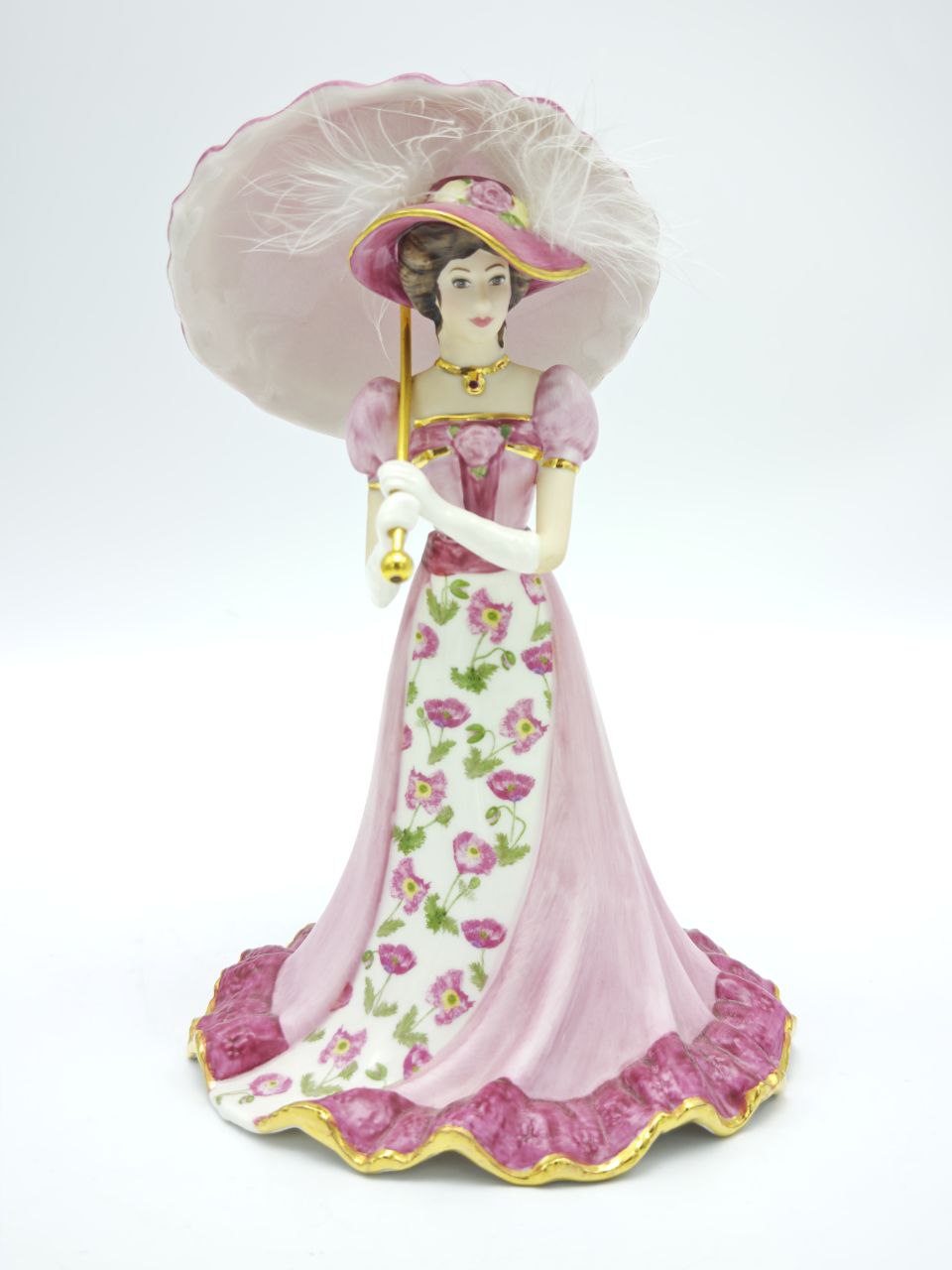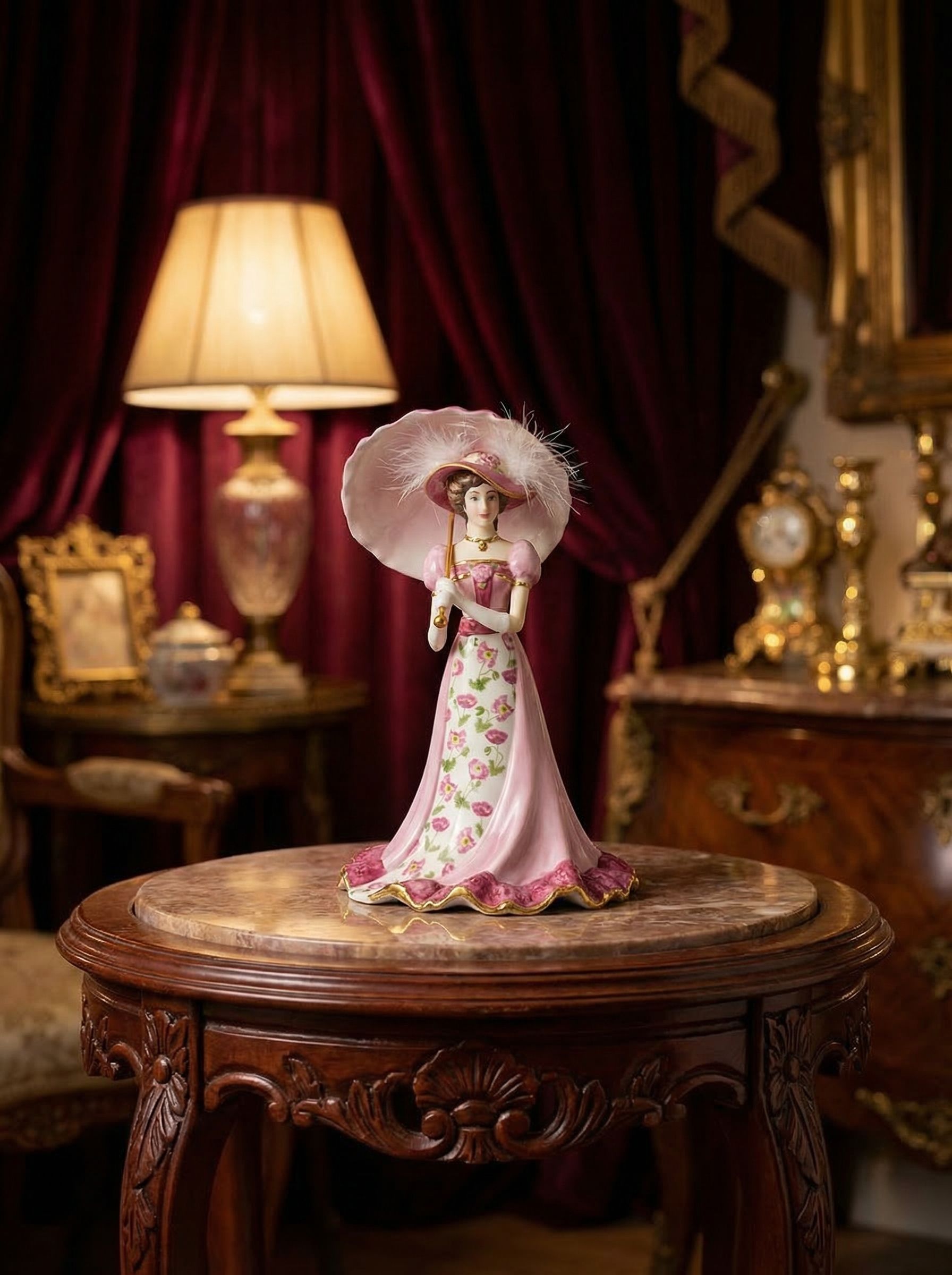 Изящная фарфоровая статуэтка-колокольчик «Crimson Belle» из коллекции Floral Elegance создана дизайнером Lena Liu в США в 1995 году. Фигура дамы в роскошном платье с цветочным декором дополнена утончённым зонтом с перьевым оформлением и позолотой. Детализированная ручная роспись подчёркивает тонкость линий и изысканность композиции. Высота изделия 17 см, вес 210 г — выразительный предмет для интерьера или коллекции.