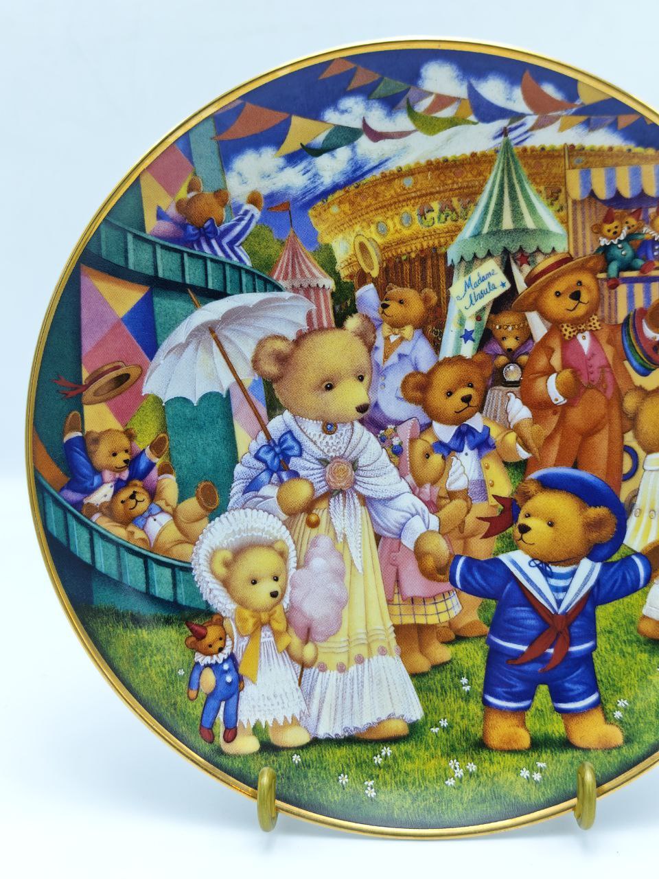 Эта очаровательная тарелка переносит в мир старинной ярмарки, где мишки-Тедди живут своей маленькой, тёплой и удивительно доброй жизнью. Иллюстрация художницы Carol Lawson — как кадр из детской сказки, выполненный в сочных цветах и обрамлённый тонкой позолотой. Лимитированное издание Franklin Mint делает предмет не просто декоративным, а по-настоящему коллекционным — таким, что хочется передавать дальше как семейную реликвию.Тарелка создаёт атмосферу уюта и ностальгии и станет акцентной деталью в интерьере, коллекции фарфора или в подарок тем, кто ценит тепло и историю вещей.
