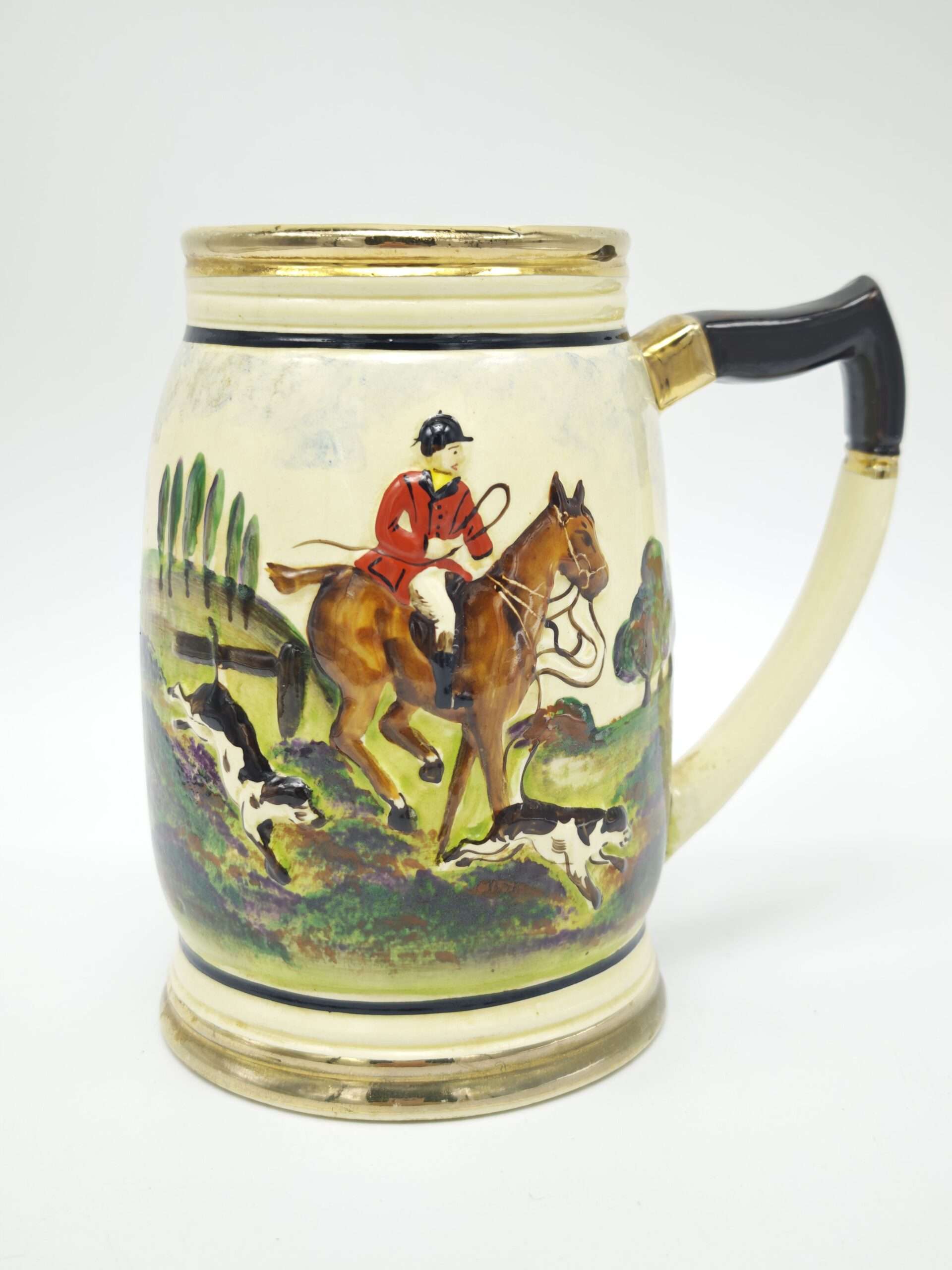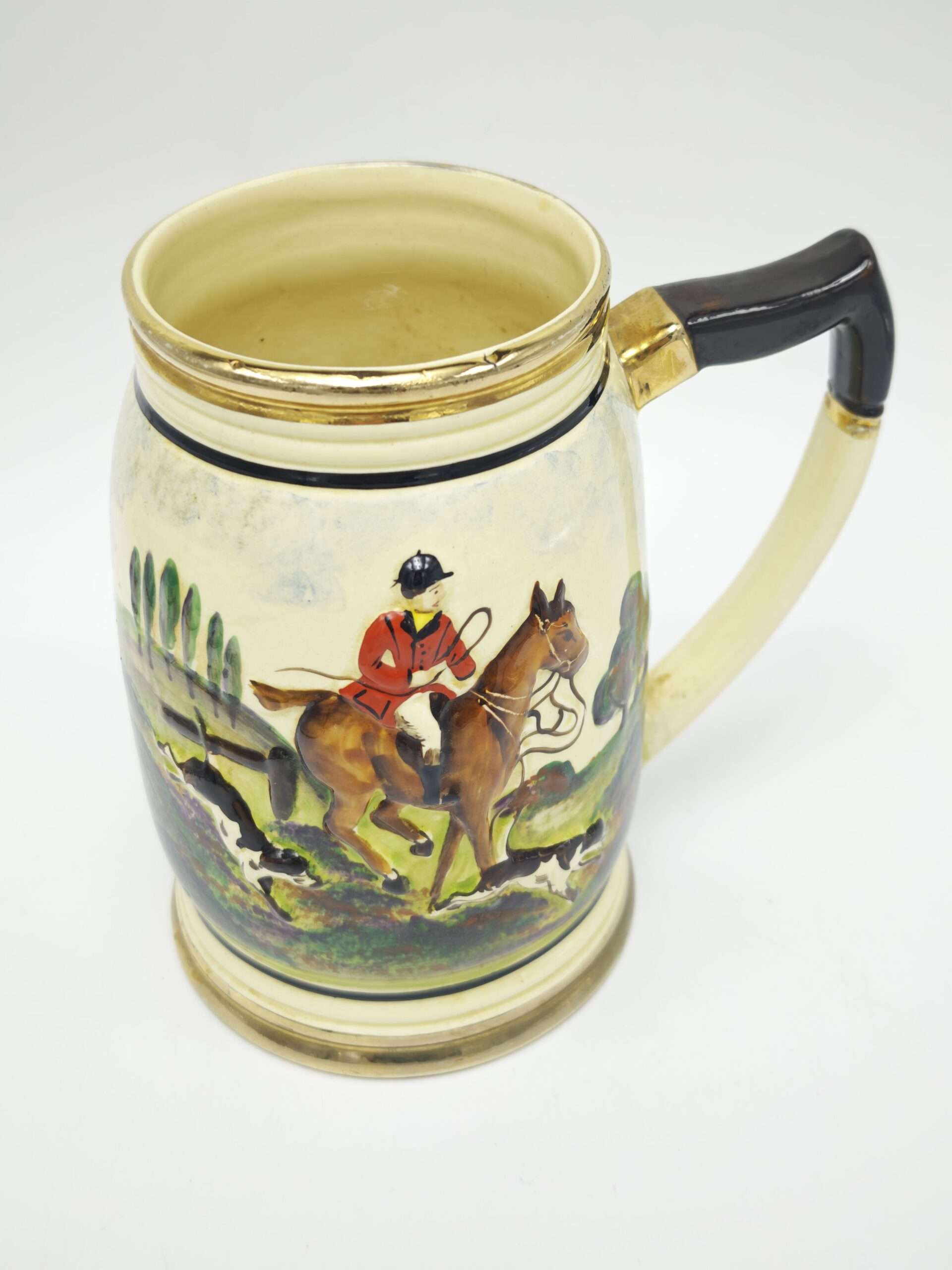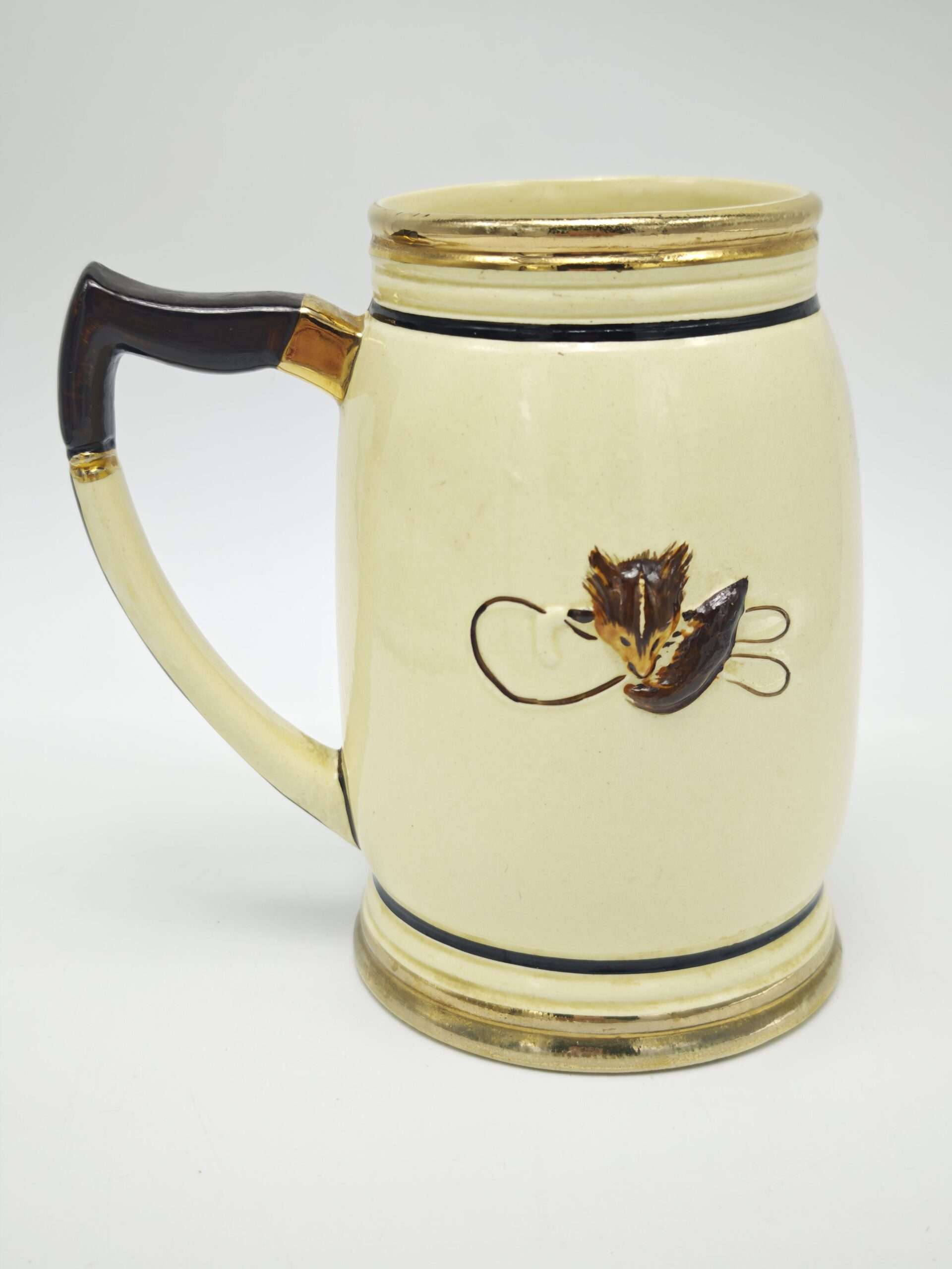 Коллекционная музыкальная пивная кружка «Охота». Рабочая. Ручная работа, керамика, роспись, позолота. Швейцария, фабрика Thorens, 40 годы XX века