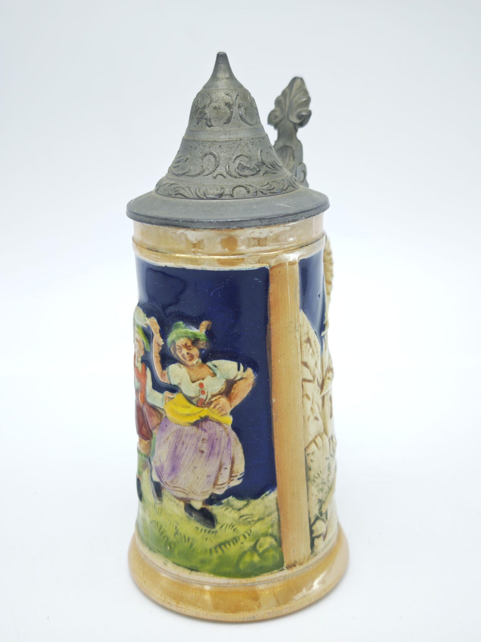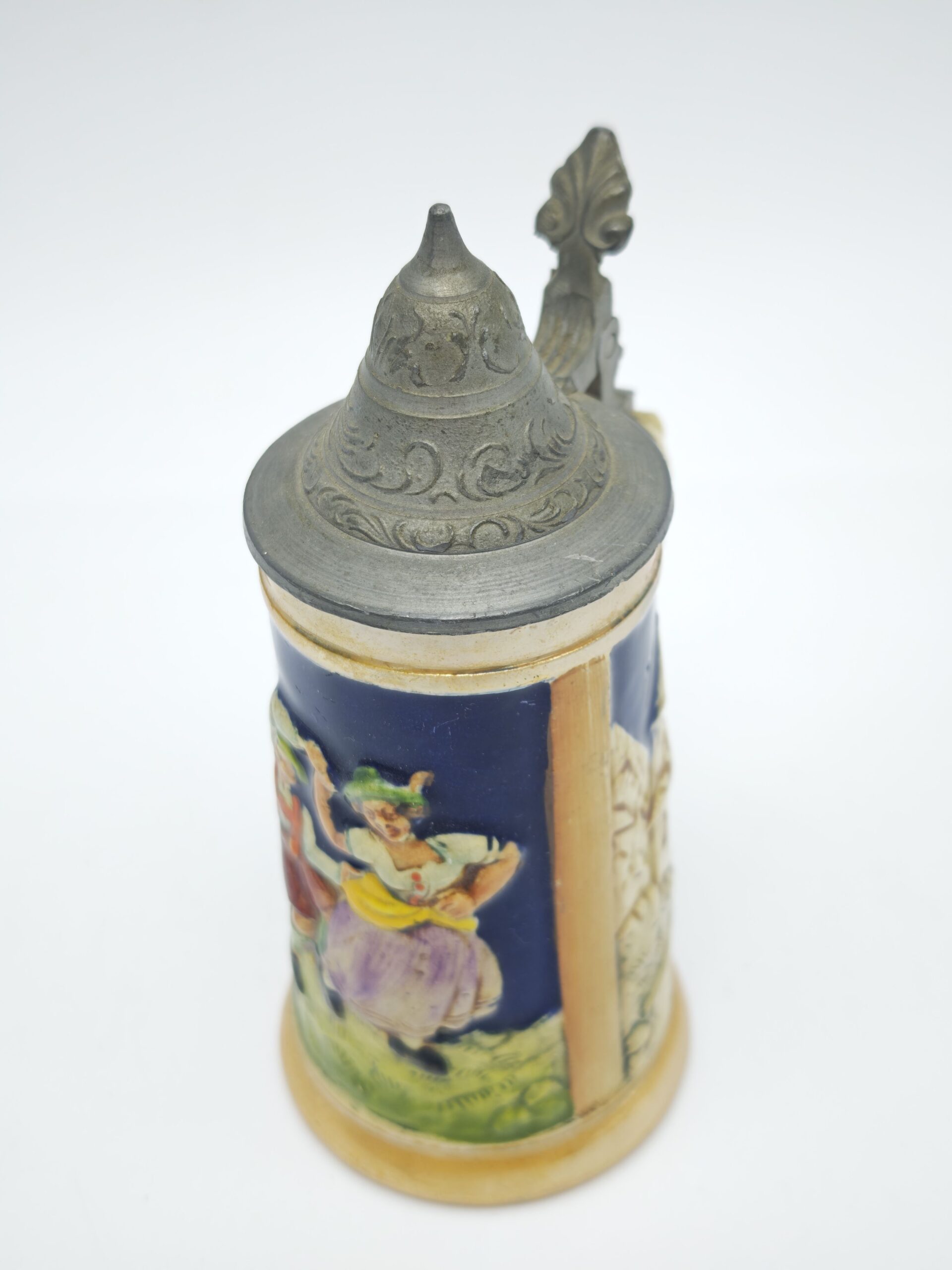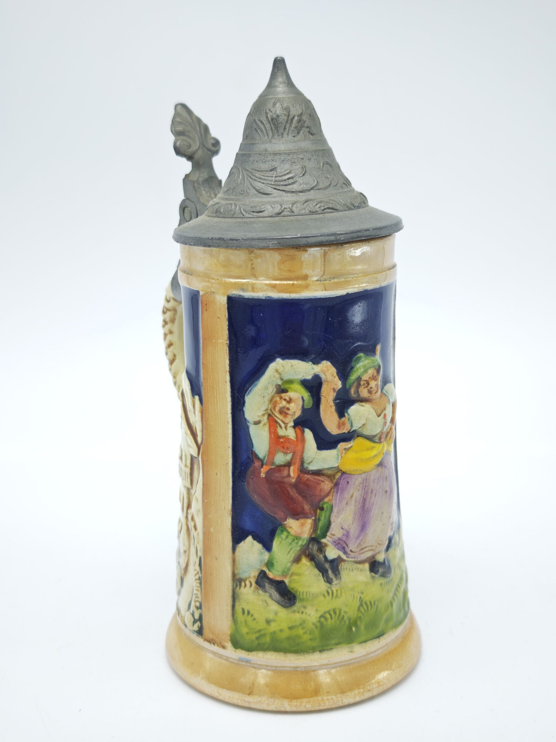 Коллекционная пивная кружка с крышкой. Керамика, рельеф, ручная работа, крышка — сплав металла. Германия 1970 года