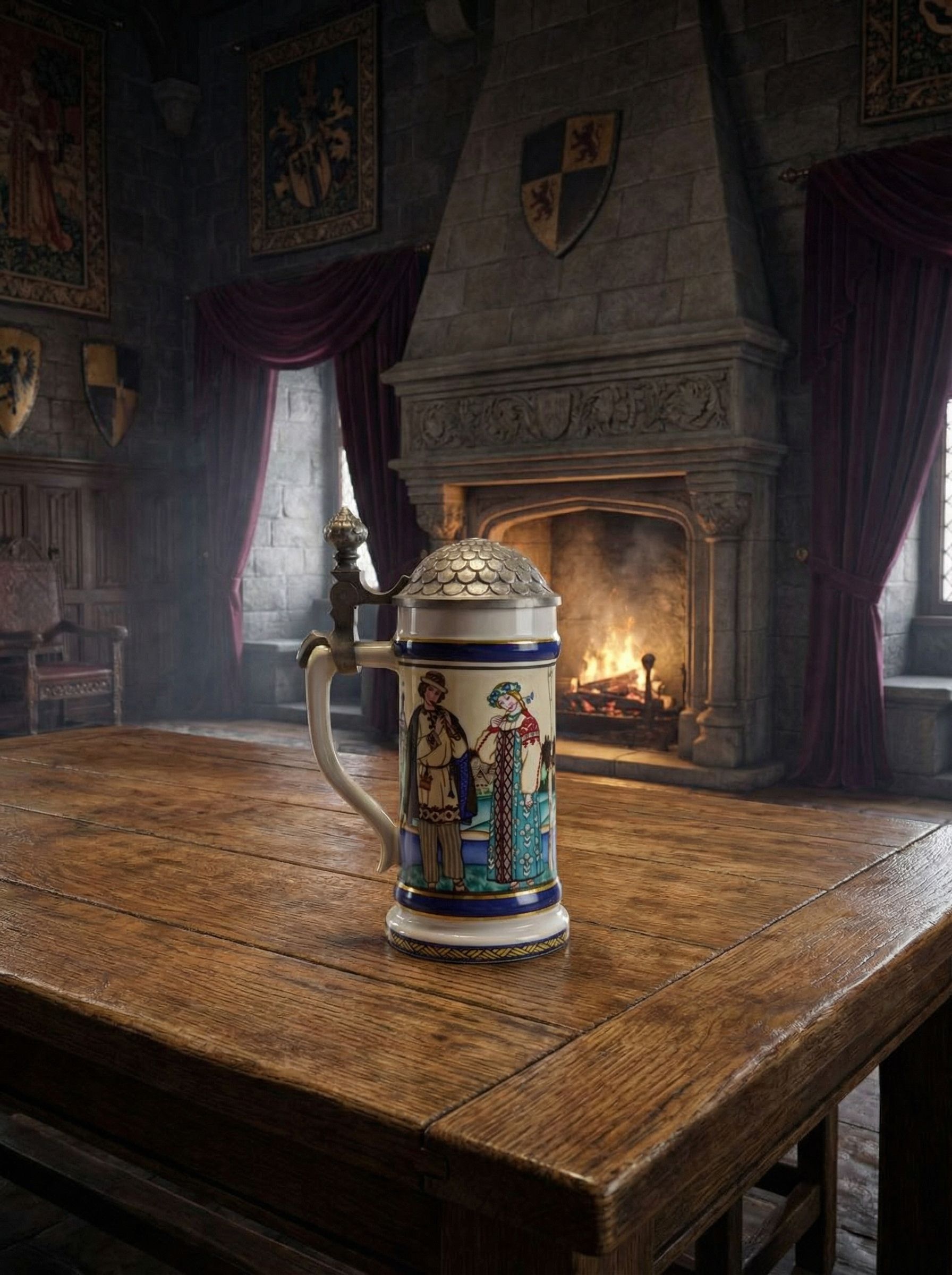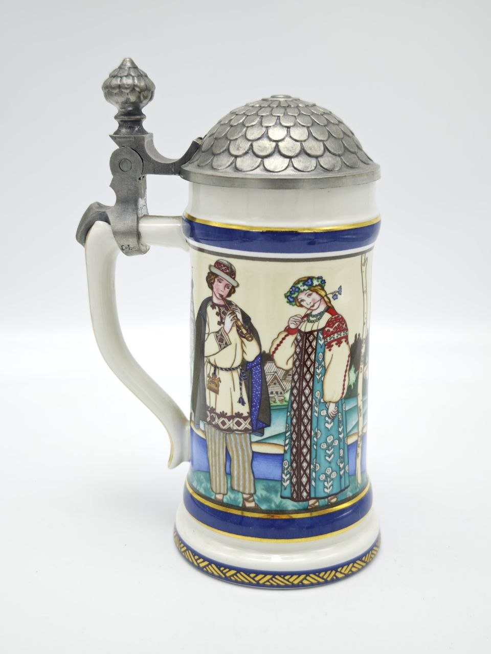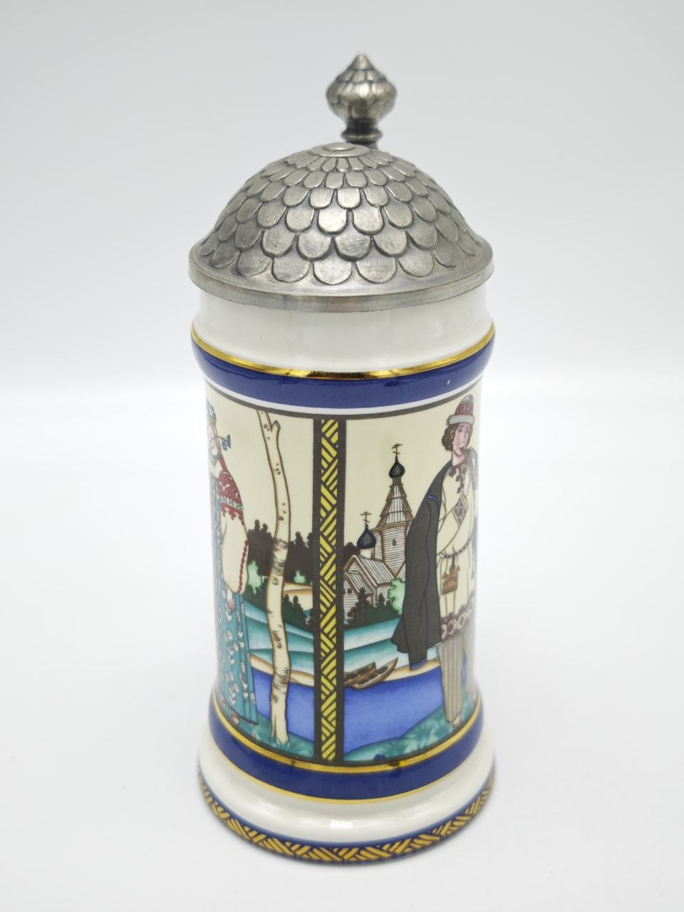 Коллекционная пивная кружка Villeroy&Boch выполнена из фарфора с художественной деколью по иллюстрациям Бориса Зворыкина из серии «Русские сказки». Сюжет «Снегурочка и Лель» передаёт атмосферу народного фольклора, дополненную насыщенными кобальтовыми элементами и позолотой. Крышка изготовлена из олова и украшена рельефным орнаментом, подчёркивающим классический стиль изделия. Высота кружки 15 см, в комплекте присутствует оригинальный сертификат подлинности, подтверждающий лимитированный выпуск. Отличное состояние делает предмет выразительным элементом коллекции и интерьера.