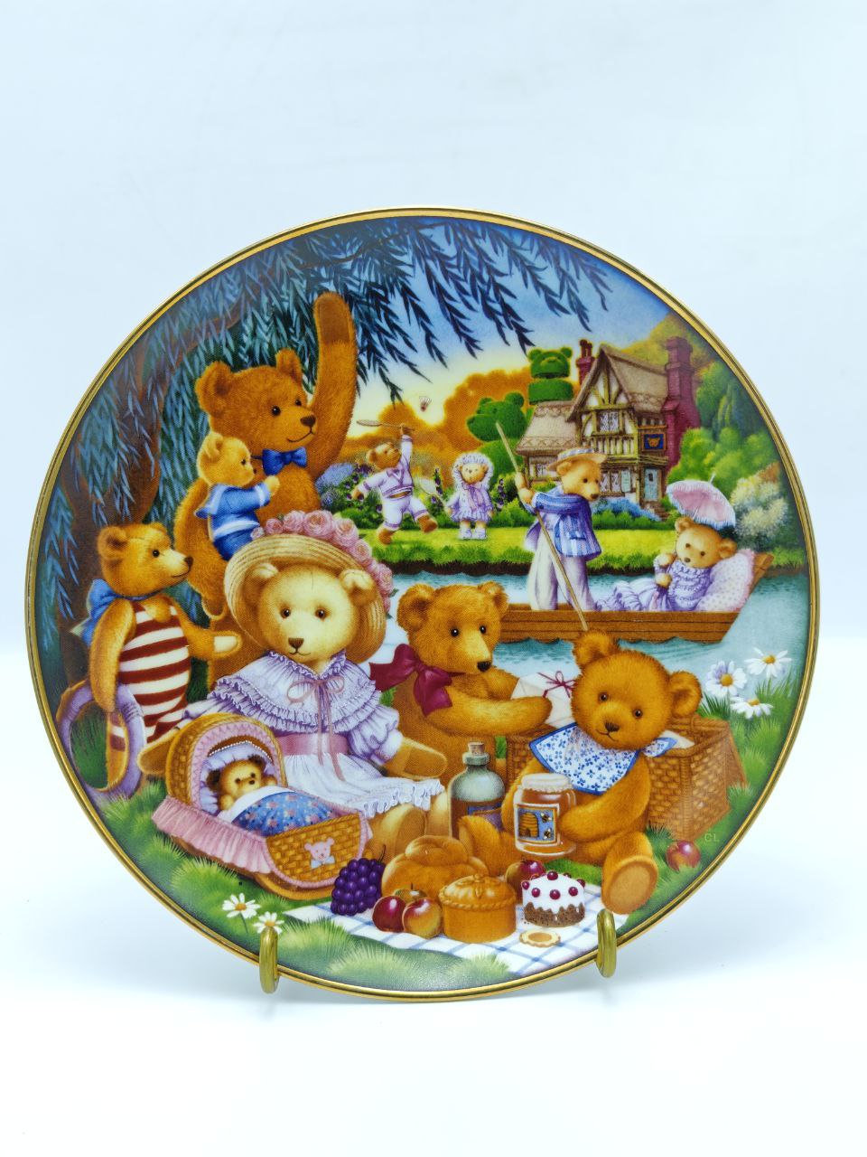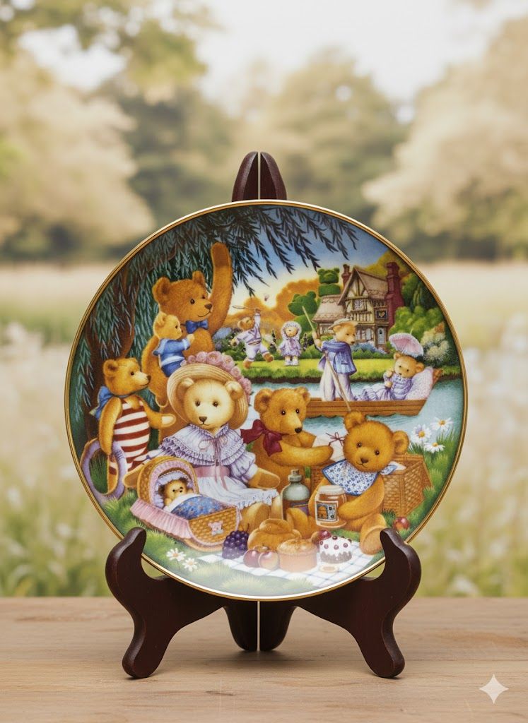 Эта тарелка — маленький портал в мир тёплого, беззаботного детства, созданный художницей Carol Lawson специально для Franklin Mint. Сцена пикника медвежат в викторианском парке оживает благодаря яркой деколи, мягким пастельным оттенкам и тонкой позолоте по краю. Каждая деталь — от корзинки с пирогами до блеска воды — передана почти сказочно. Лимитированный выпуск 1991 года делает тарелку особой находкой для коллекционеров, а её настроение наполняет дом уютом и ностальгией.