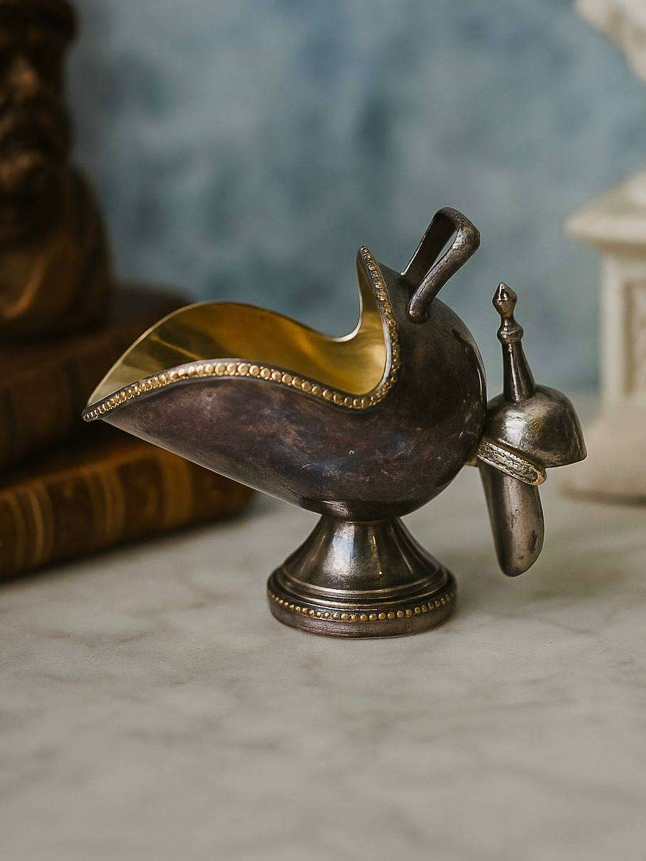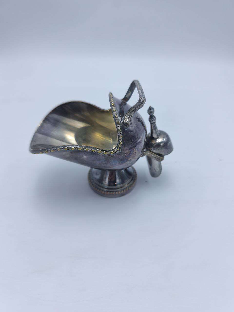 Эта винтажная сахарница, размер 12х10см, выполненная в форме кулинарного соуса, представляет собой уникальное сочетание утонченности и функциональности. Изготовленная из прочного металла и покрытая серебром, она сохраняет блеск, который привносит в интерьер нотку старины и элегантности. Внешняя часть сахарницы украшена искусно выполненным орнаментом, представляющим собой мотивы стилизованных листьев и ветвей, что придает изделию не только эстетическую привлекательность, но и ощущение прикосновения к истории.Форма этой сахарницы напоминает соусник благодаря своей овальной чаше с вытянутым носиком. Высокая ножка, на которой она стоит, обеспечивает устойчивость и подчеркивает изящество линий. Носик, изящно изогнутый, позволяет аккуратно насыпать сахар, не проливая и избегая лишних гранул на столе.Сахарница снабжена небольшой ручкой, делающей её использование более удобным. Благодаря такому дизайну, она идеально подходит для того, чтобы стать неотъемлемой частью утреннего чаепития или вечернего кофепития. Она легко может стать центральным элементом сервировки стола, притягивая взгляды гостей своей аристократической сутью.Особого внимания заслуживает покрытие, устойчивое к окислению, что делает этот предмет долговечным и практичным в использовании. Периодическое легкое полирование мягкой тканью вернет ей первоначальный блеск и подчеркивает природные рисунки. Винтажная сахарница становится не только функциональным предметом, но и предметом истории, который передается из поколения в поколение.Подобный предмет декора идеально подходит для коллекционеров, поклонников старинных вещей и ценителей высокого искусства. Он способен подчеркнуть завершенность и стиль любого интерьера, будь то классический или современный, добавляя оттенок времени и роскоши.