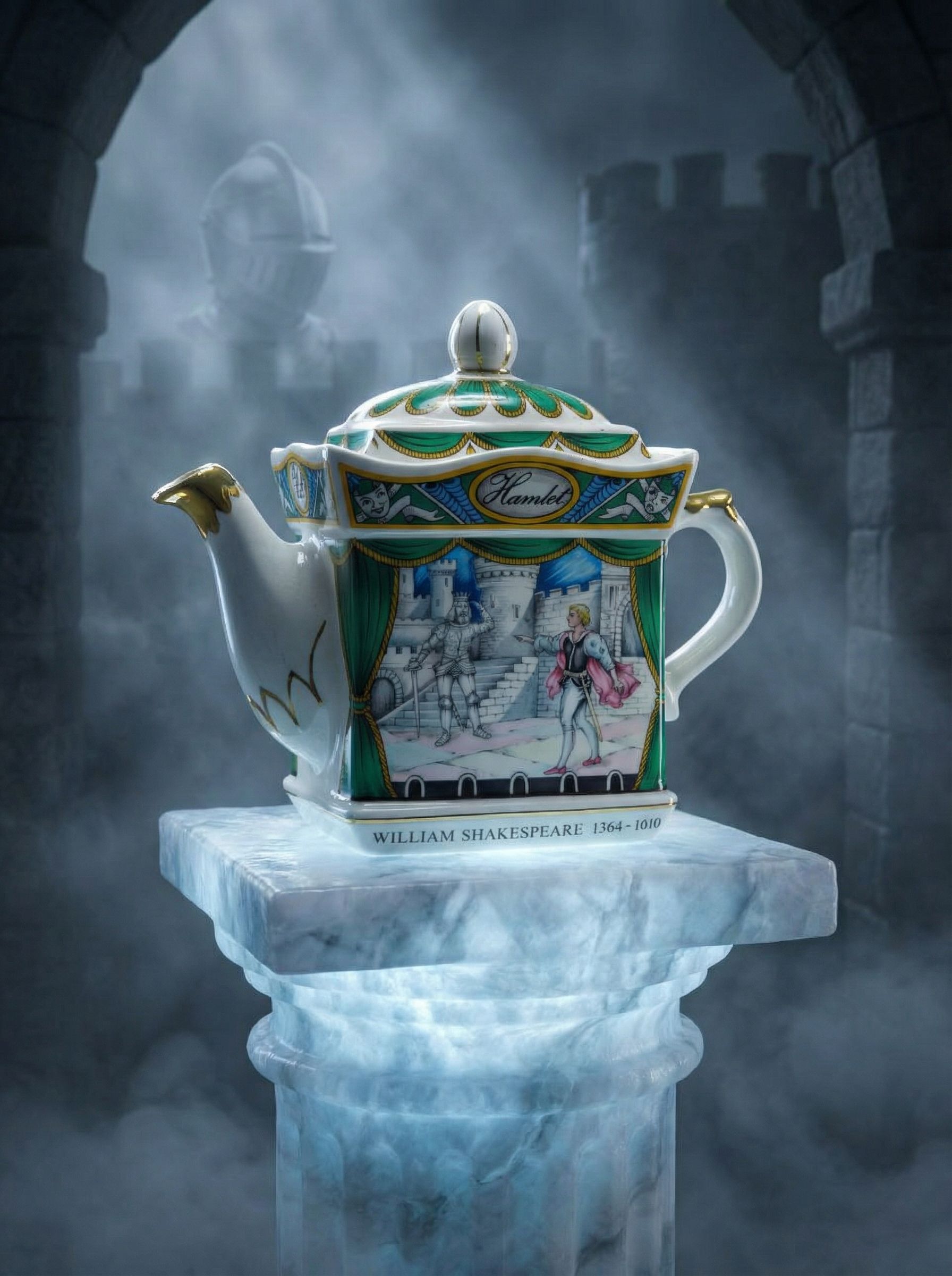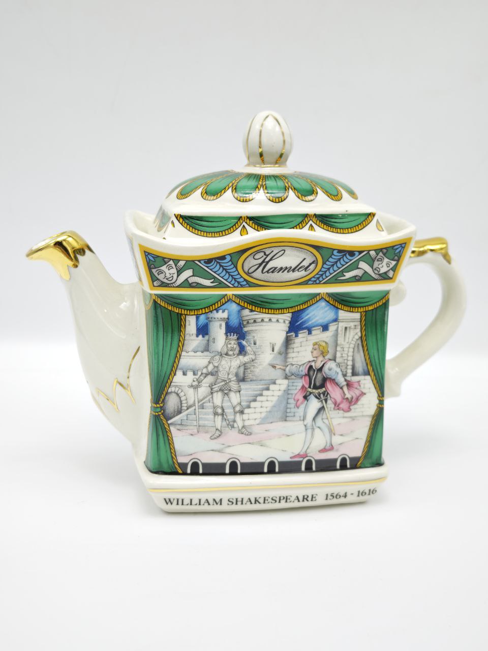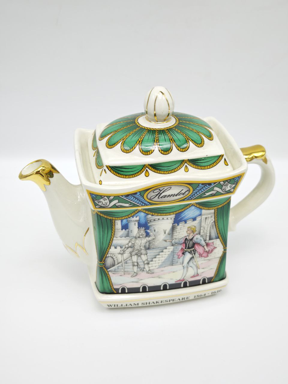 Редкий фарфоровый чайник Sadler из серии Classic Collection, посвящённый легендарной трагедии Уильяма Шекспира «Гамлет». Богатая ручная роспись, зелёные театральные портьеры и позолоченные детали создают эффект настоящей сценической декорации. Изделие станет ярким элементом интерьера, коллекционной жемчужиной и прекрасным подарком ценителям английского фарфора и классической литературы.