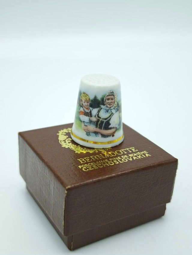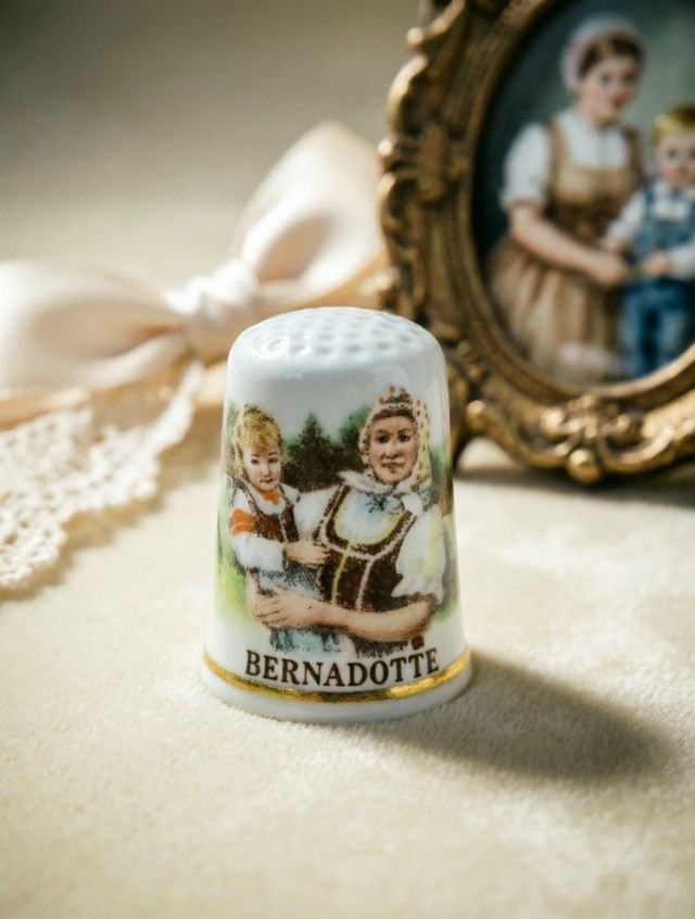 Bernadotte — известная чехословацкая мануфактура, специализировавшаяся на создании коллекционных напёрстков и миниатюрного фарфора с детальной росписью. Характерная маркировка с фирменным клеймом и названием «BERNADOTTE» на донышке подтверждает происхождение и возраст предмета.