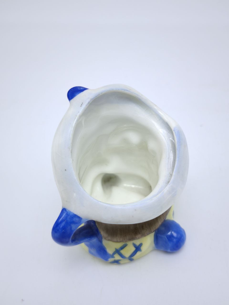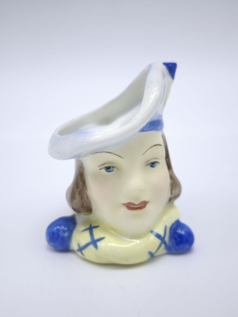 Винтажная кружка из фарфора в виде головы мужчины переносит нас в другую эпоху — эпоху, где внимание к деталям, художественное мастерство и любовь к декоративным предметам были в центре внимания. Уникальность этой кружки заключается в её сложной форме: вместо классического цилиндра перед нами ожившая фигура человеческой головы. Это может быть исторический персонаж или собирательный образ, но несомненно одно — такой предмет вызывает интерес с первого взгляда. Рельефные линии, подчёркнутая мимика мужчины и тщательно прорисованные волосы придают кружке неординарности. Глазурь гармонично распределена — блеск лица и более матовые детали одежды или аксессуаров дополняют общую картину. Подобные элементы доказывают высочайший профессионализм мастеров, работавших над этим изделием. Эта кружка подходит как для интерьера в стиле ретро, так и для более современных площадок, где акценты на исторических вещах играют ключевую роль. Она может стать частью коллекции редких фарфоровых изделий, винтажной атрибутики или тематической экспозиции. В то же время, её можно использовать в качестве уникального домашнего аксессуара — например, как вазу для милых мелочей, таких как перья, кисточки или сухие травы. Этот предмет переносит дух времени и является свидетельством высокого уровня мастерства прошедших лет.