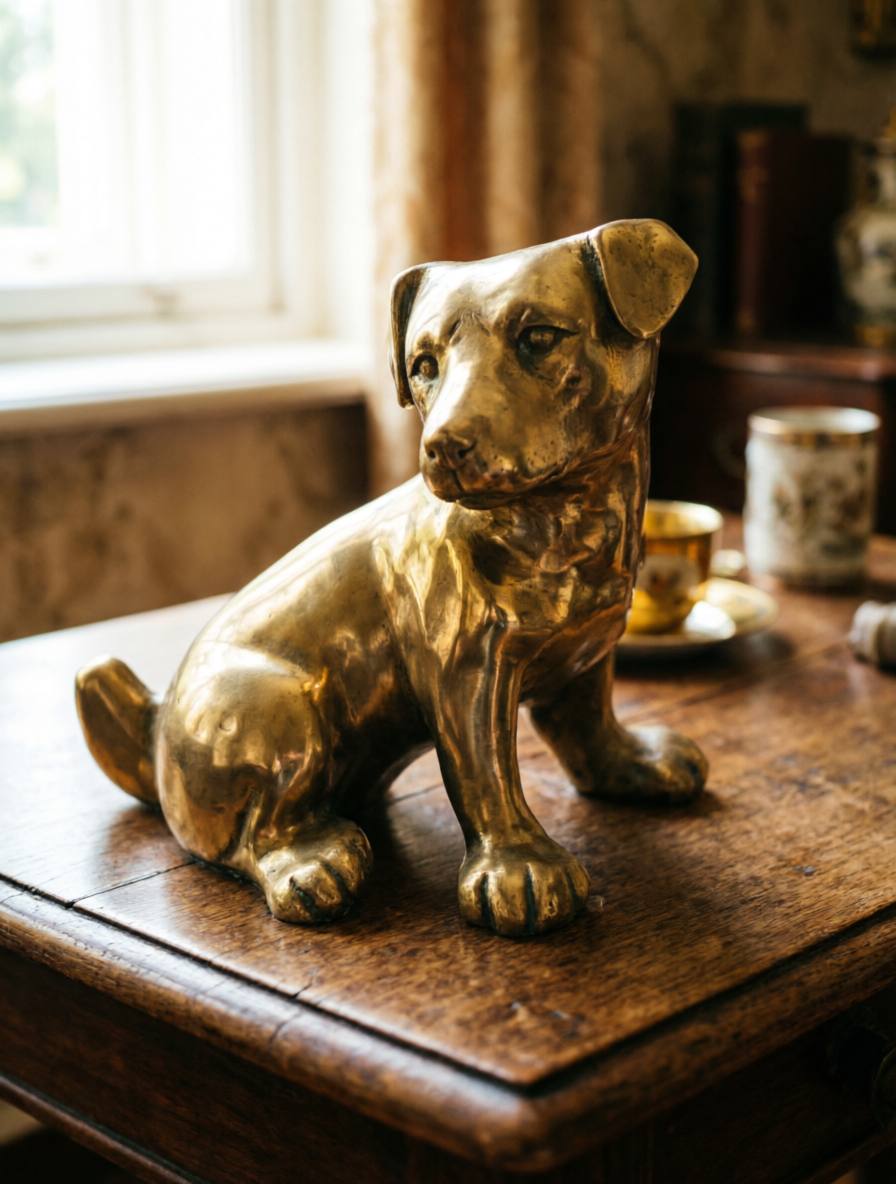 Аутентичная латунная статуэтка XX века. Статуэтка собаки, отлитая из цельной латуни, — редкий артефакт английской декоративной пластики. Фигура выполнена в реалистичном стиле: сидящая собака с пристальным взглядом, детализированными лапами и ушами. Поверхность покрыта естественной патиной — признаком подлинного возраста и бережного хранения. Никакой позолоты, гальваники или покрытий — это чистая латунь, как было принято в мастерских XIX века. Статуэтка не имеет клейма на дне (если видно — уточните), но стилистически соответствует продукции английских литейных (например, *Hunt & Roskell*, * Elkington*).