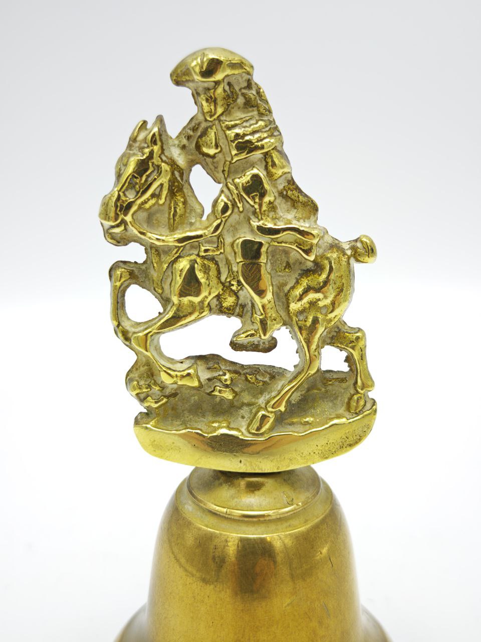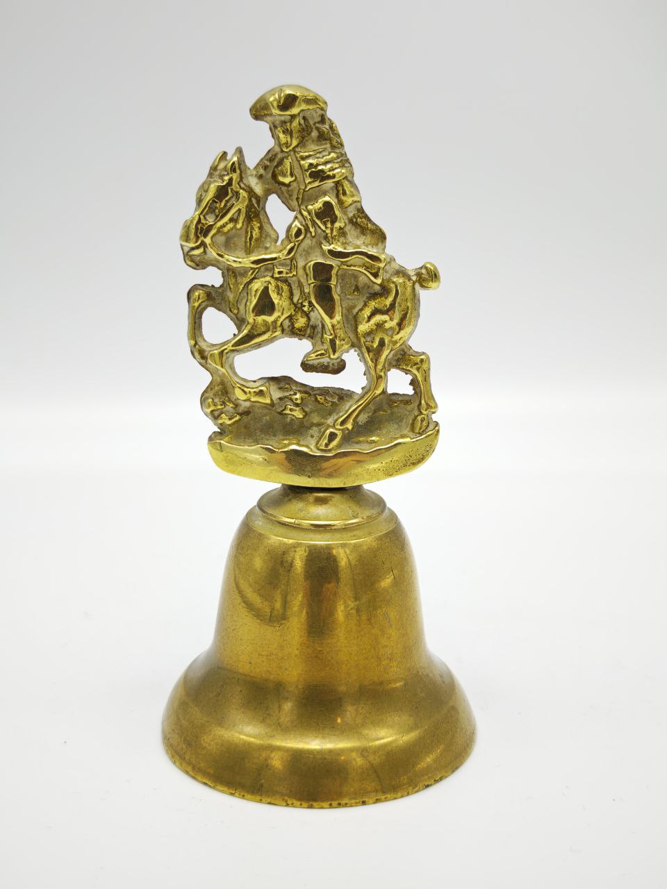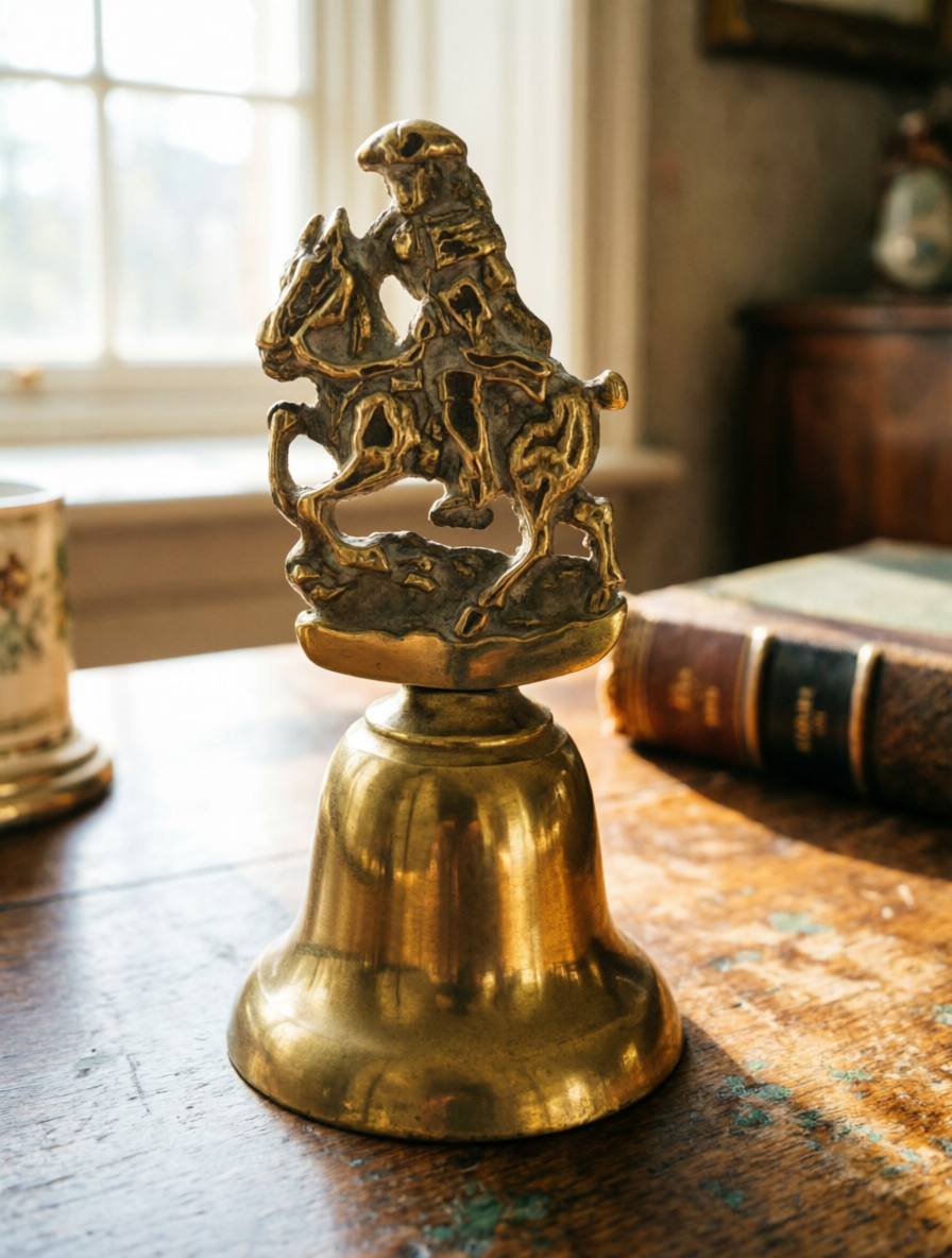 Аутентичный латунный колокольчик эпохи Виктории. Колокольчик, отлитый из цельной латуни, — редкий артефакт английской декоративной пластики XX века. Основание — классический колокол с гладкой поверхностью, на вершине — объёмная фигурка всадника в треугольной шляпе, скакущего на коне. Детали (лицо, седло, мускулатура коня) переданы с характерной для викторианских изделий выразительностью. Поверхность покрыта естественной патиной: участки потемнения и лёгкий зеленоватый налёт (патина меди) подчёркивают возраст и подлинность. Никакой позолоты, гальваники или современных покрытий — это чистая латунь, как было принято в мастерских того времени. Колокольчик не имеет видимого клейма (если на дне есть — уточните), но стилистически соответствует продукции ведущих английских литейных (например, *Hunt & Roskell*, *Elkington*).