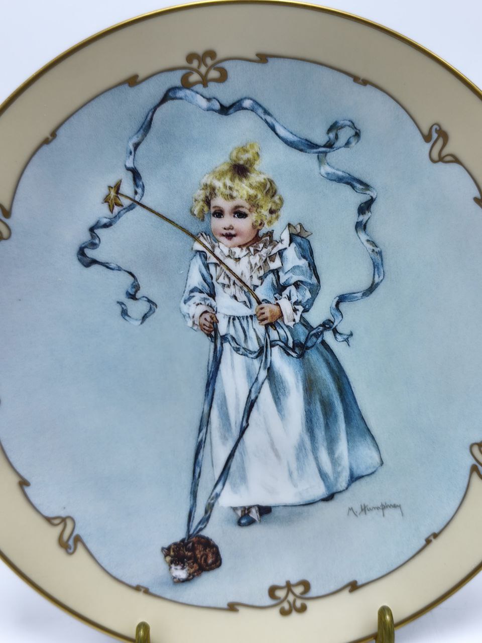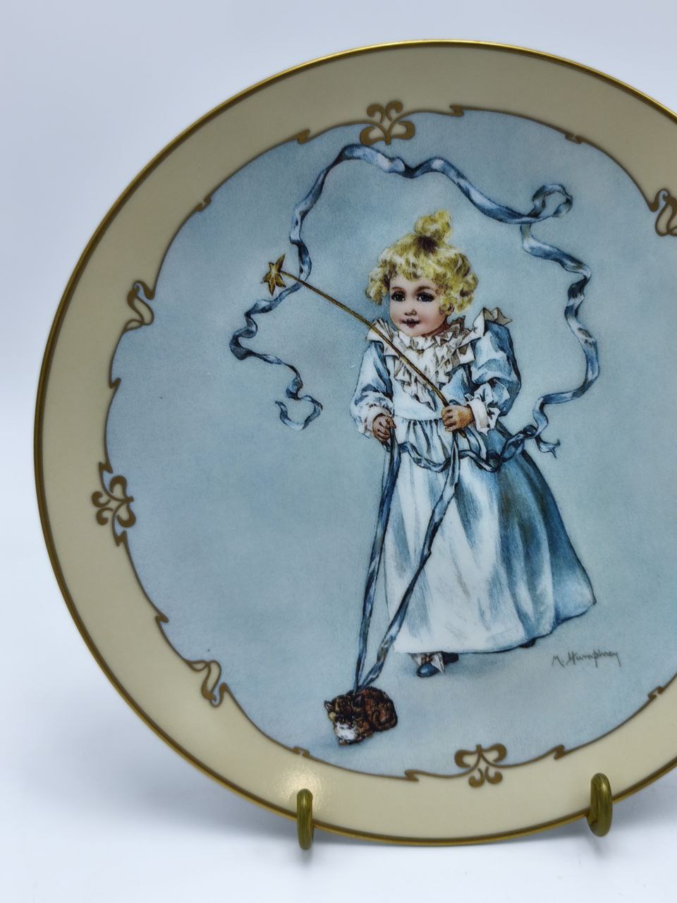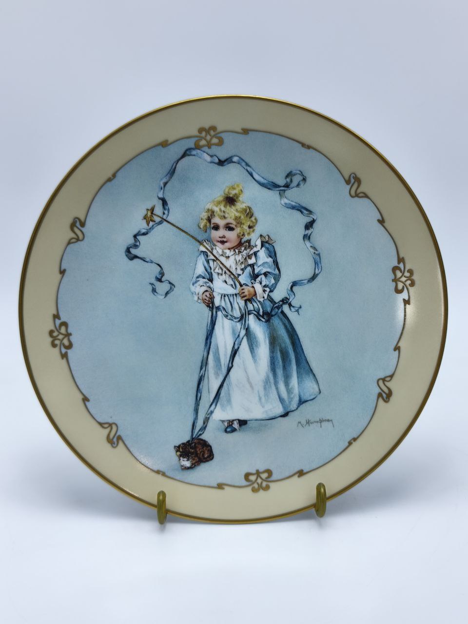 Эта изысканная лимитированная коллекционная тарелка из фарфора под названием «Магический котенок» станет настоящей жемчужиной вашего интерьера или ценным подарком для коллекционеров искусства. На тарелке изображена сцена из викторианских времен, где девочка в элегантном голубом платье играет с палочкой и нежным котенком, создавая атмосферу детской невинности и волшебства. Это произведение искусства перенесет вас в эпоху утонченности и изящества, передавая чувства радости, умиротворения и нежности.Дизайн тарелки был разработан талантливым художником Мод Хамфри Богарт, которая славится своими очаровательными изображениями викторианских детей. Она умело передала детали композиции — изящные волны ленты, которую держит девочка, и милый котенок у её ног. Всё это окружено элегантным орнаментом золотого цвета, придающим изделию утонченный и аристократический вид.Тарелка выполнена из высококачественного фарфора, известного своей прочностью и нежным блеском. Изделие имеет ограниченный тираж, о чём свидетельствует уникальный номер на обратной стороне. Несмотря на декоративное назначение, тарелка создана с тщательной проработкой деталей и использует премиум-красители, которые помогают сохранить яркость изображения долгие годы.Эта тарелка из коллекции «Маленькие леди» представляет собой не только дань викторианскому искусству, но и идеальный элемент для оформления интерьера в стиле винтаж, классика или романтика. Уместная как часть вашей коллекции, так и в качестве подарка для любителей декоративного искусства, она привнесет нотку изящества и истории в любое пространство.