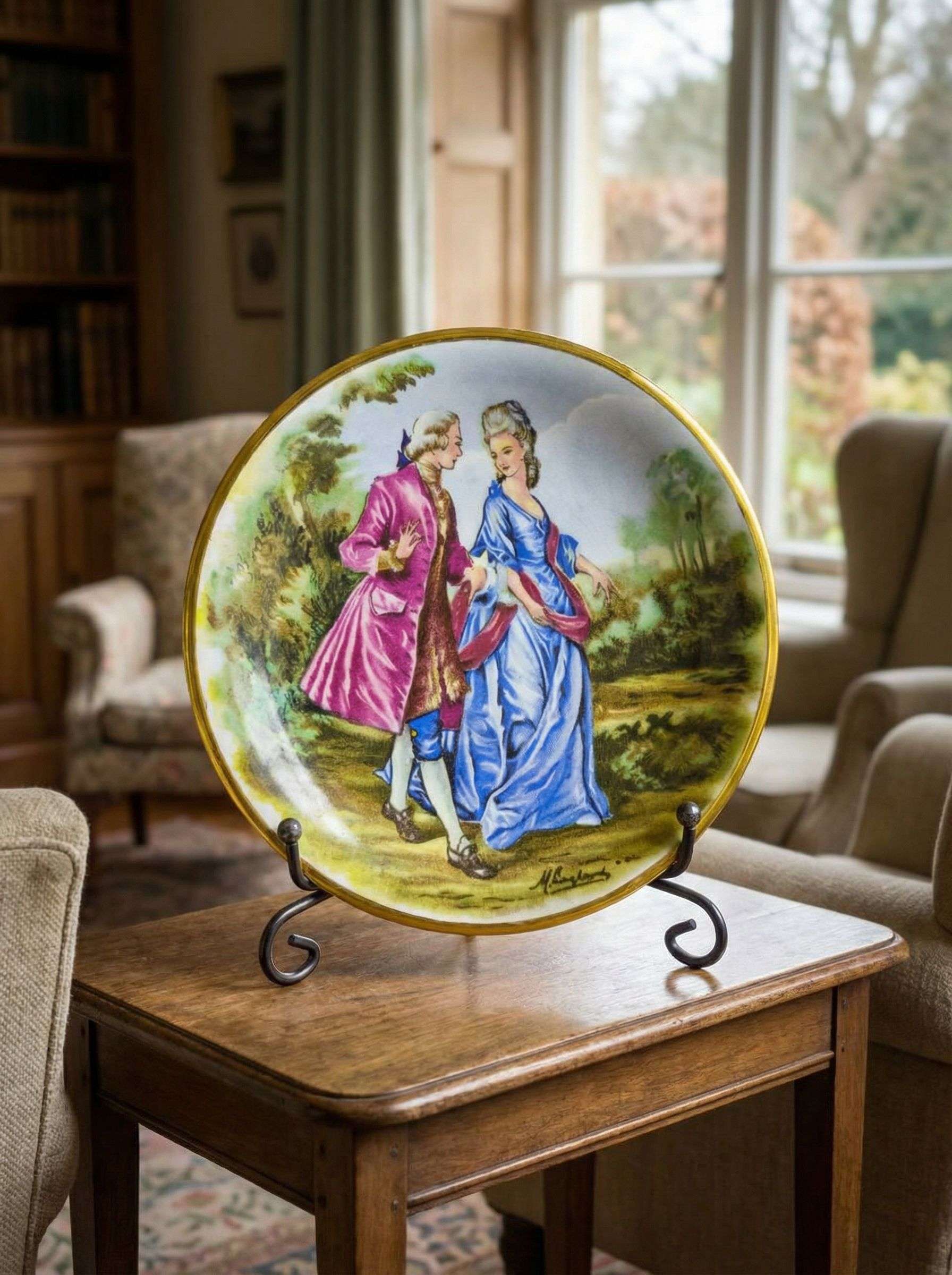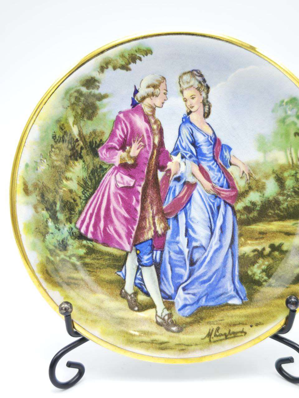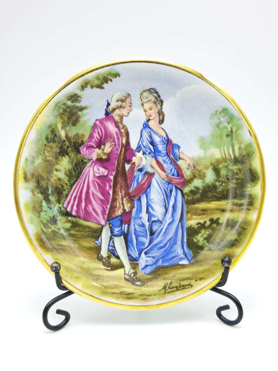 Миниатюрная декоративная настенная тарелка выполнена из фарфора с деколью и позолотой по краю. Изготовлена в Англии в 1950 году фабрикой Harry Hancock (Tunstall) Ltd, серия Rydalia Ware, бренд указан на оборотной стороне. Сюжет с прогулкой галантной пары передаёт атмосферу английской пасторальной живописи XVIII века, характерную для декоративного фарфора середины XX столетия. Диаметр тарелки — 12 см, что делает её аккуратным интерьерным акцентом для настенных композиций и витрин. На изделии присутствует скол, отражённый на фото, который учтён в цене.
