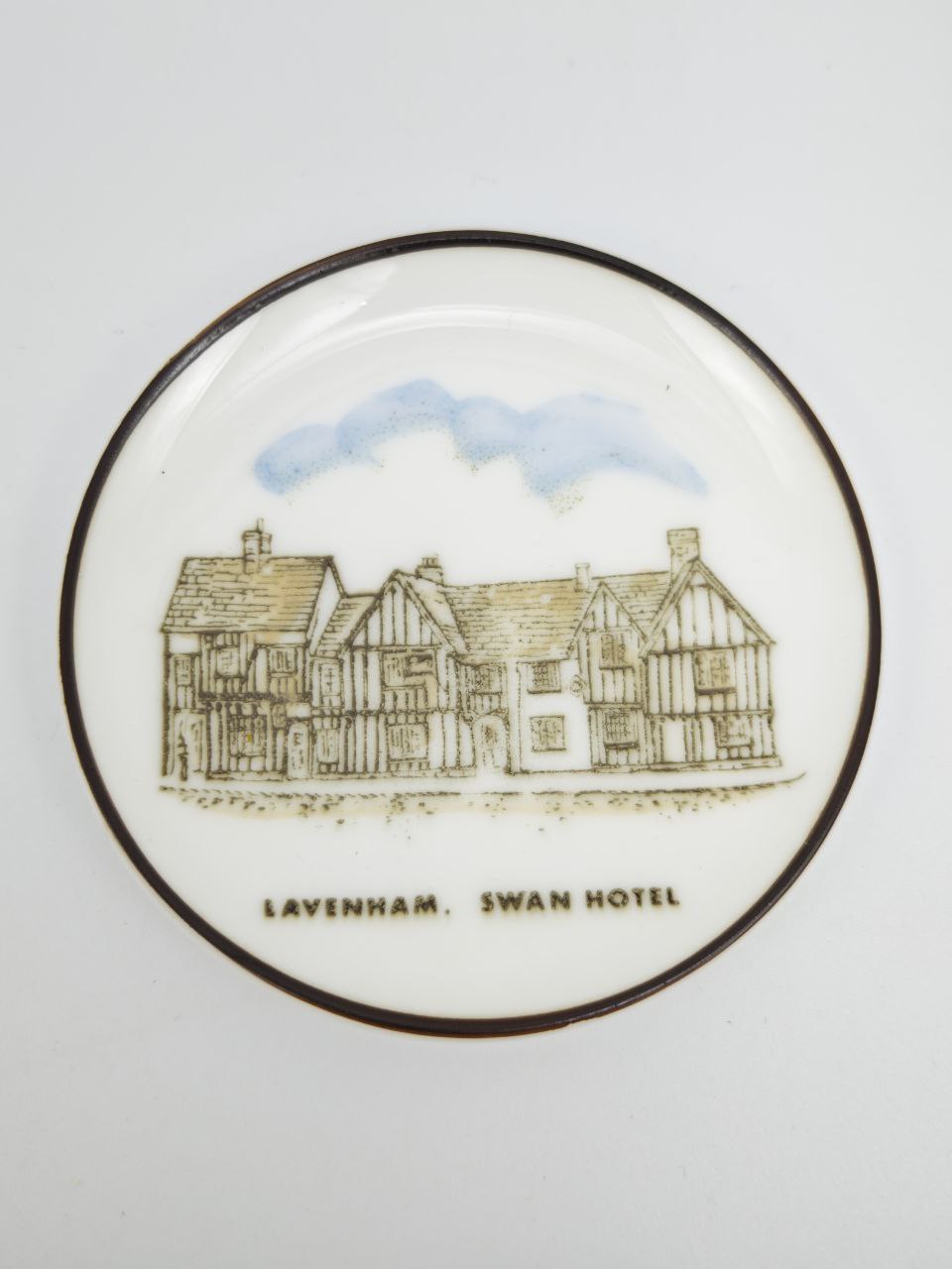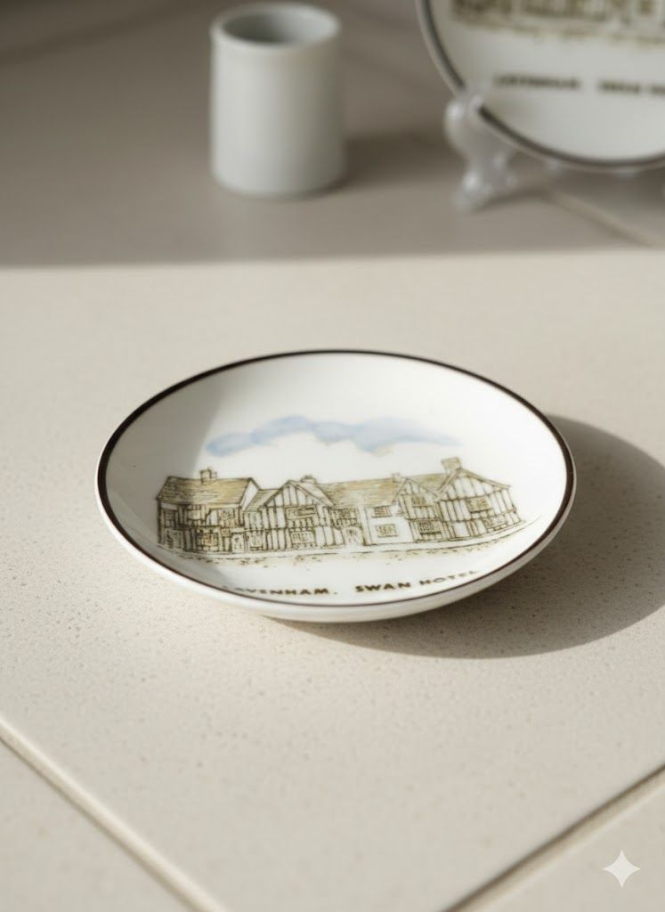 Коллекционная тарелочка из тончайшего английского костяного фарфора Coalport, с изображением исторического отеля Swan Hotel в Лавенхэме. Аккуратный рисунок выполнен в традиционной британской манере середины XX века. Идеальный сувенир для коллекционеров английского фарфора и ценителей архитектурных зарисовок. Изящный размер позволяет использовать тарелочку как декоративный акцент или часть большой коллекции.