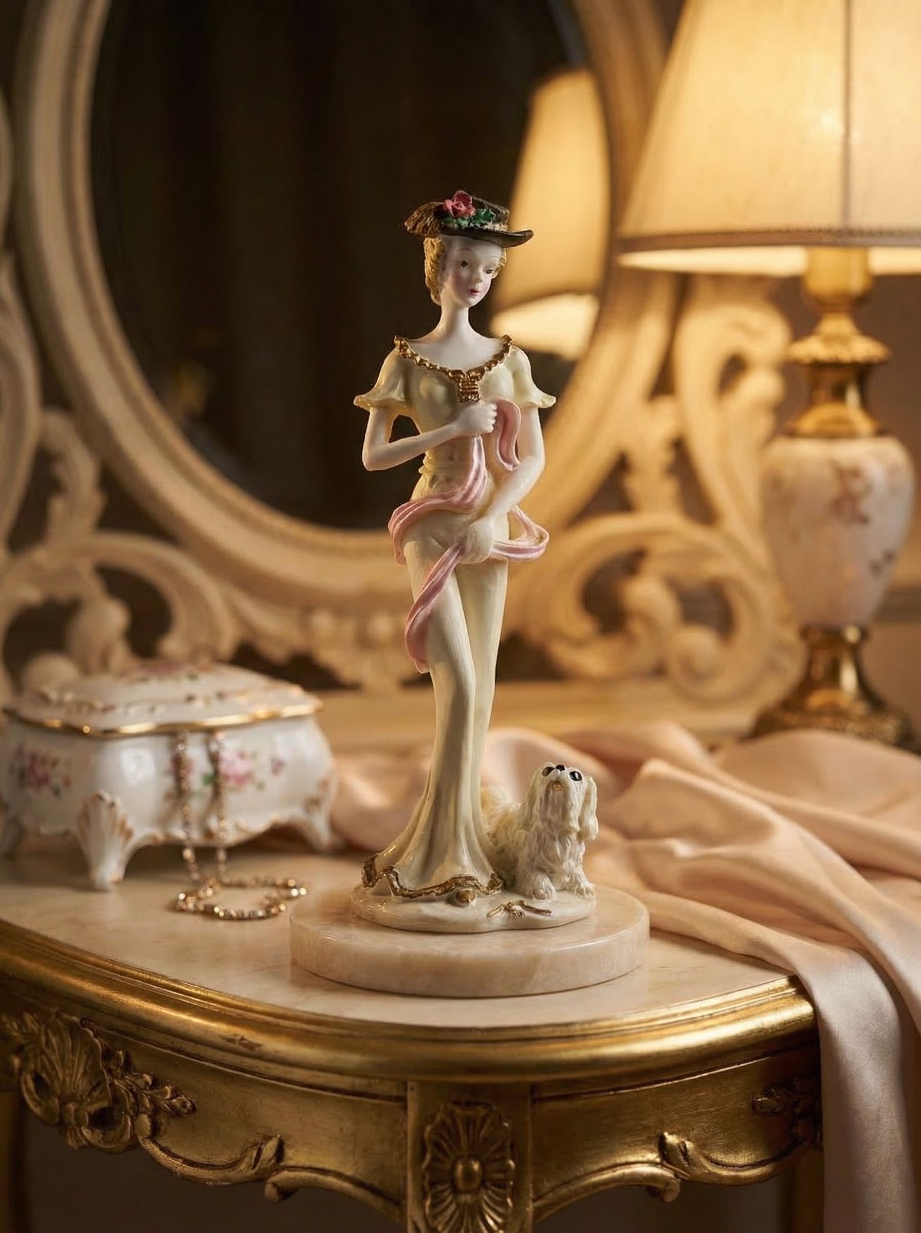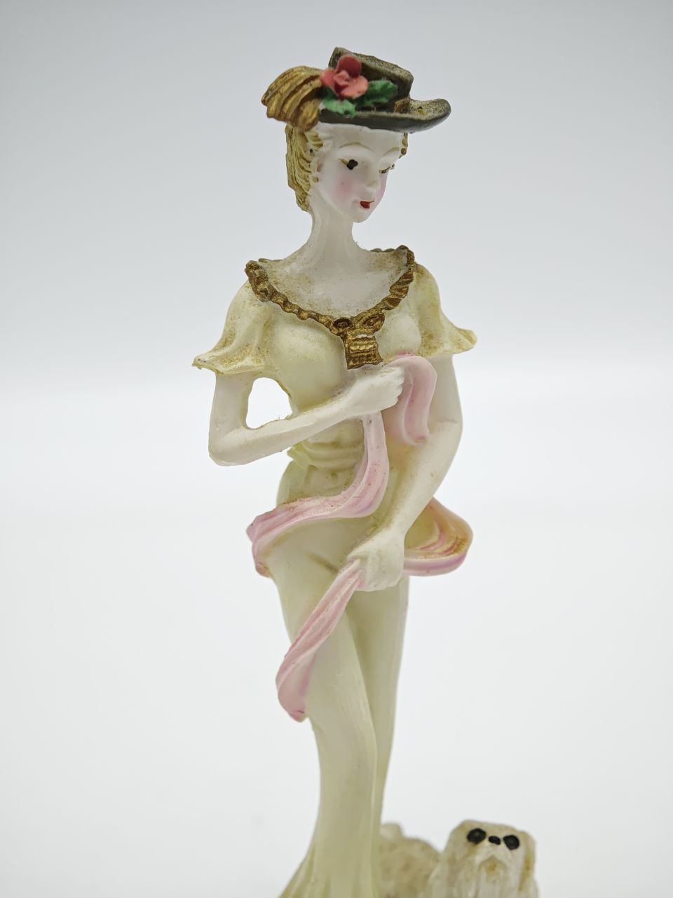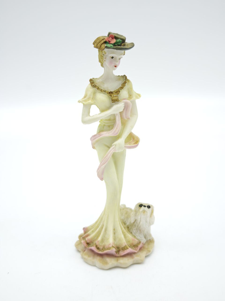 Изящная миниатюрная статуэтка изображает элегантную даму в длинном платье и шляпке с цветком, рядом с которой стоит маленькая собачка. Фигура выполнена из холодного фарфора и аккуратно расписана в мягких пастельных оттенках с золотистыми декоративными элементами. Детали лица, складки платья и аксессуары выполнены с тонкой проработкой, что придает композиции выразительность. Высота статуэтки — 10 см, вес — 15 г.