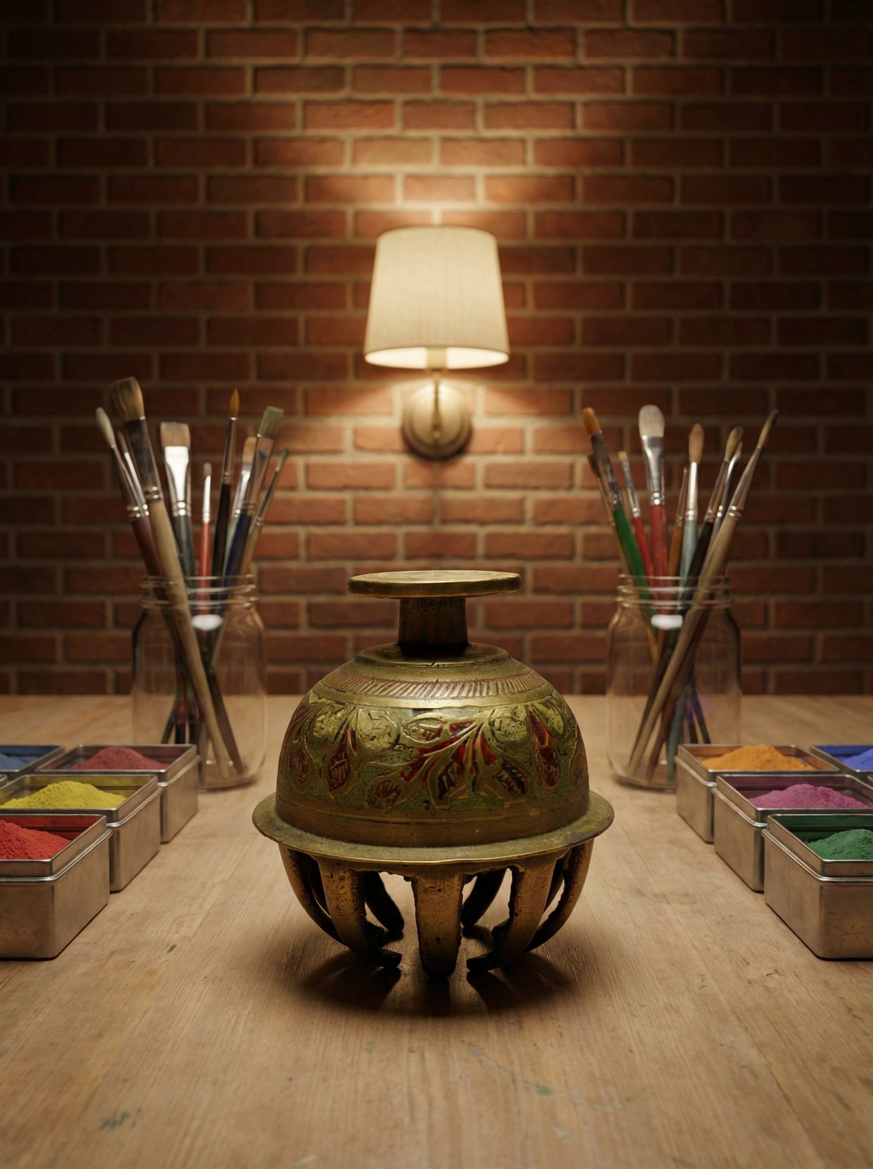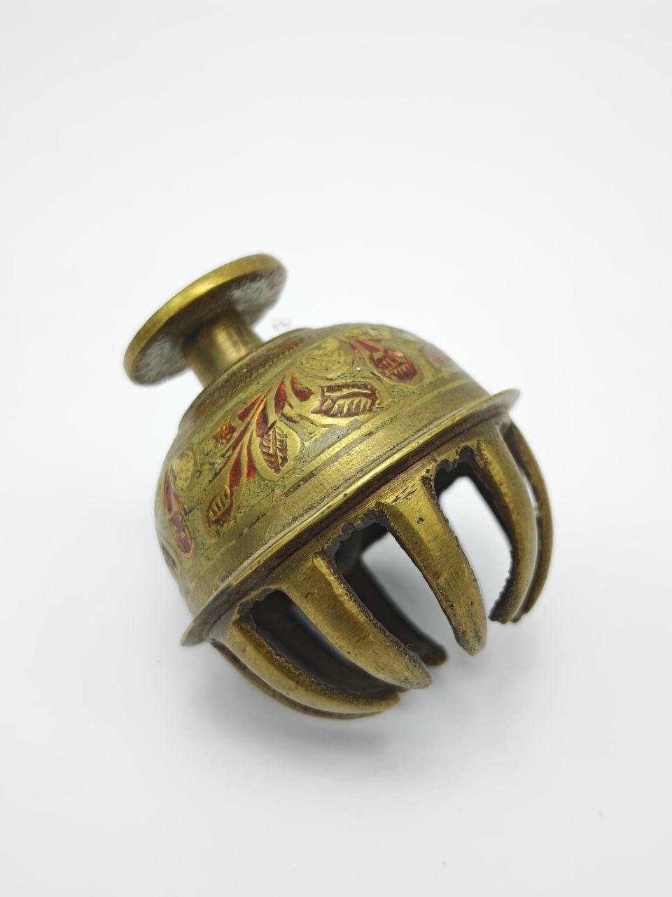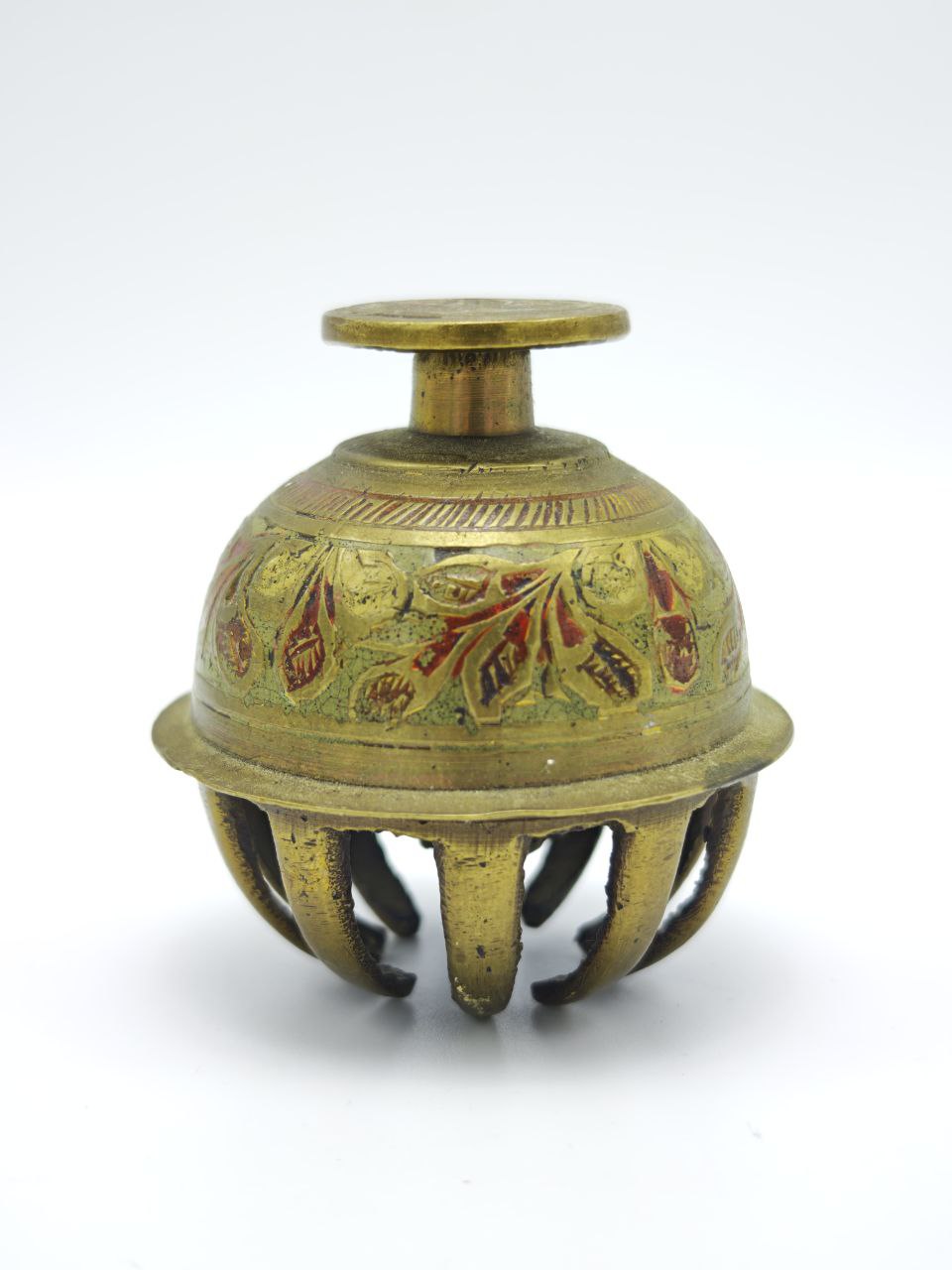Англия, 1968 год. Компактный латунный колокольчик с ручной цветной эмалью выполнен в декоративной технике с растительным орнаментом. Размер 5×5 см делает его аккуратным, но выразительным интерьерным акцентом, а вес 60 г подчёркивает цельнолитую основу. Купол украшен тёплой палитрой — охра, красный и зелёный оттенки мягко сочетаются с золотистой латунью. Звучание лёгкое, чистое, с коротким звонким откликом.