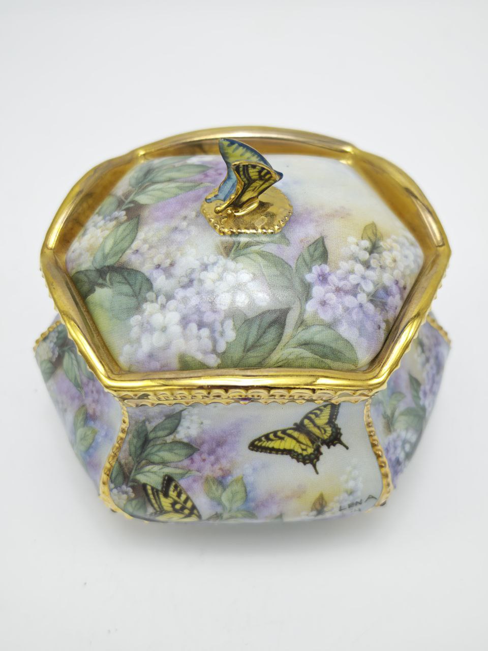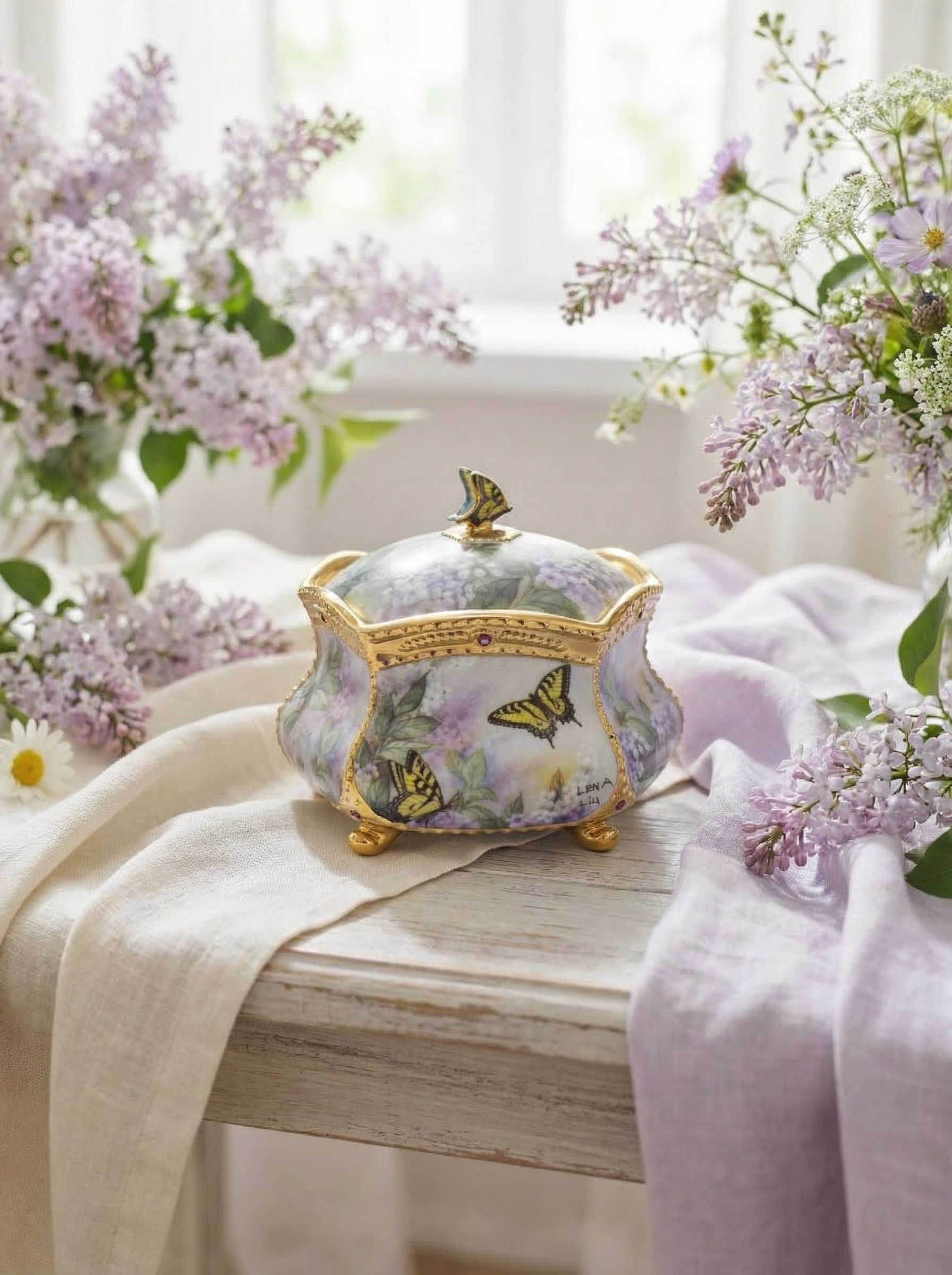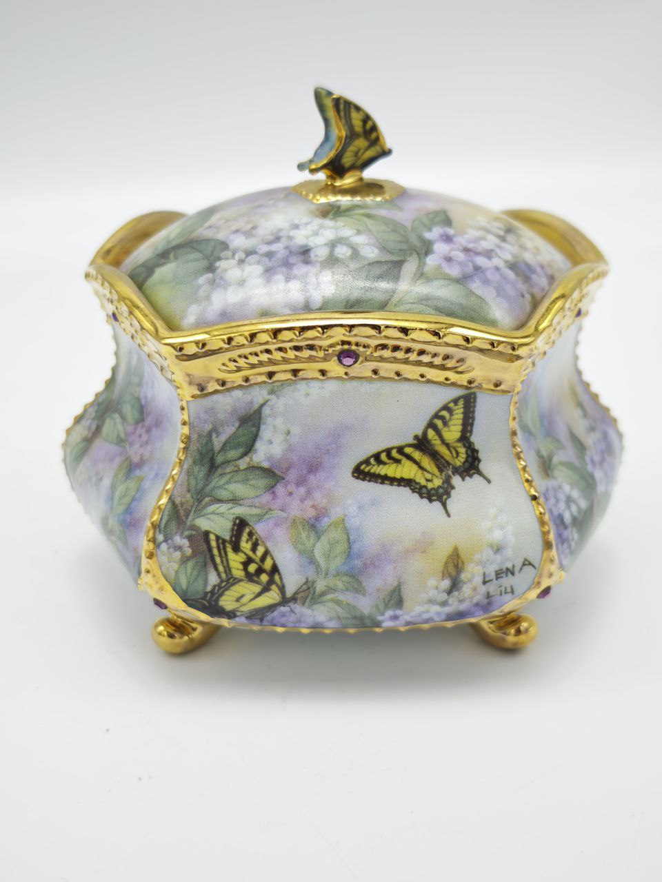 Фарфоровая музыкальная шкатулка с изящным цветочным декором и изображениями бабочек, выполненными в технике деколи. Компактный размер 10×9 см позволяет разместить её в любой интерьерной зоне — от спальни до витрины. Позолоченные элементы и декоративные камни придают изделию выразительный и утончённый вид. Внутри установлен музыкальный механизм с мелодией You Are So Beautiful. Бренд: Lena Liu (Ardleigh Elliott).