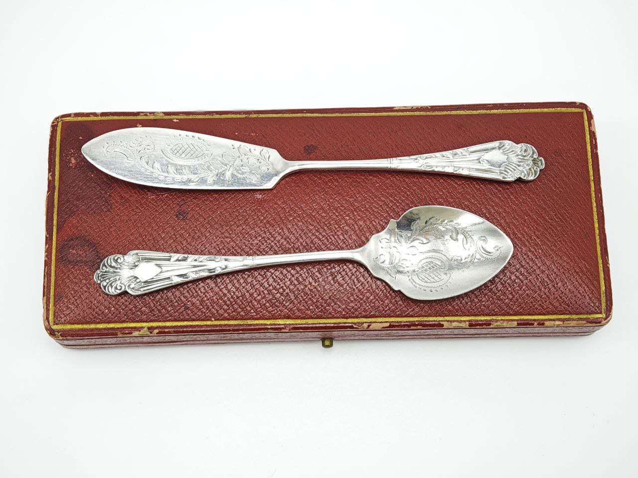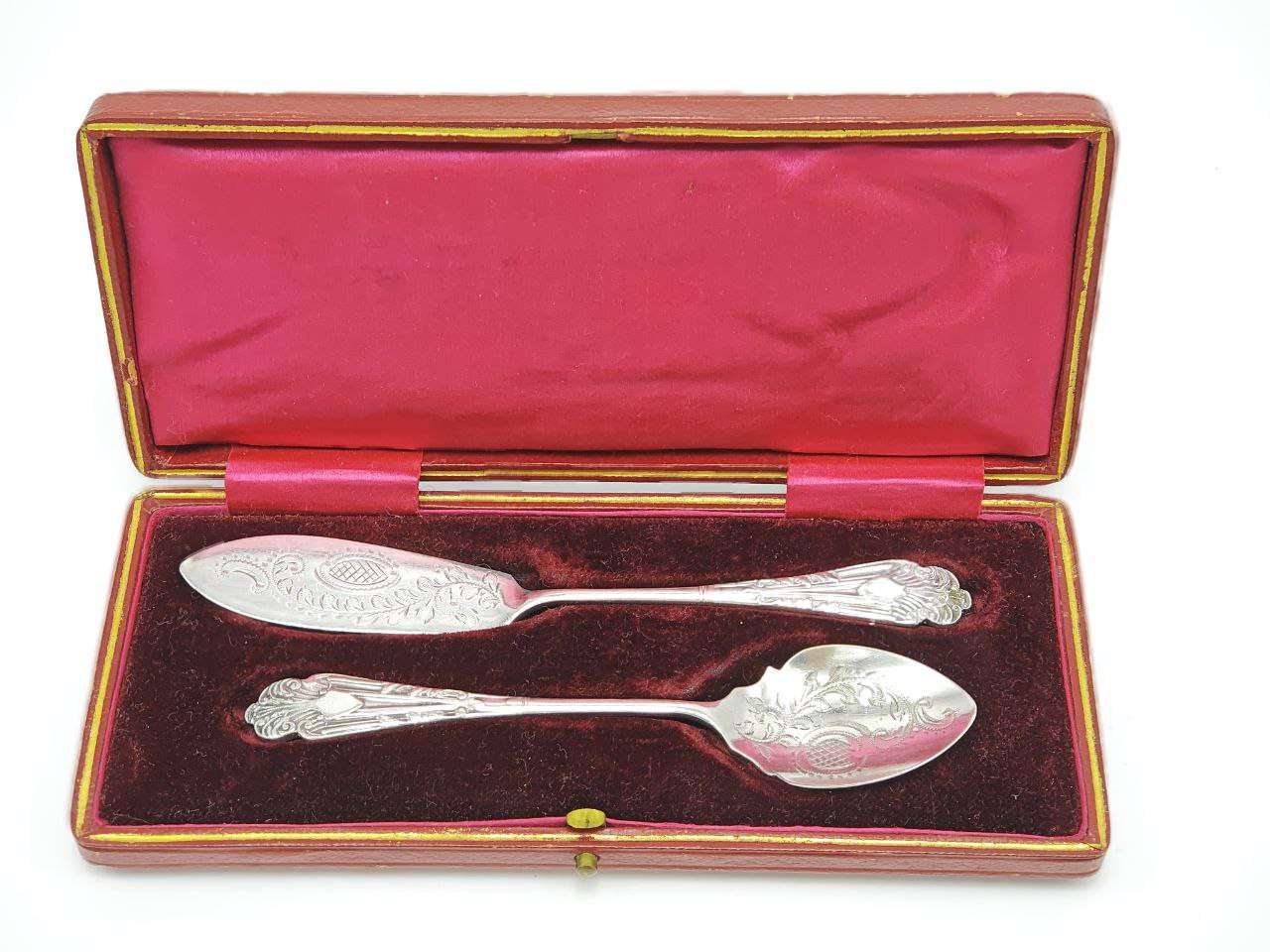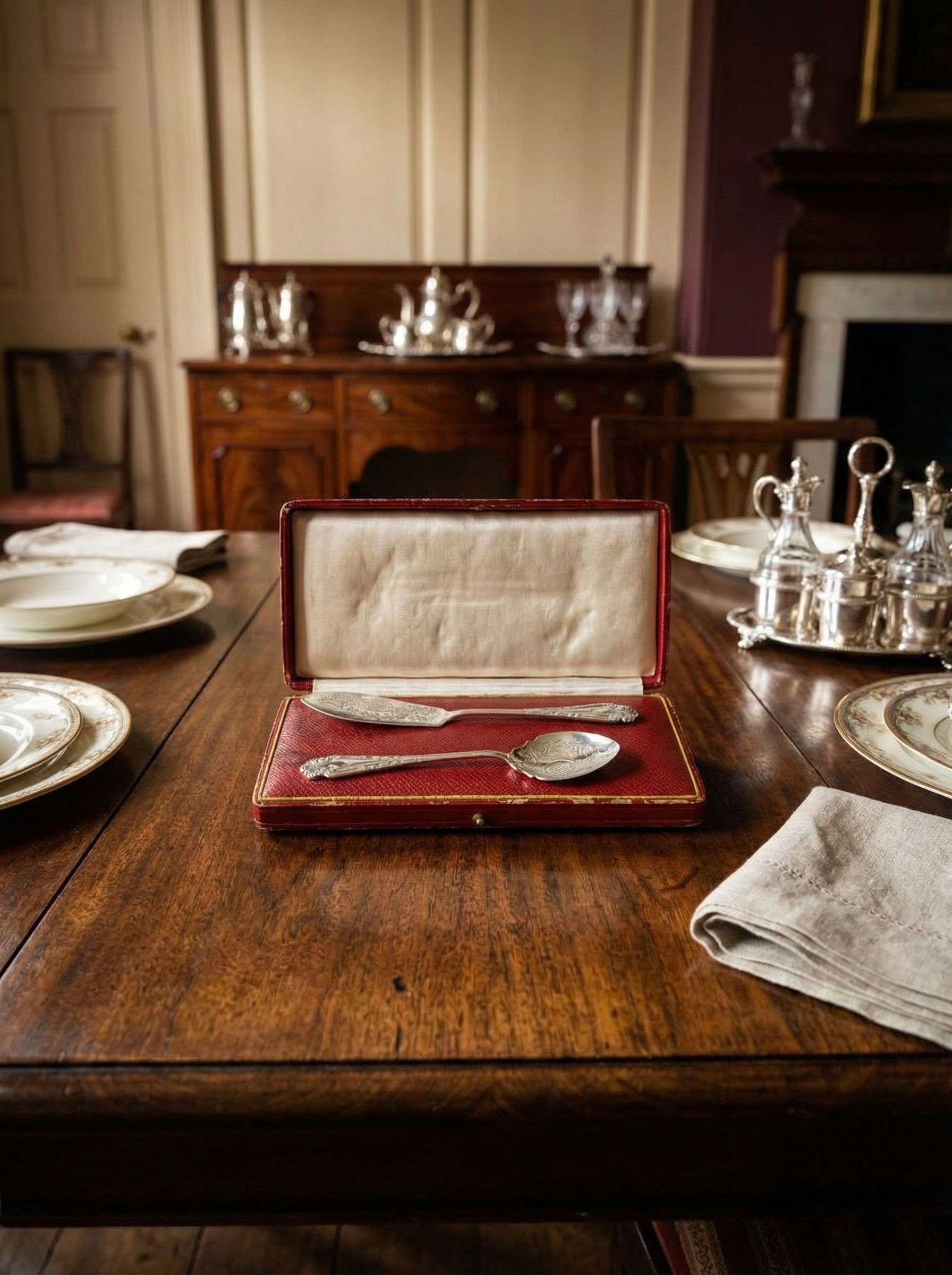 Элегантный сервировочный набор включает нож для масла и ложку для икры, выполненные в классическом английском стиле с растительным орнаментом на ручках. Посеребрённая поверхность красиво отражает свет и подчёркивает рельефный декор, характерный для столовых аксессуаров начала XX века. Набор предназначен для аккуратной подачи масла, паштетов и икры, органично дополняя сервировку стола. Изделия размещены в кожаном футляре с текстильной отделкой, что делает комплект удобным для хранения и подачи. Размеры кейса — 17×7 см, общий вес набора с упаковкой — 130 грамм.