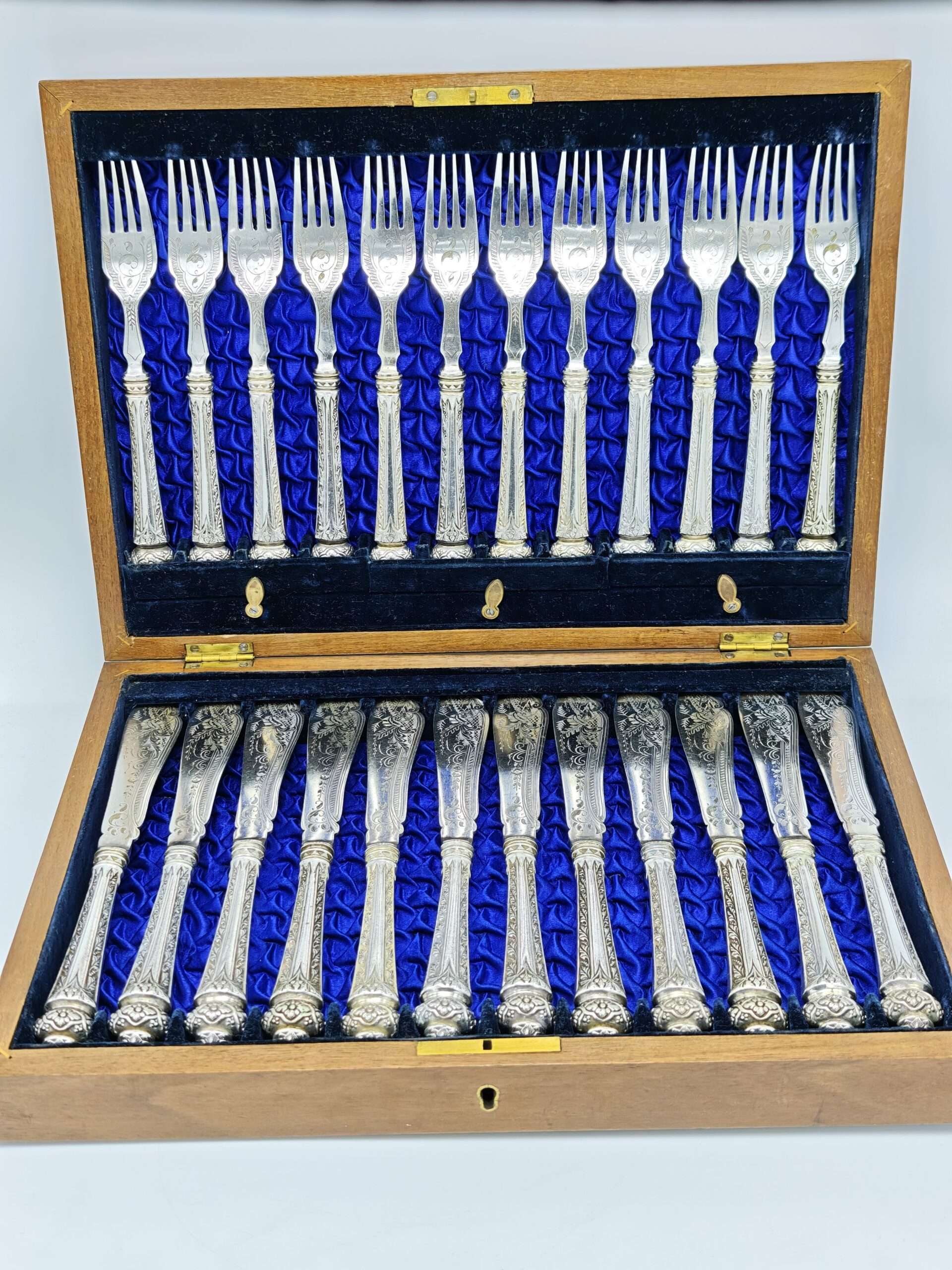 Набор Столовых Приборов для 12 Персон. Ножи и Вилки. Серебрение. Walker & Hall’s. Англия. Деревянный кейс