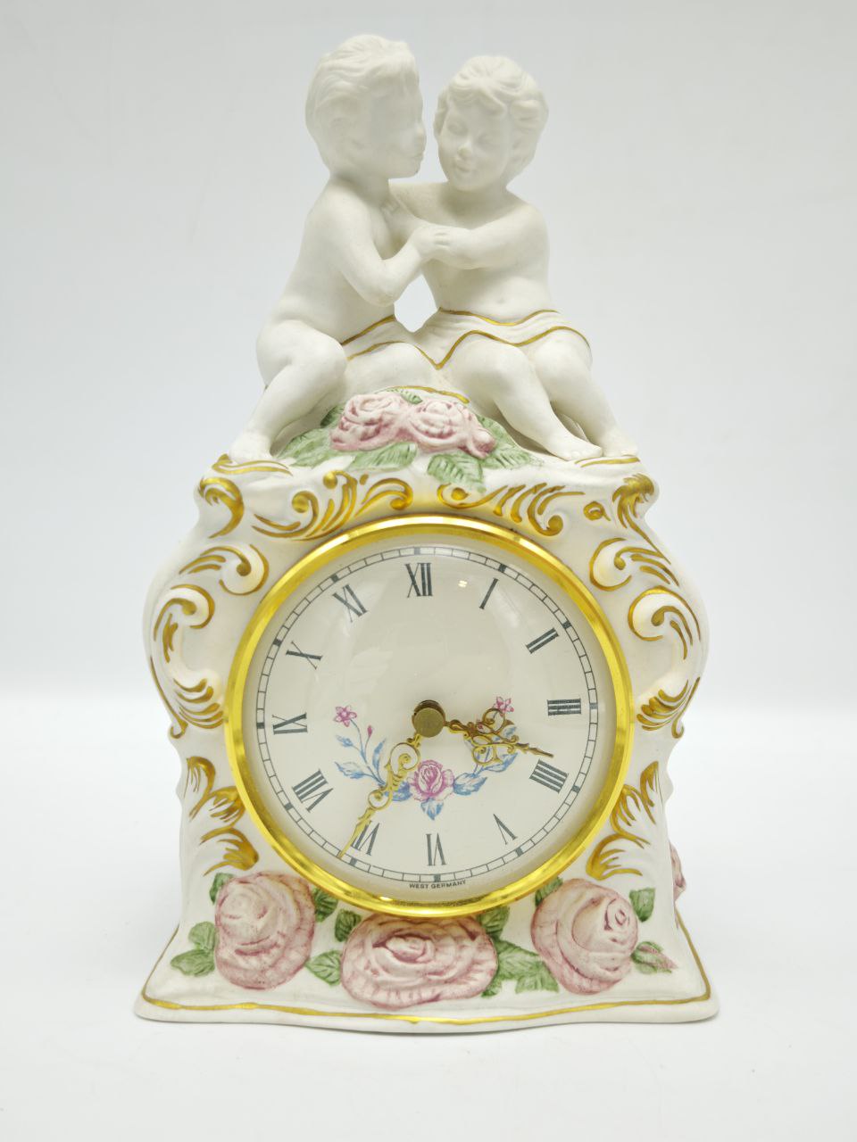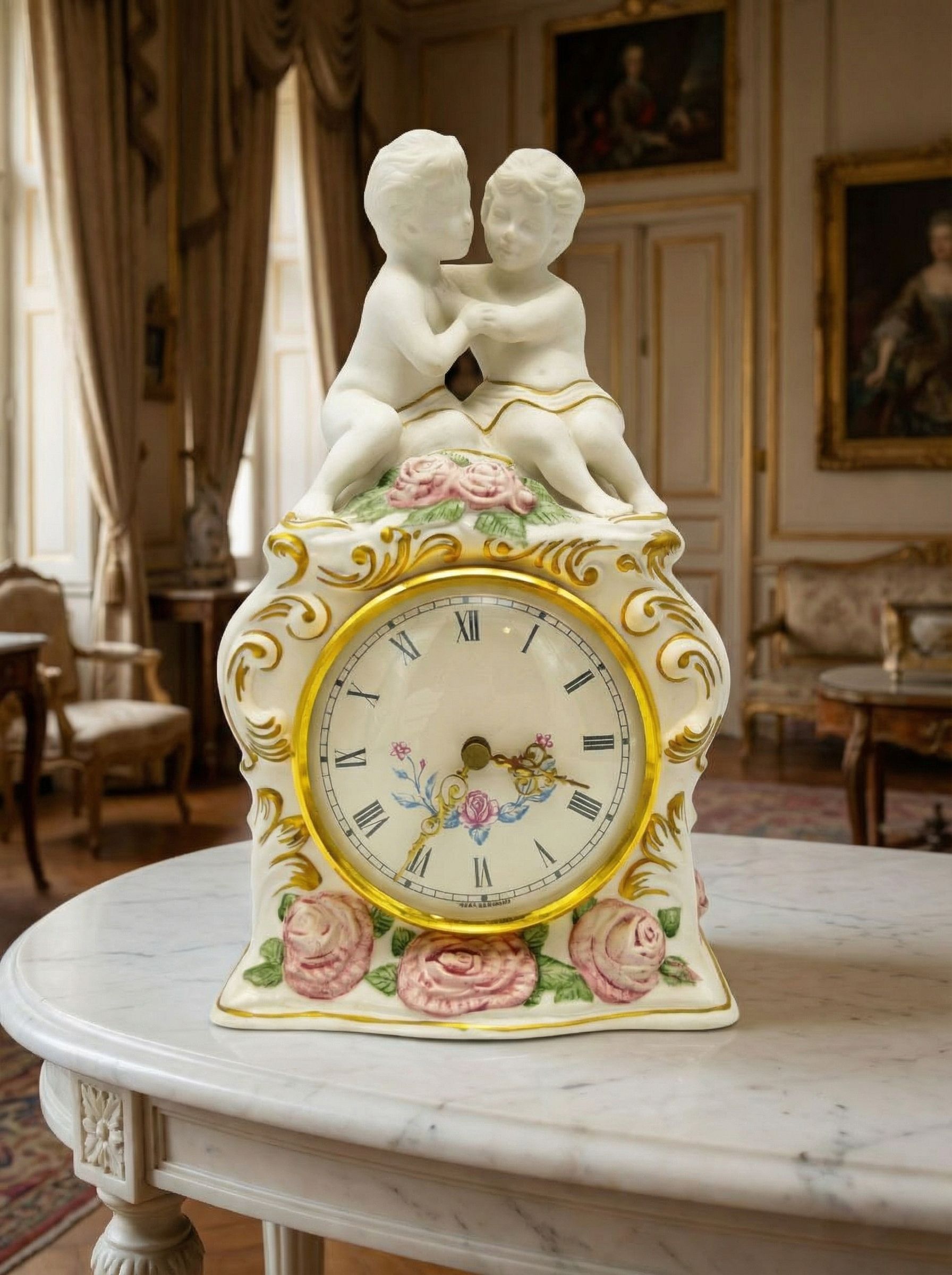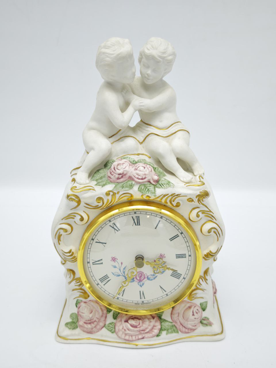 Коллекционные настольные часы из фарфора с ручной росписью, украшенные скульптурной композицией с двумя путти в нежном объятии. Изготовлены в США компанией The Franklin Mint в 1987 году, что подтверждено клеймом на основании. Классическая романтическая стилистика, золочёный декор и цветочные мотивы делают предмет выразительным интерьерным акцентом. Ценный коллекционный объект для любителей фарфора и винтажных часов.