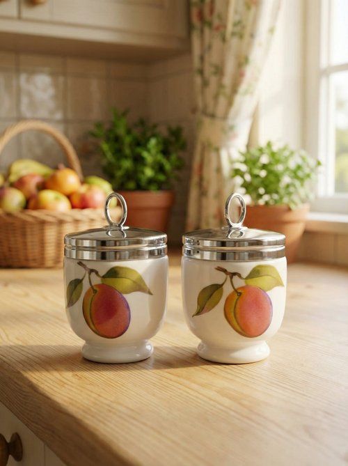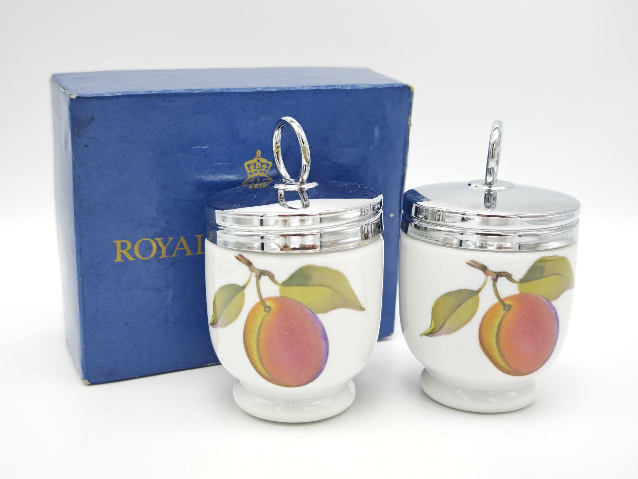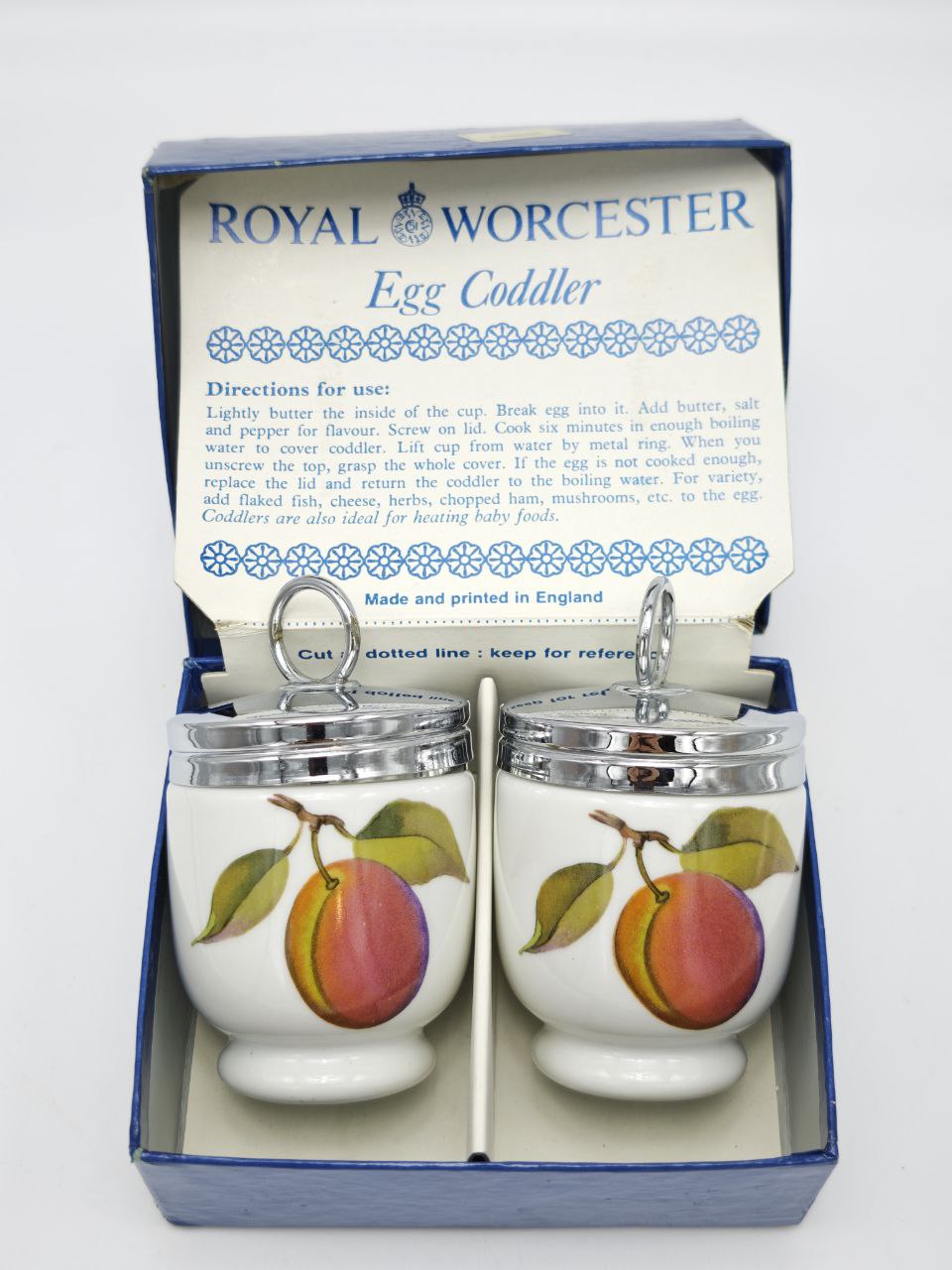 Парные кодлеры Royal Worcester 1985 года производства Англия выполнены из тонкого фарфора с ярким фруктовым декором «Персик». Каждый рассчитан на приготовление одного яйца и оснащён металлической винтовой крышкой с кольцом. В комплекте родная фирменная коробка размером 9×11×4 см, общий вес набора 365 г. Изящная английская классика для утренней сервировки и ценителей фарфора.