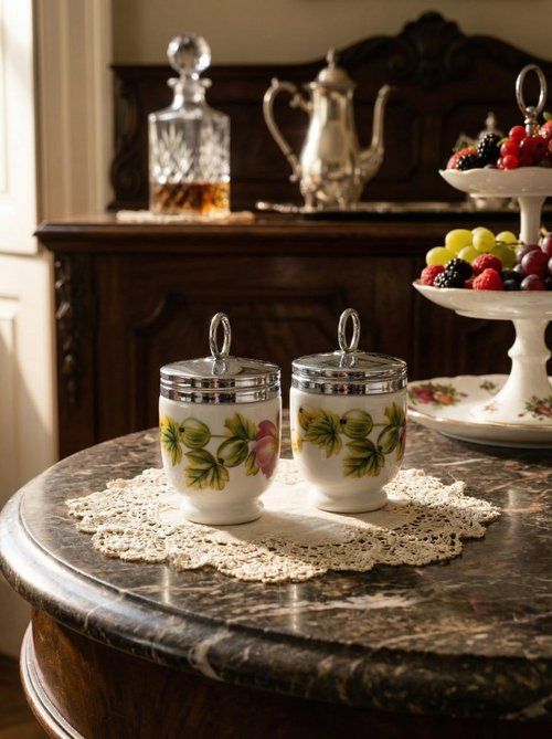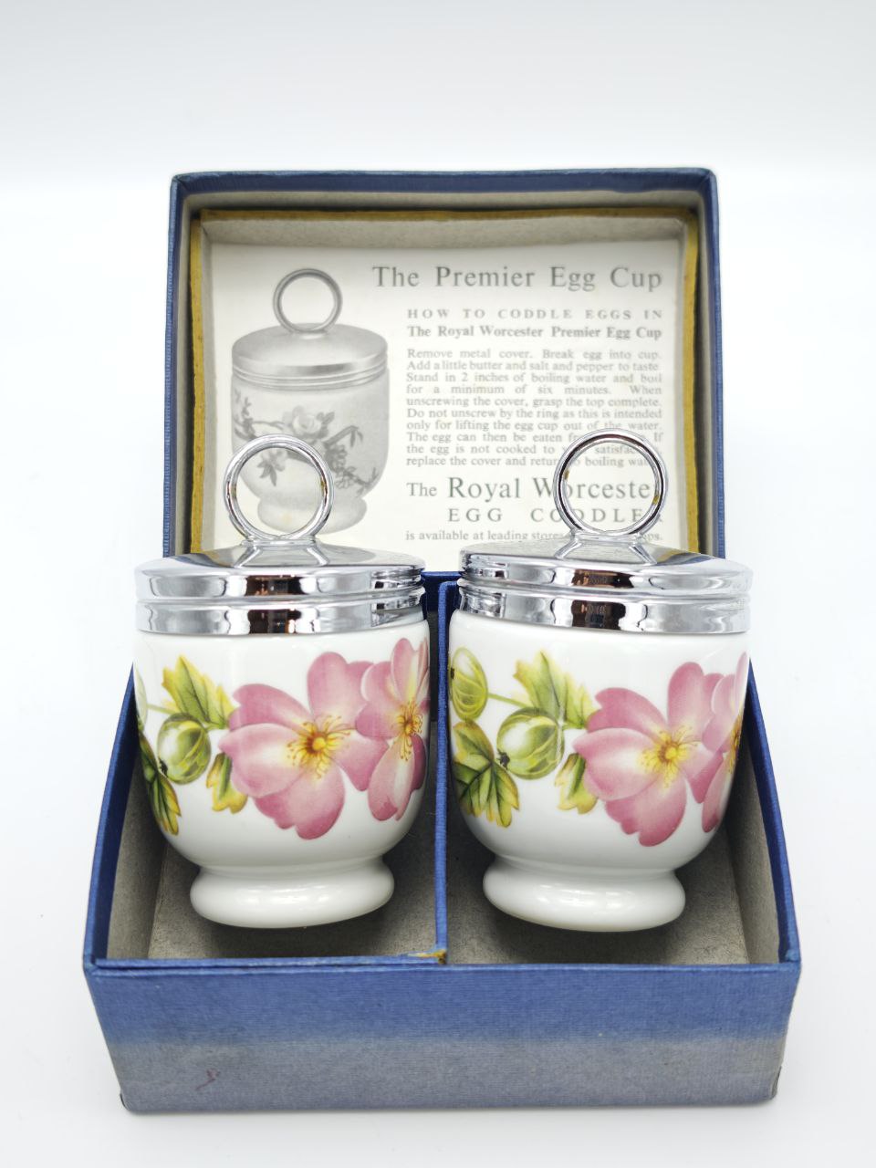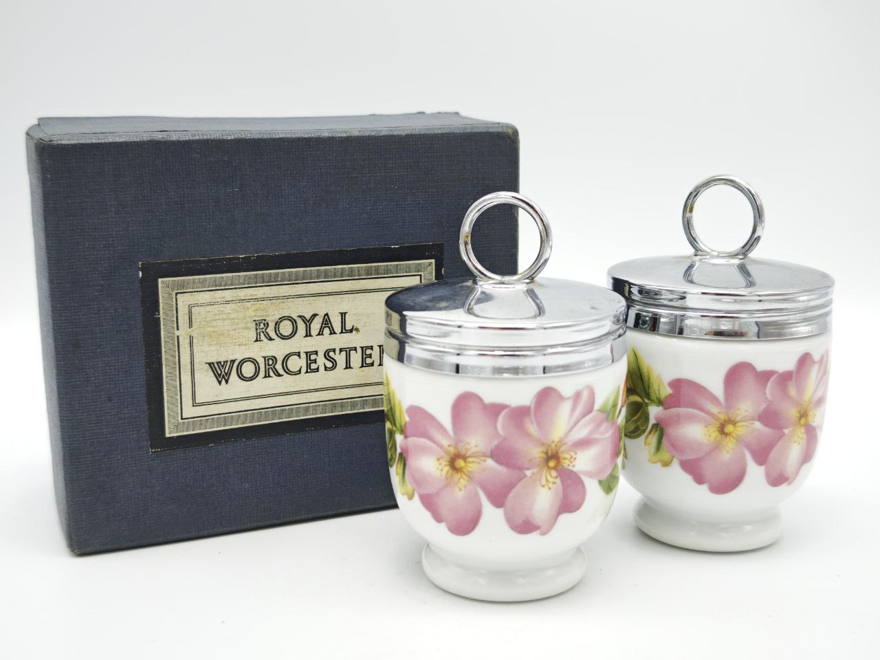 Парные кодлеры Royal Worcester, изготовленные в Англии в 1978 году, предназначены для приготовления одного яйца и позволяют подать завтрак по-английски изящно и аккуратно. Белоснежный фарфор украшен нежным цветочным мотивом с розовыми шиповниками и зелёной листвой, дополненным металлическими крышками с кольцом. Размер коробки 9×11×4 см, общий вес комплекта 365 г. Бренд Royal Worcester традиционно ассоциируется с безупречным английским фарфором и вниманием к деталям.