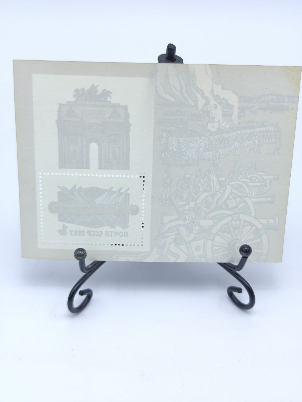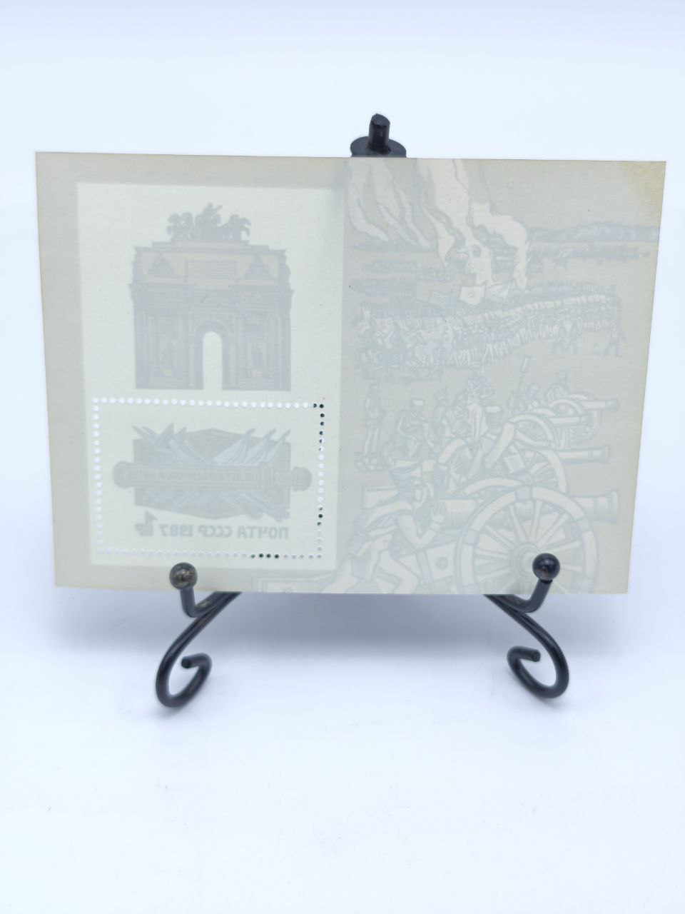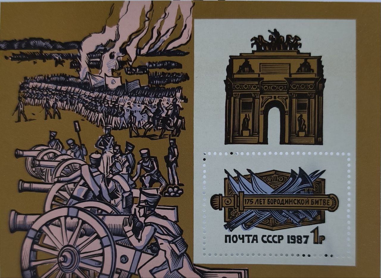 Памятная почтовая марка СССР, выпущенная в 1987 году к 175-летию Бородинской битвы. На марке изображены символы военной славы и Триумфальная арка, созданная в честь победы в Отечественной войне 1812 года. Экземпляр сохранил отличную коллекционную ценность и представляет интерес для филателистов, историков и ценителей советской графики.