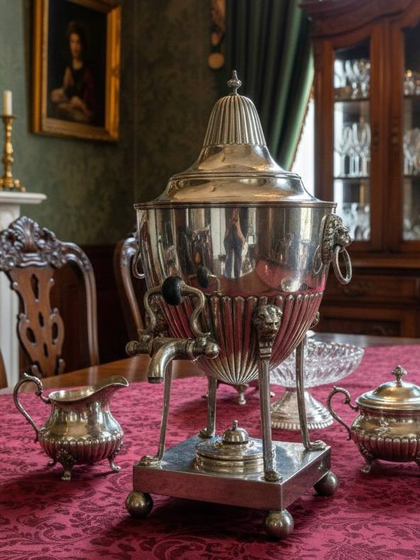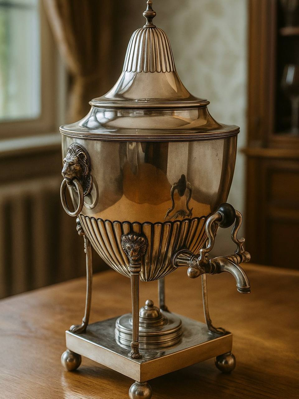 Погрузитесь в атмосферу утончённой изысканности с нашим самоваром, который станет не просто отличным дополнением к вашему интерьеру, а настоящей его жемчужиной. Этот самовар уникален своей элегантной конструкцией, где медь, мастерски покрытая серебрением, создает гармоничное сочетание классической стойкости и современного блеска. Львиные головы, украшающие его крепления, придают изделию величественный и роскошный вид.Наш самовар воплощает в себе традиции русской чайной церемонии, которые бережно хранятся и передаются из поколения в поколение. Каждая деталь изделия тщательно проработана: от изящного носика, исполненного с точностью мастера, до грамотной сборки ножек, обеспечивающих надежную устойчивость. Будьте уверены, что ваш напиток будет сохранять свою температуру благодаря продуманной конструкции, а насыщенный вкус чая поможет вам снять усталость и получить истинное удовольствие.Особое внимание заслуживает игра света и теней, рождающаяся благодаря серебрению, что делает этот самовар центральным элементом любой столовой или кухни. Львиные головы, символизирующие силу и гордость, воодушевляют, создают ощущение благородства и вызывают невольный восторг.Наличие артистического оформления и использования материалов высочайшего качества позволяет вам смело демонстрировать этот самовар как на семейных ужинах, так и на торжественных приёмах. Покажите гостям своё безупречное чувство стиля и уважение к вековым традициям, подарив им уникальный опыт именно с нашим самоваром.Инвестируйте в этот шедевр искусства, который будет радовать вас и ваших близких многие годы, сохраняя при этом уникальность и эстетическую ценность.