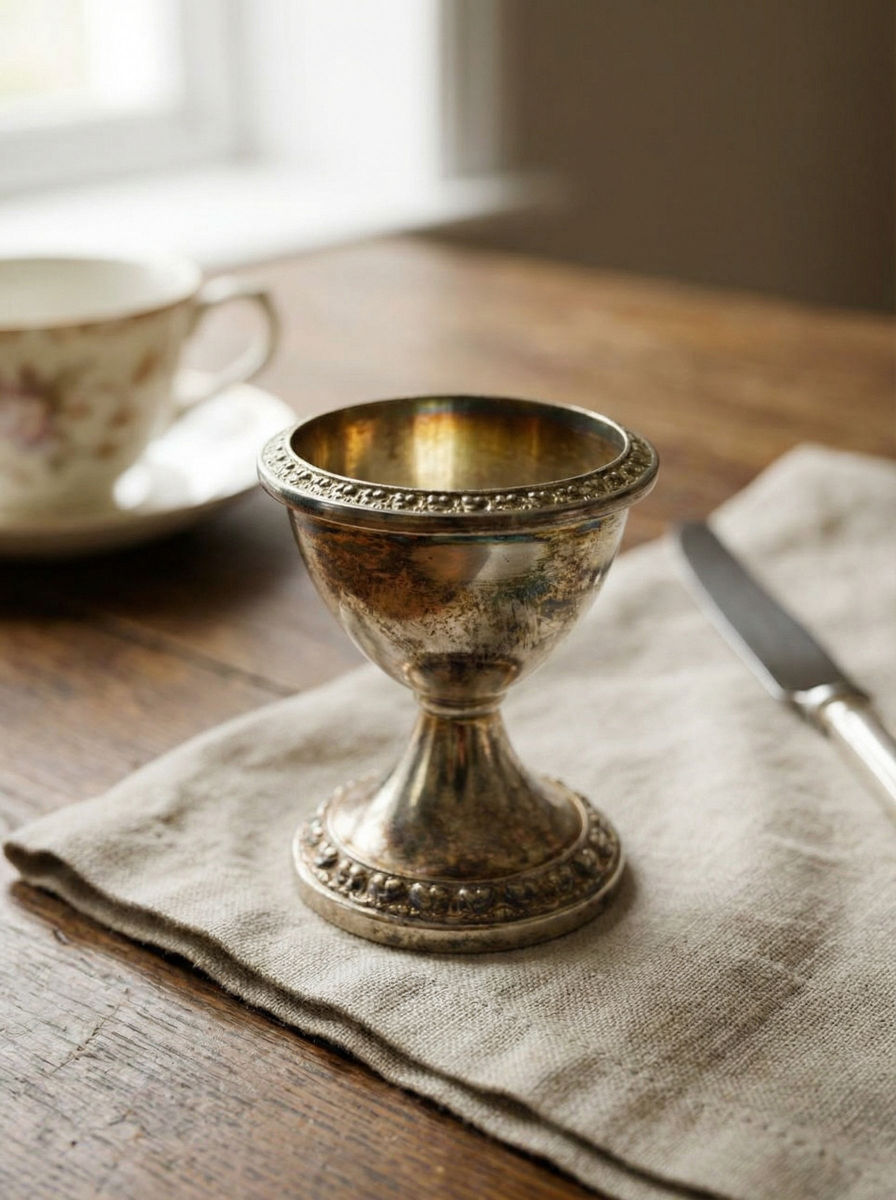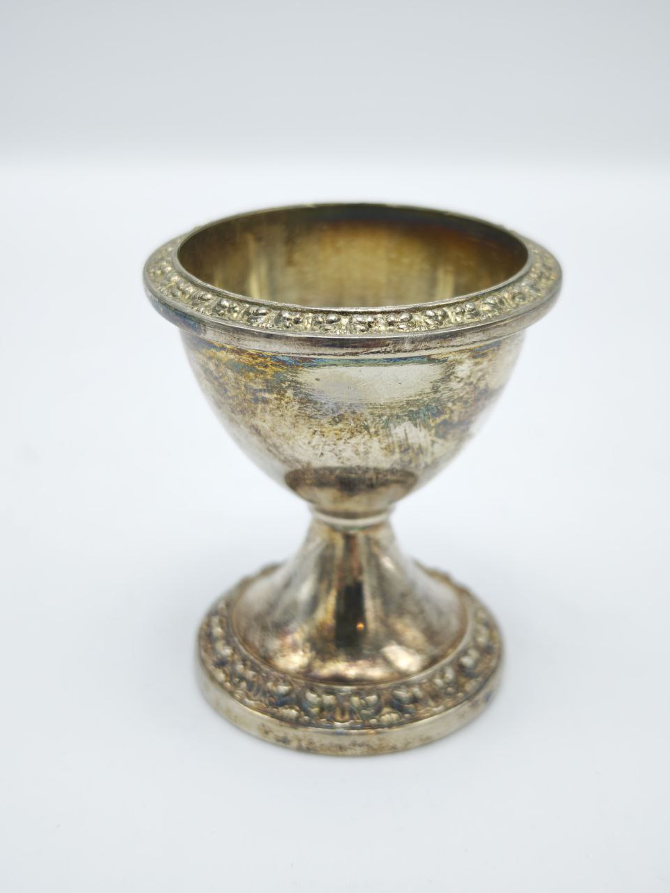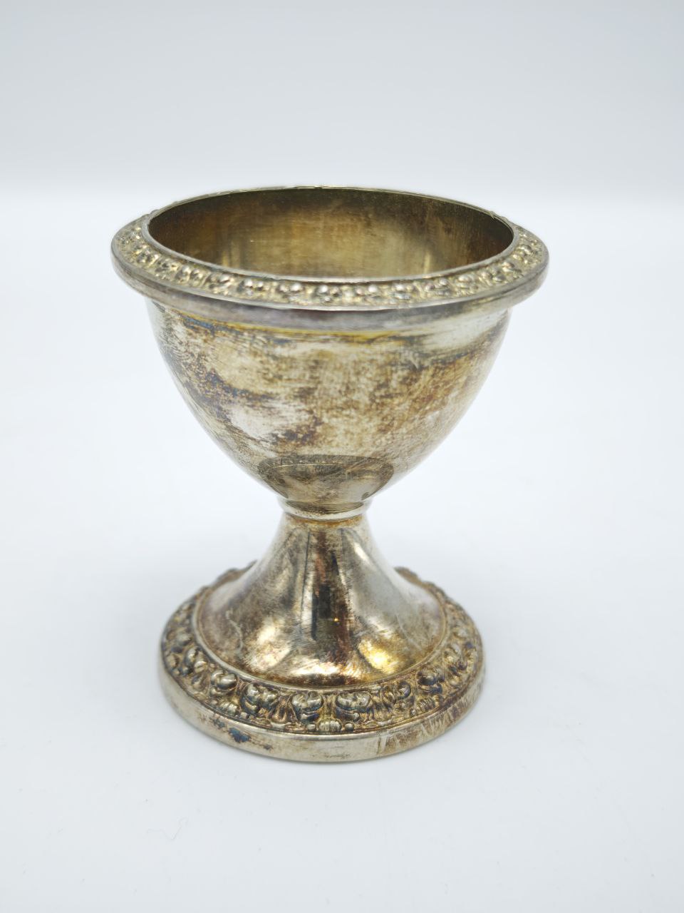 Изящная винтажная подставка под яйцо с серебрением, выполненная в классической форме с декоративным орнаментом по краю. Благородная патина подчёркивает возраст и аутентичность предмета, создавая ощущение подлинного антикварного стиля. Предназначена для сервировки яиц всмятку или пашот, а также может использоваться как декоративный элемент стола. Элегантный аксессуар для ценителей винтажа и красивых завтраков.