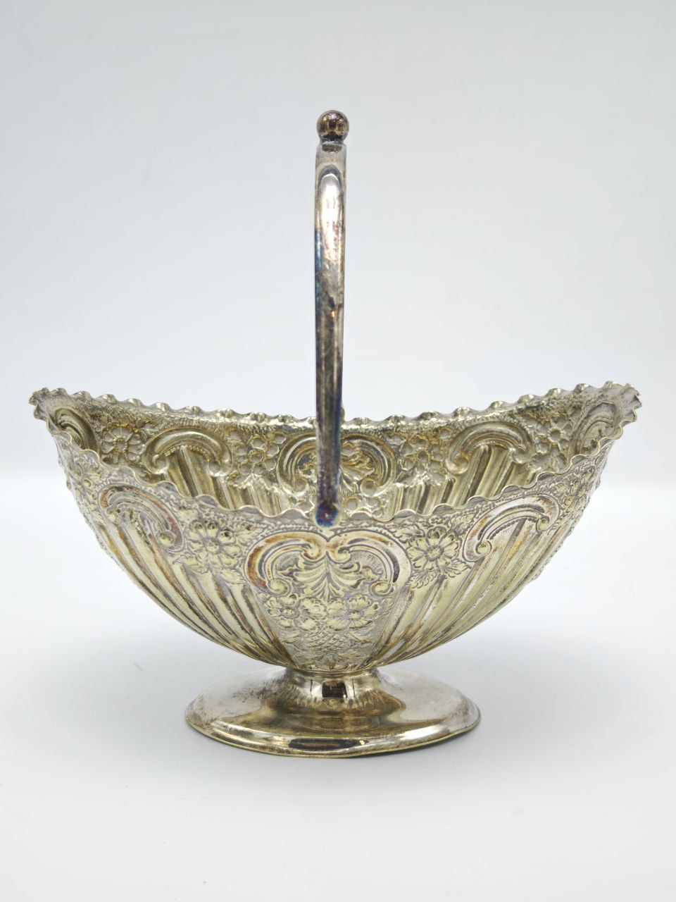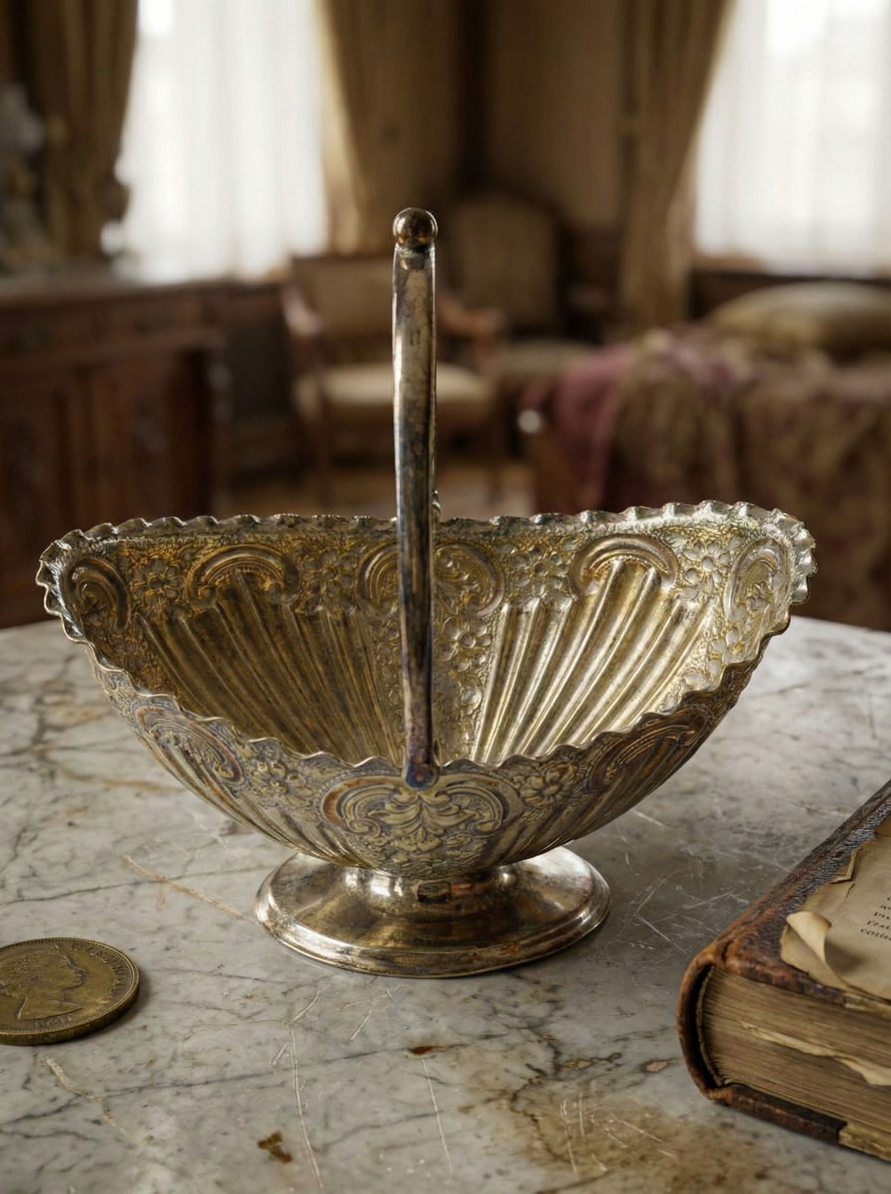 Изящная посеребрённая вазочка-корзинка с богатым рельефным орнаментом в классическом европейском стиле. Предмет сочетает в себе декоративность и утилитарность: может использоваться для сервировки, сладостей или как интерьерный акцент. Тонкая проработка узоров и благородная патина подчёркивают возраст и подлинность вещи. Антикварный объект, который гармонично дополнит коллекцию или станет статусным подарком.